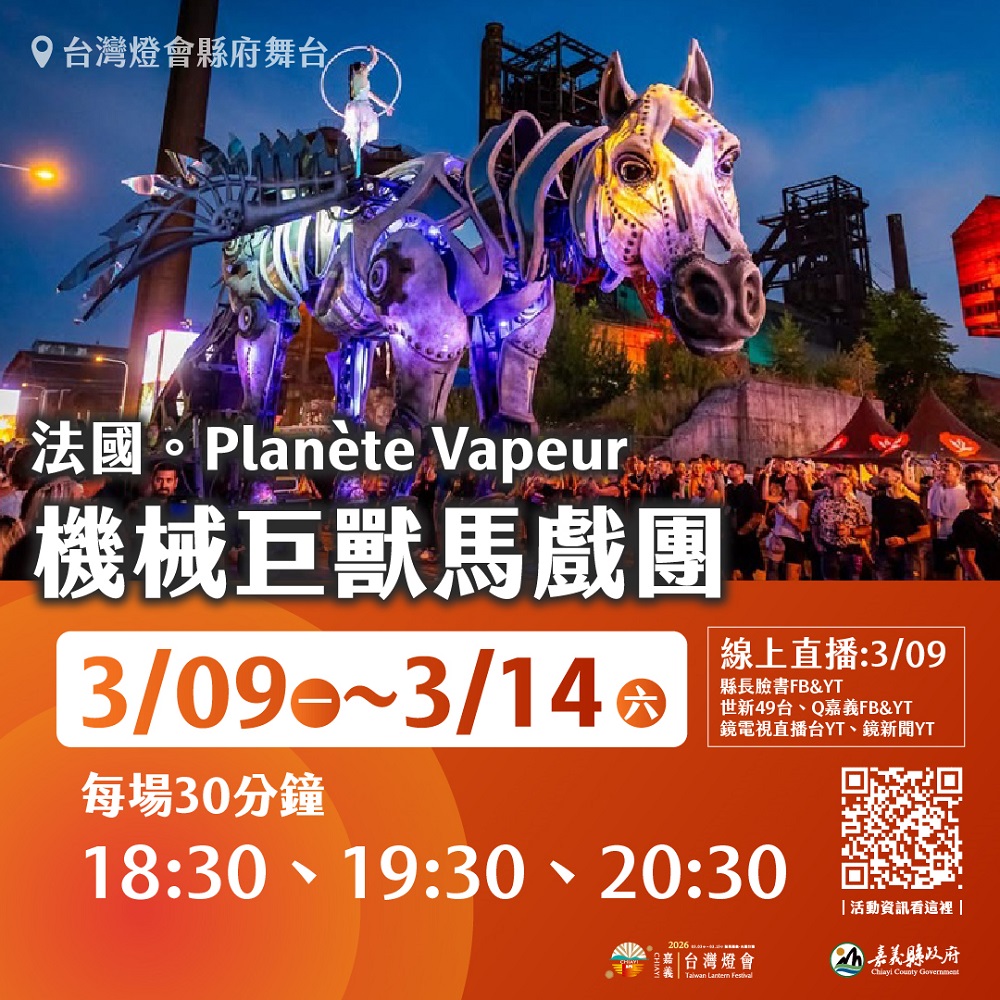 The mechanical art circus troupe Planète Vapeur from France is set to make a stunning appearance at the 2026 Taiwan Lantern Festival, bringing its signature work, the Flying White Horse Show, to Chiayi for the first time. Featuring a massive mechanical installation combined with contemporary circus vocabulary, live music, and light‑and‑sound technology, the performance unveils a grand and fantastical artistic spectacle against the city’s night sky.