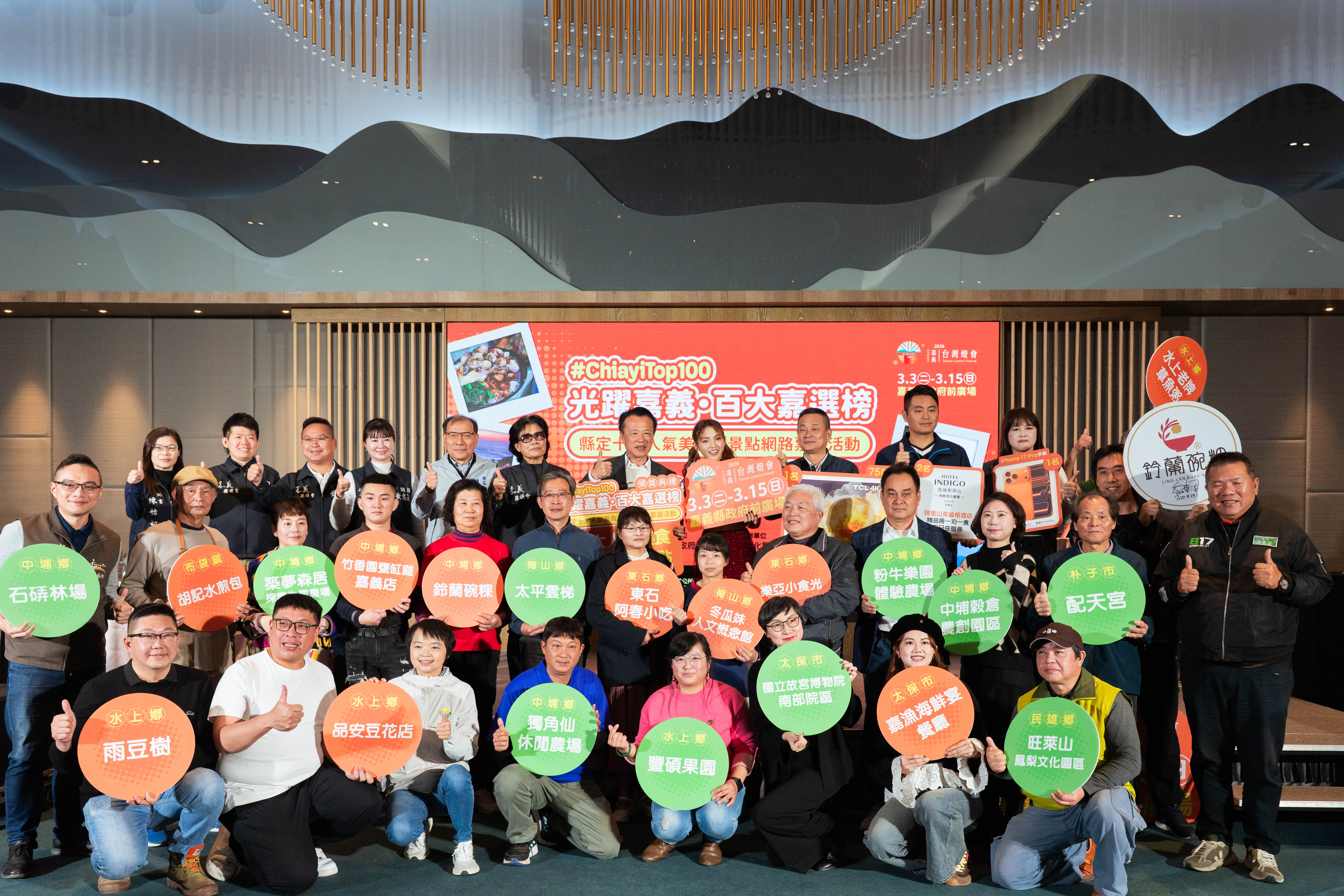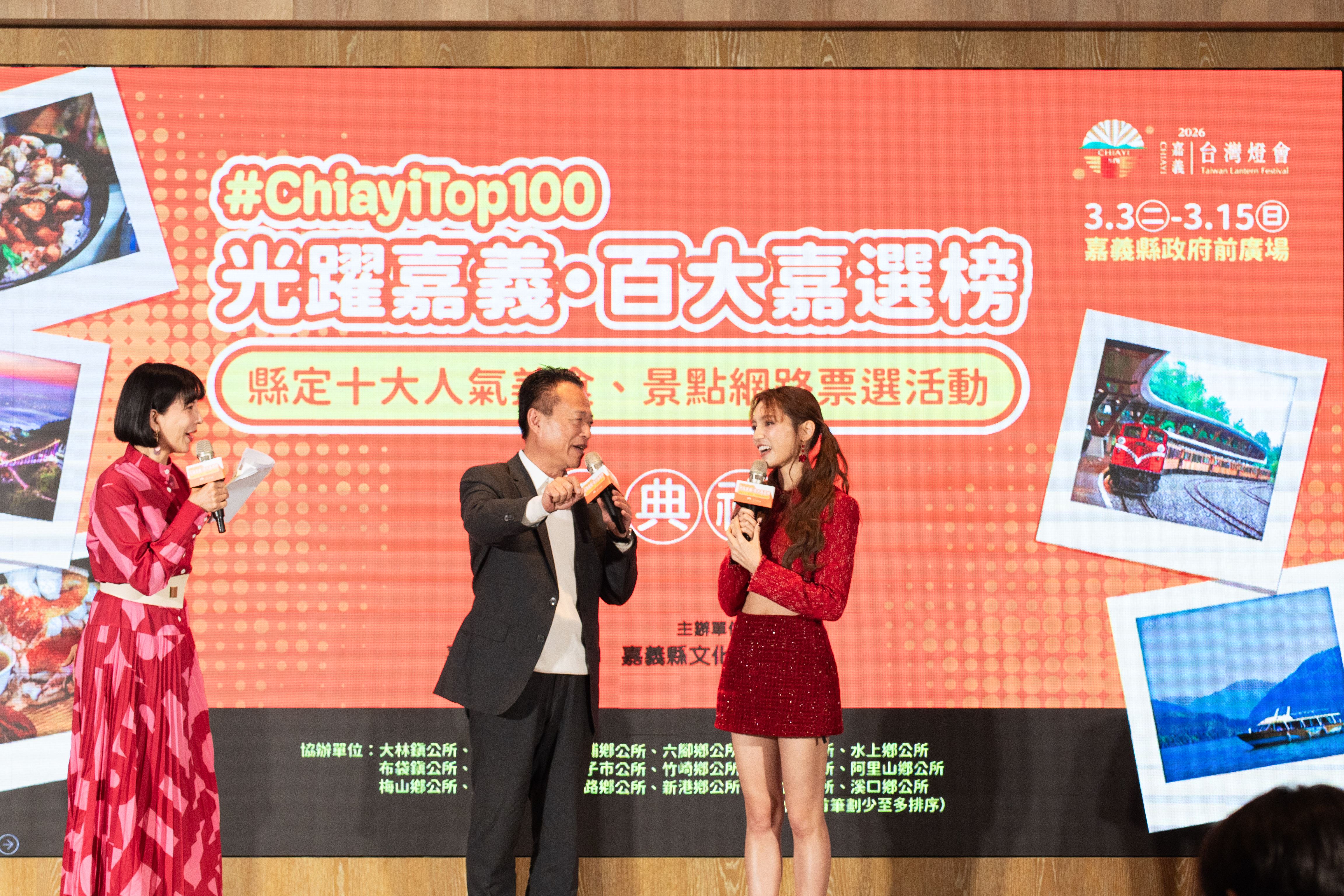 「光躍嘉義‧百大嘉選榜」網路票選活動結果出爐,縣府今9日在長榮文苑酒店舉辦頒獎典禮,由縣長翁章梁親自表揚「10大人氣美食」與「10大人氣景點」,並邀請活動代言人朵拉(Dora)與現場來賓一同見證榮耀榜單。
