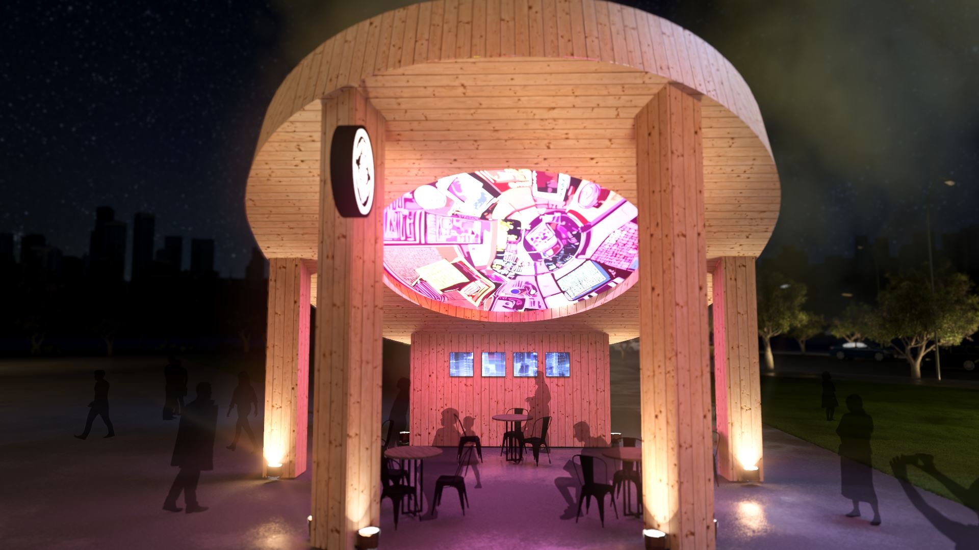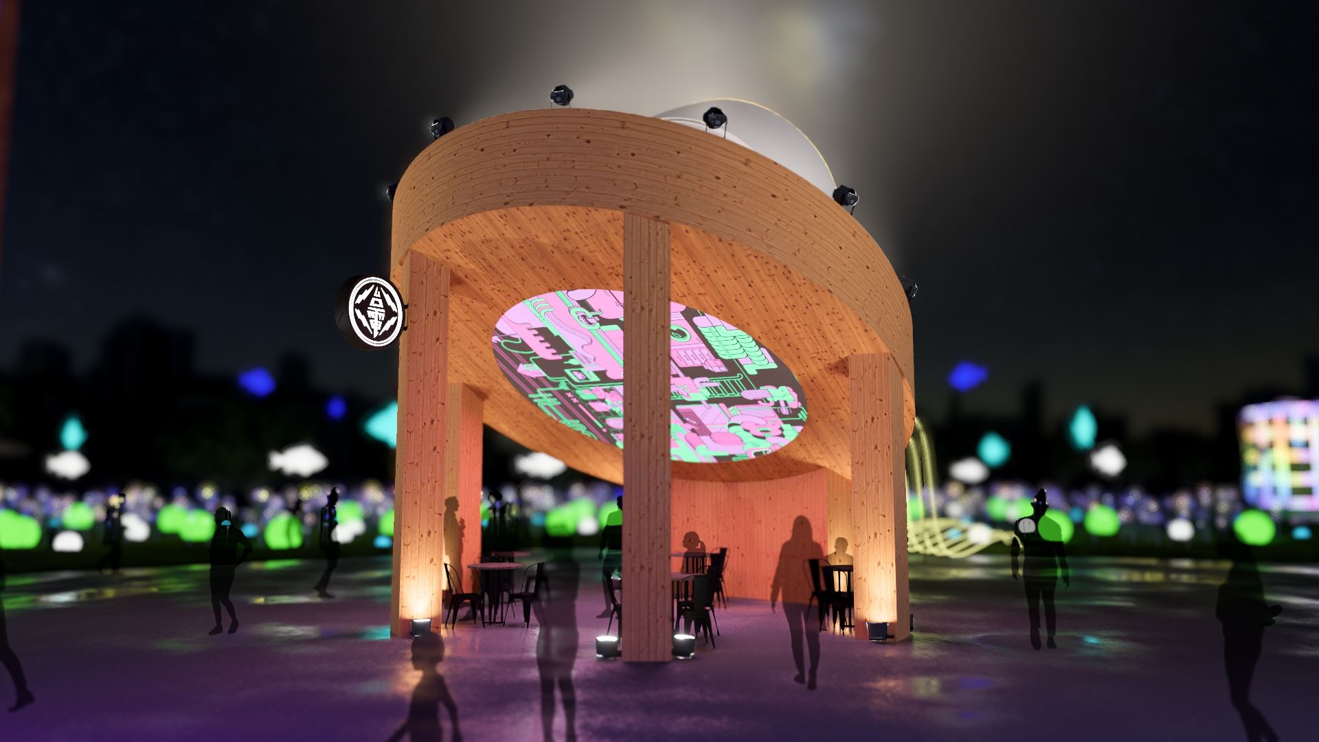 城市暖光咖啡館將「能源與生活」作為設計主軸,透過圓形建築與流動光線呈現電力循環意象;夜間燈光由上而下緩緩展開,象徵能源流動與延續,讓抽象的能源議題更容易被理解。