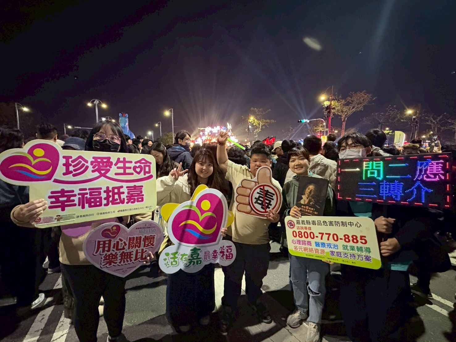 衛生局長趙紋華表示,心理健康是全民共同責任,需要家庭、社區與政府攜手合作,期盼藉由燈會高人氣平台,傳遞溫暖人心的健康行動,民眾如有心理壓力或情緒困擾,可撥打1925安心專線(依舊愛我),或洽嘉義縣社區心理衛生中心諮詢專線(05)362-1150,由專人提供諮詢與轉介服務。