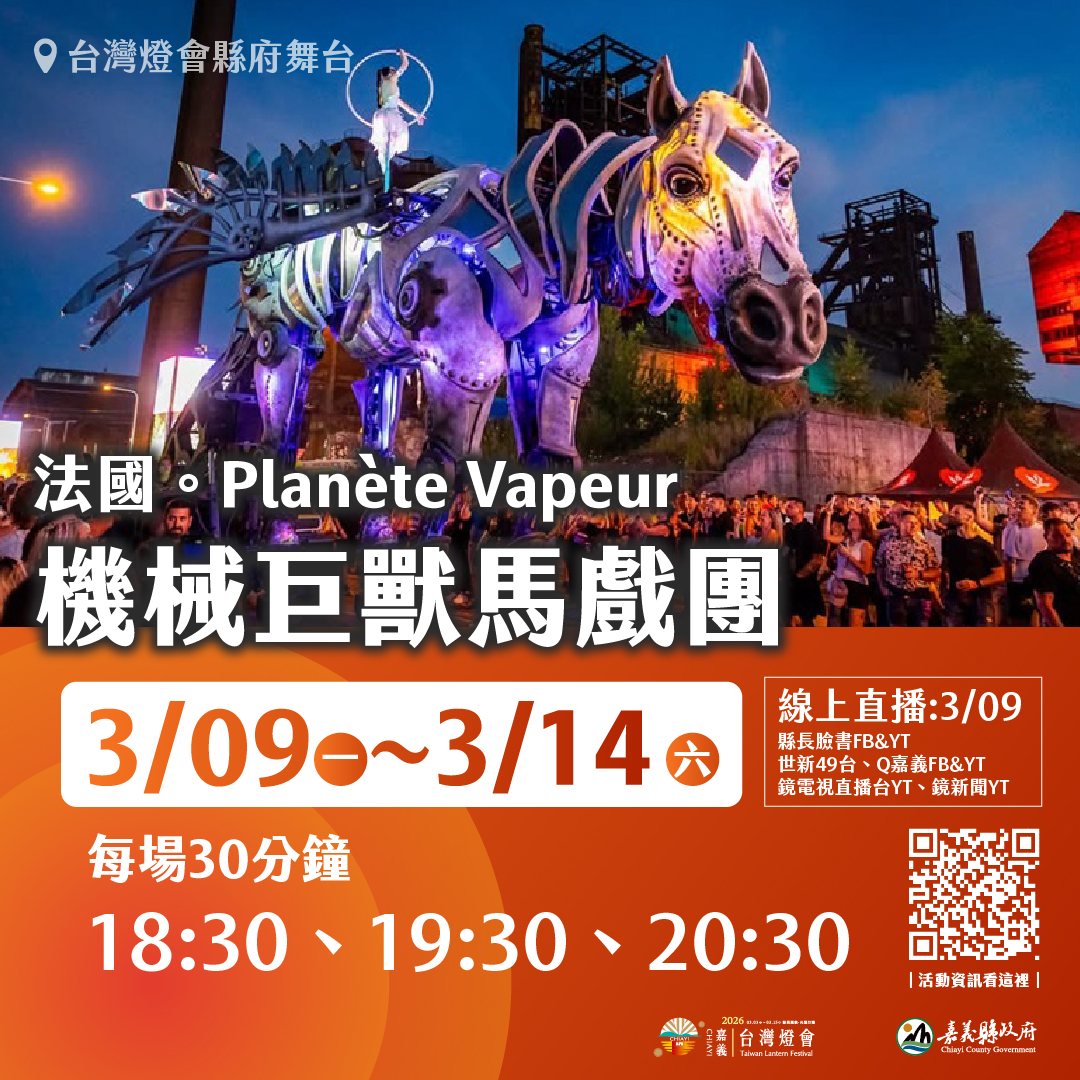 來自法國的機械藝術馬戲團 Planète Vapeur 即將在2026台灣燈會震撼登場,攜代表作「飛天白馬秀」首度於嘉義亮相,以巨型機械裝置結合當代馬戲語彙、現場音樂與聲光科技,為城市夜空揭開壯闊而奇幻的藝術序幕。