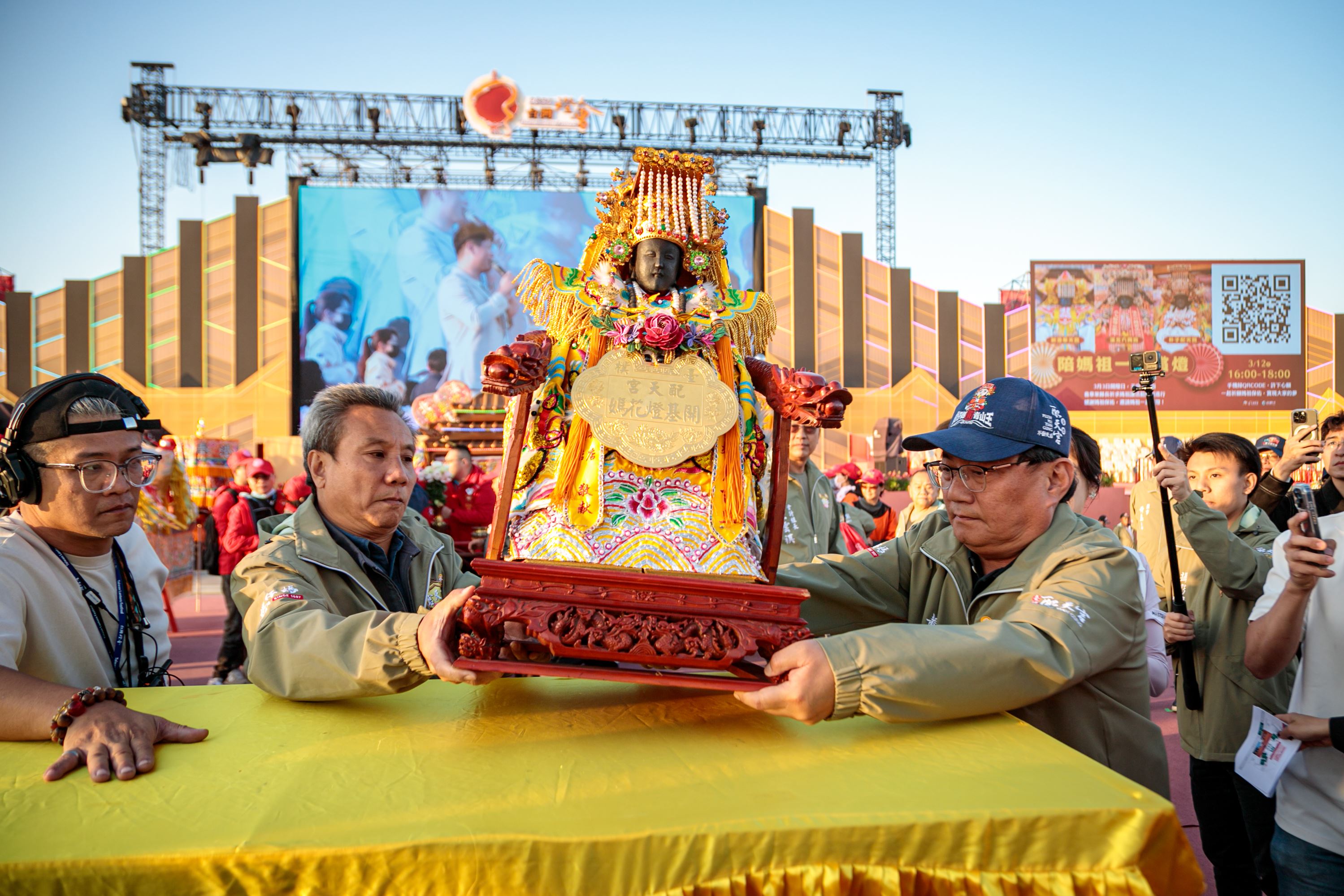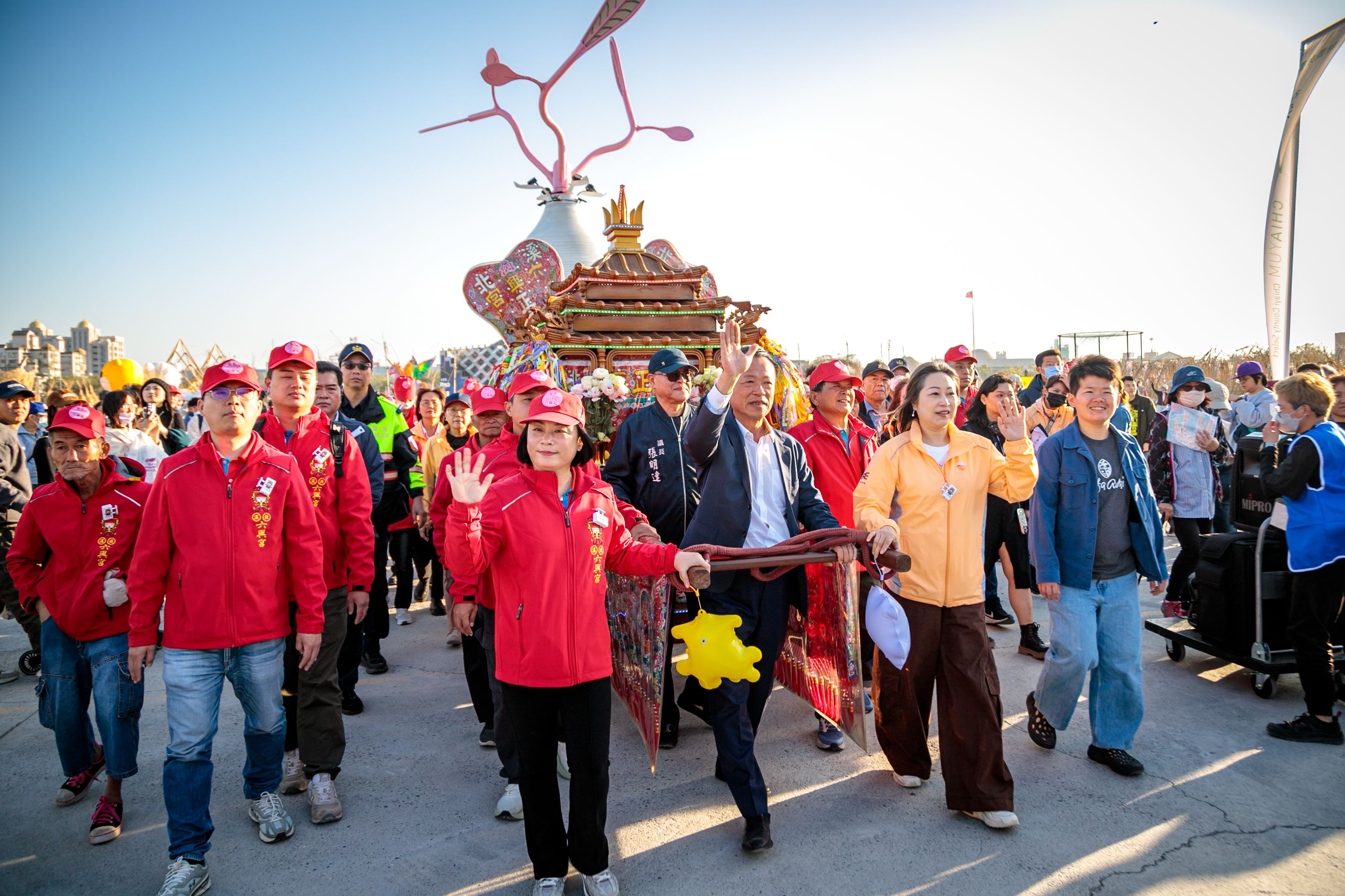 翁縣長偕夫人劉莉英、觀光署長陳玉秀、立委蔡易餘、陳冠廷、議長張明達、副議長陳怡岳、奉天宮董事長何達煌、配天宮董事長蔡承宗、六興宮主委江筱芃,以及地方各級民代,見證三位媽祖安座、世紀同框的時刻。