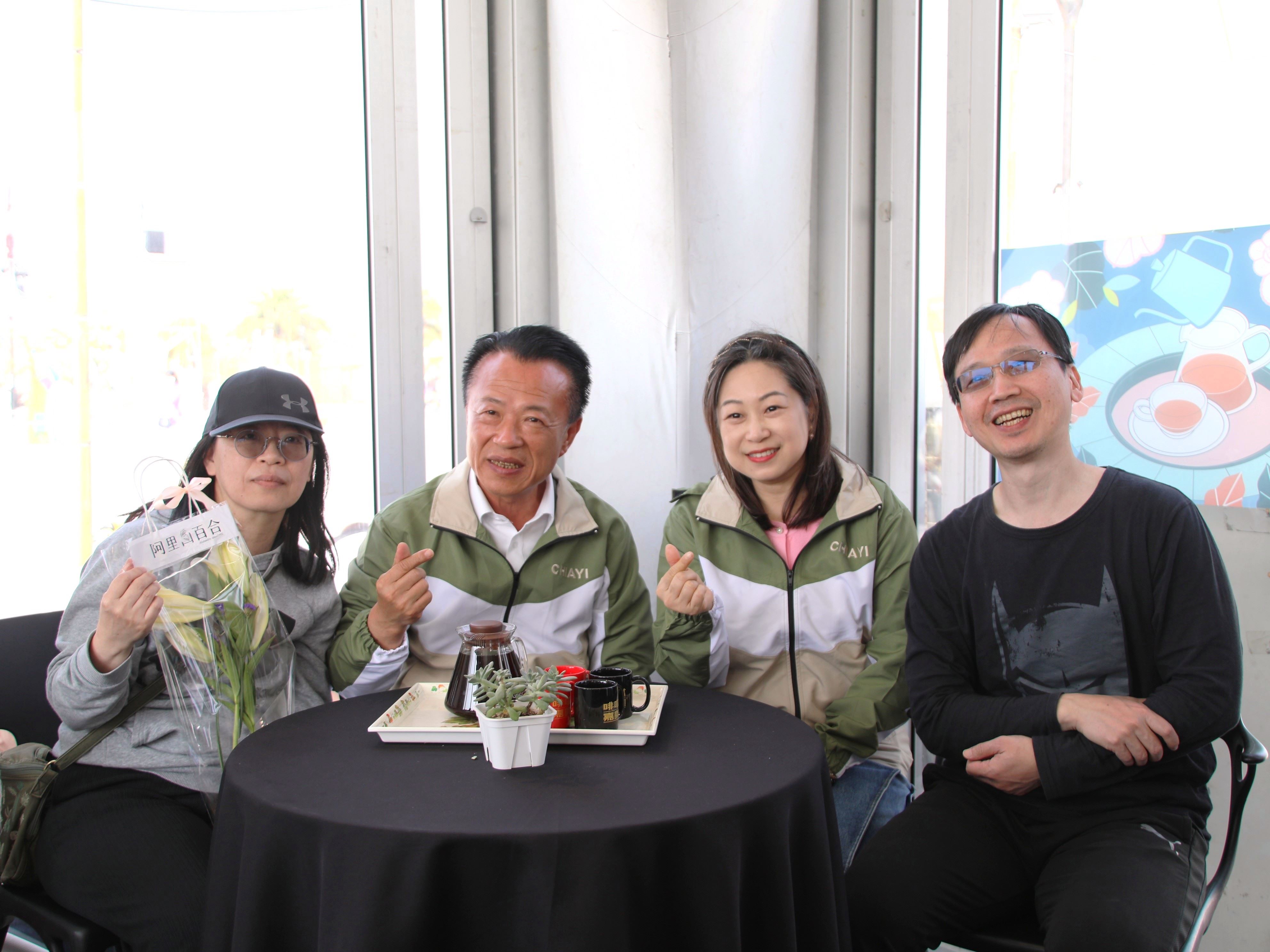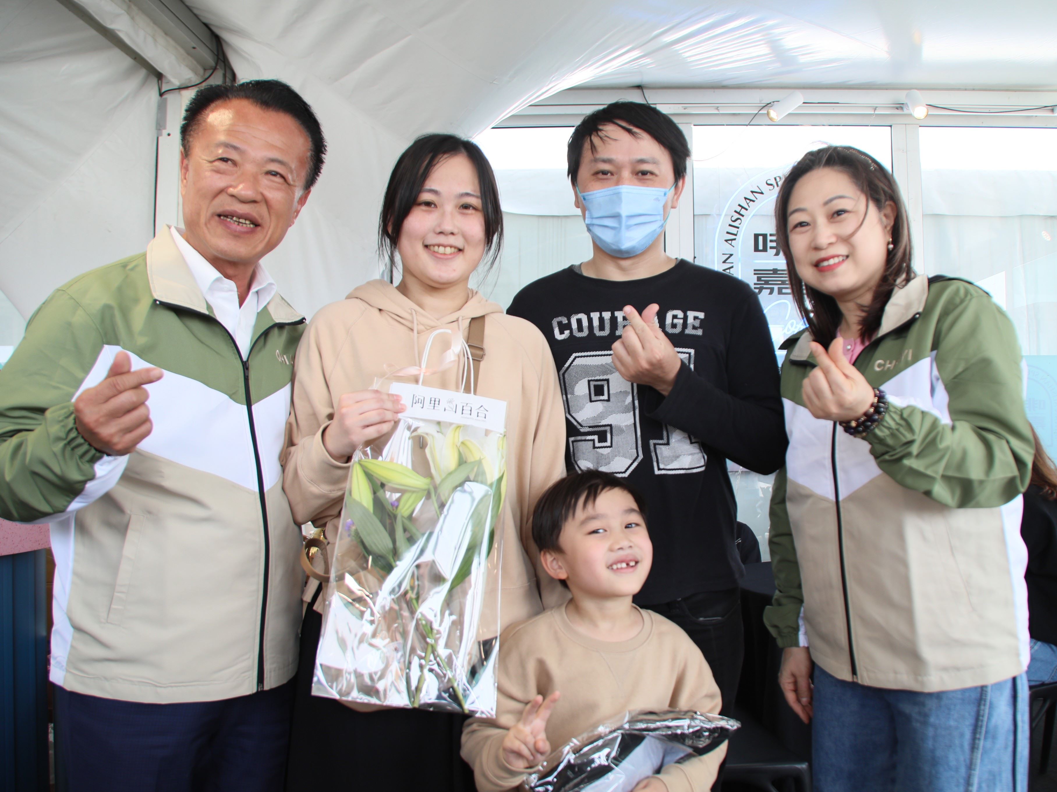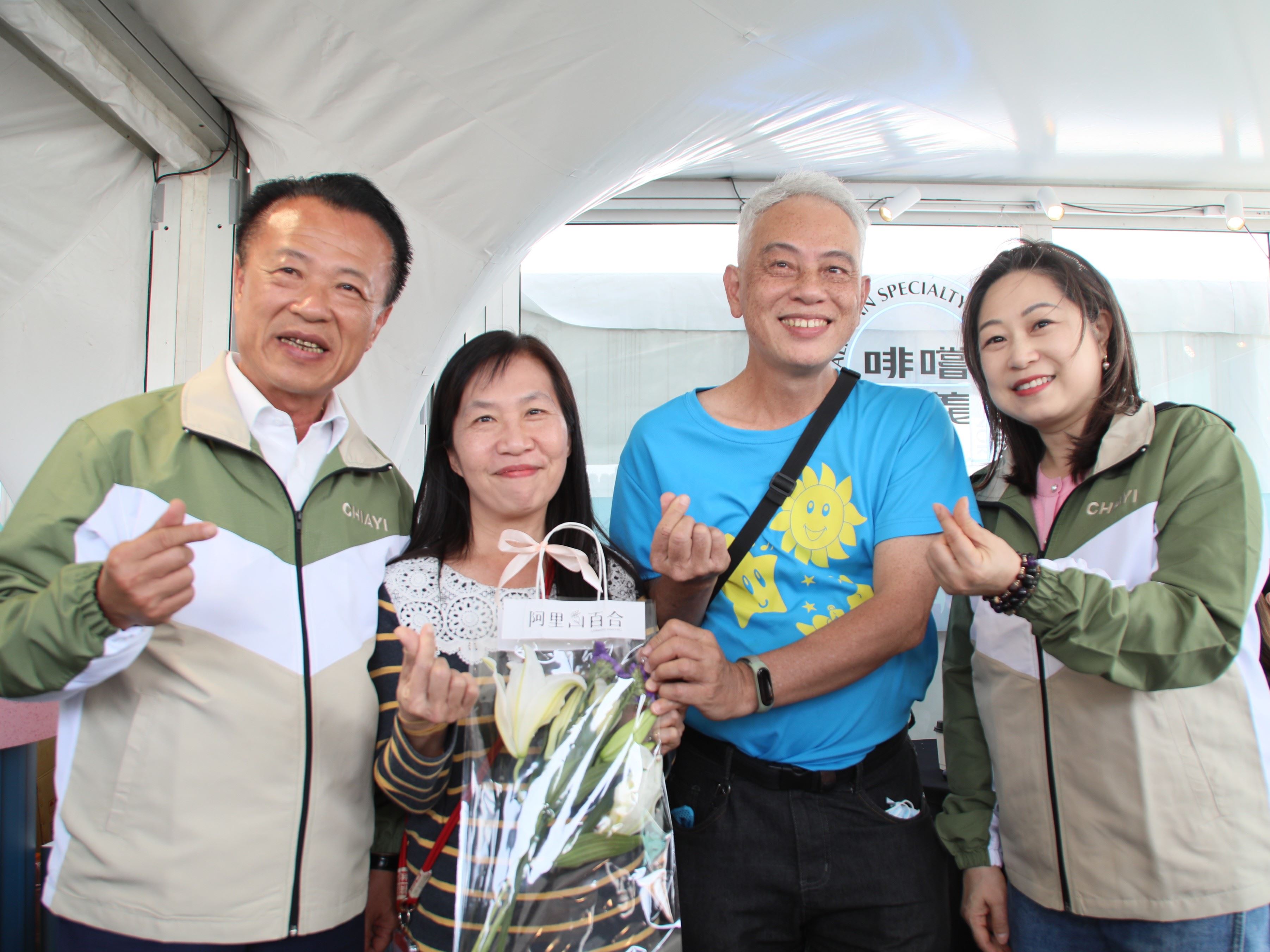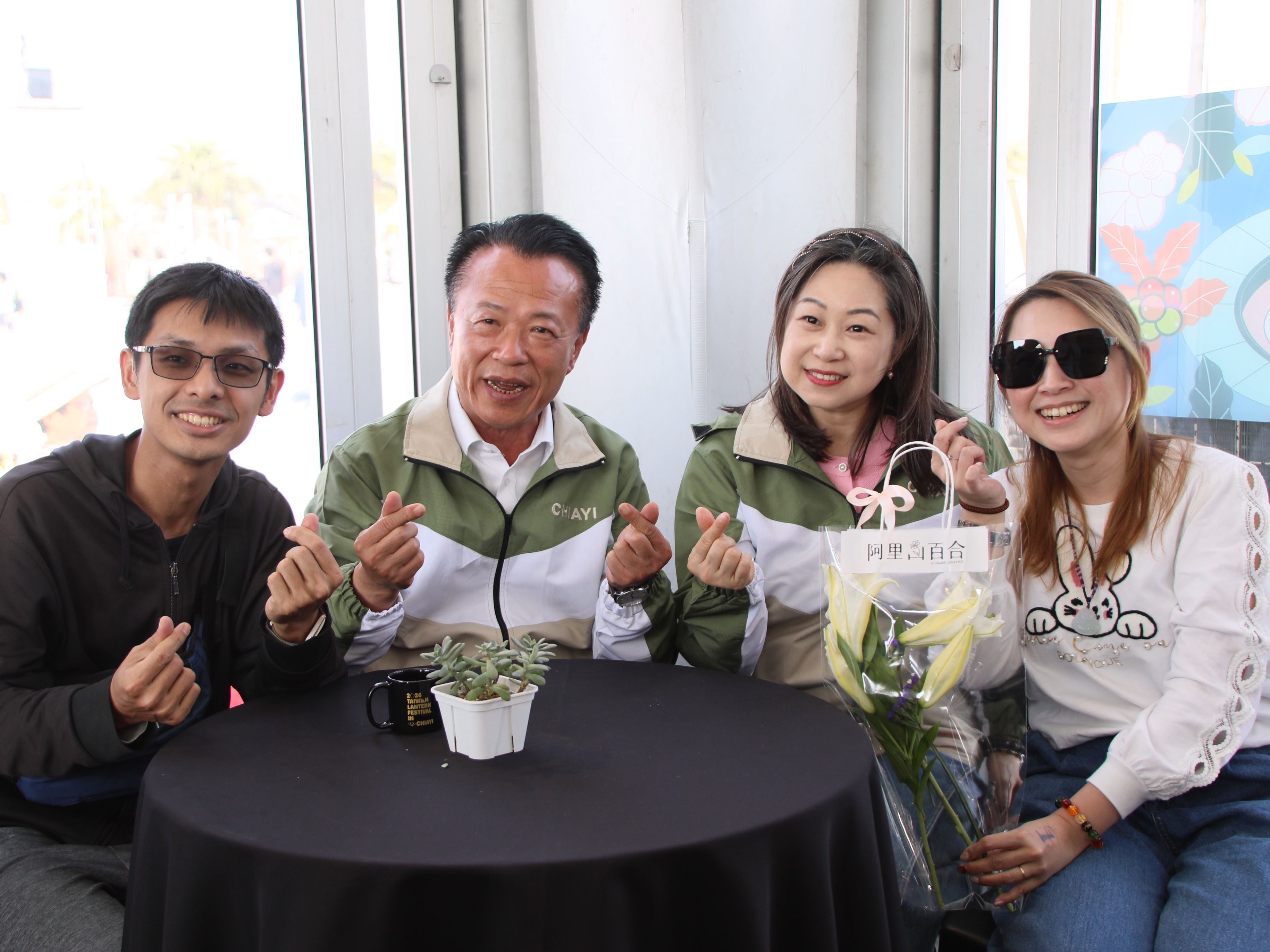 縣長翁章梁也驚喜現身活動現場,親自為民眾送上百合花束,與現場情侶及夫妻互動合影。翁章梁表示,希望透過燈會活動讓更多人認識嘉義優質咖啡與阿里山特色農產,也祝福大家白色情人節快樂,在燈會中留下甜蜜難忘的回憶。