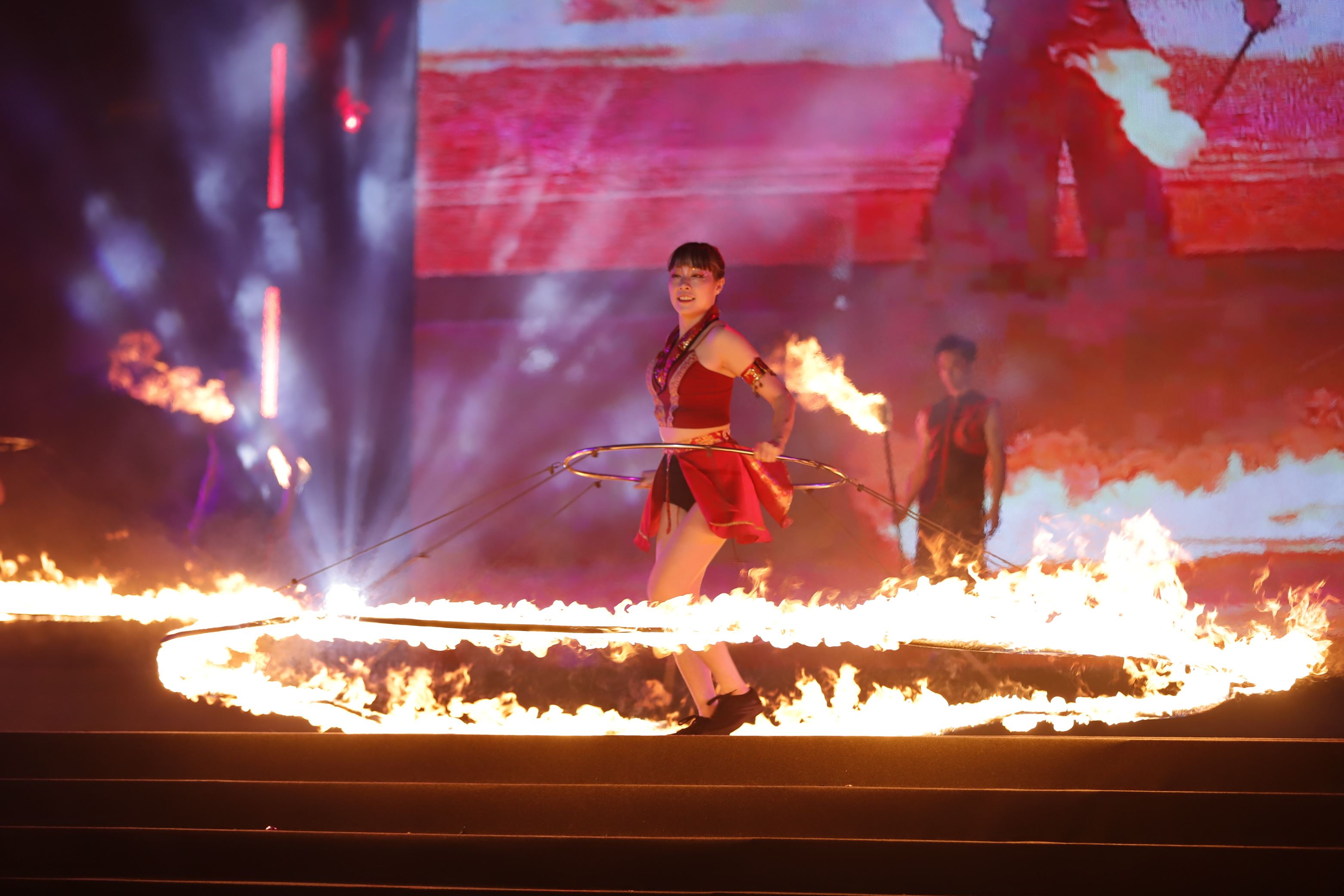 2026台灣燈會,紙風車劇團大型親子劇「雨馬」震撼演出,超過三層樓高的巨型藝術裝置踏著流動光影緩緩前行,彩虹鬃毛在夜色中閃耀奪目,結合舞台演出、火舞特效與沉浸式影像設計,為嘉義燈會增添驚喜與感動。