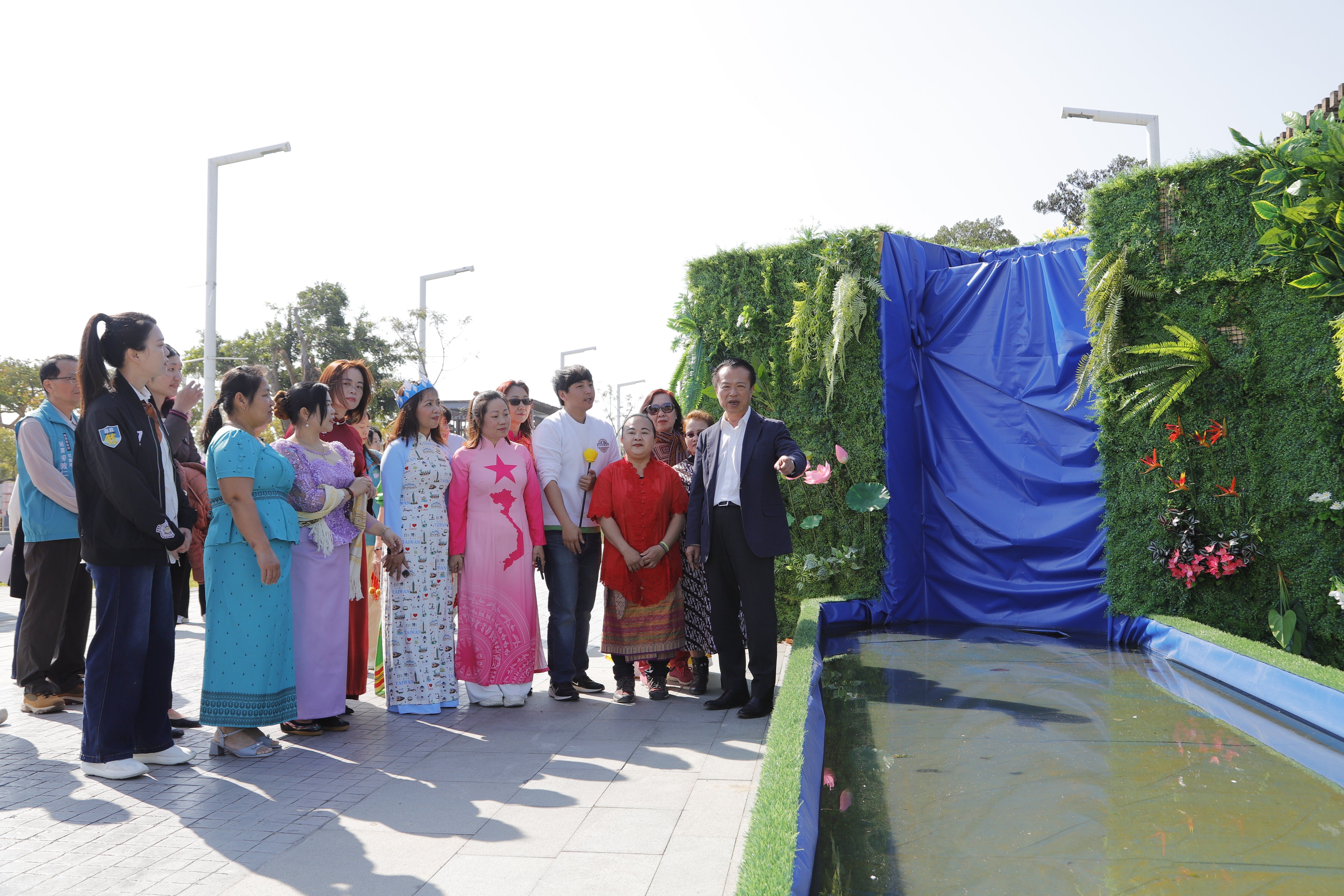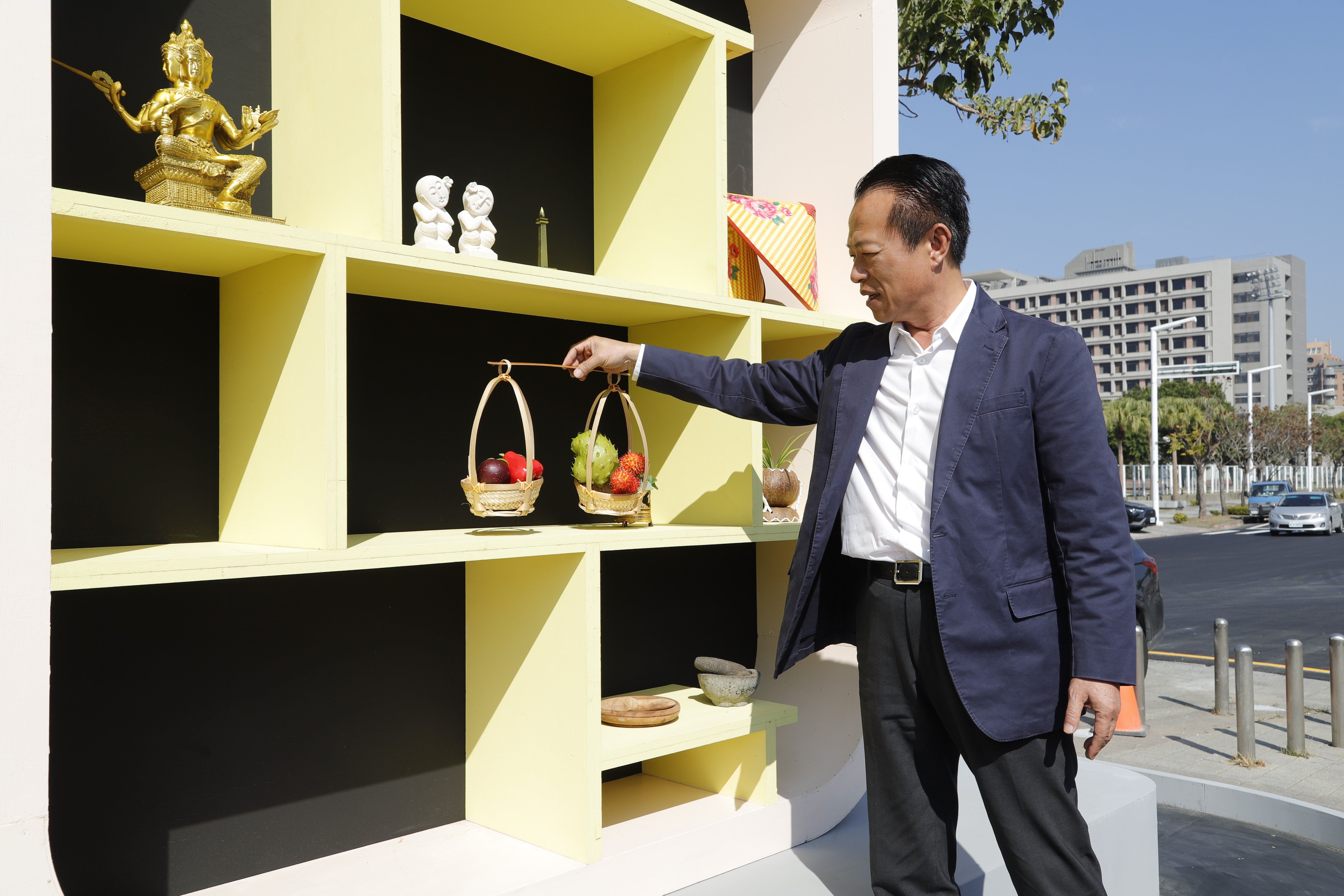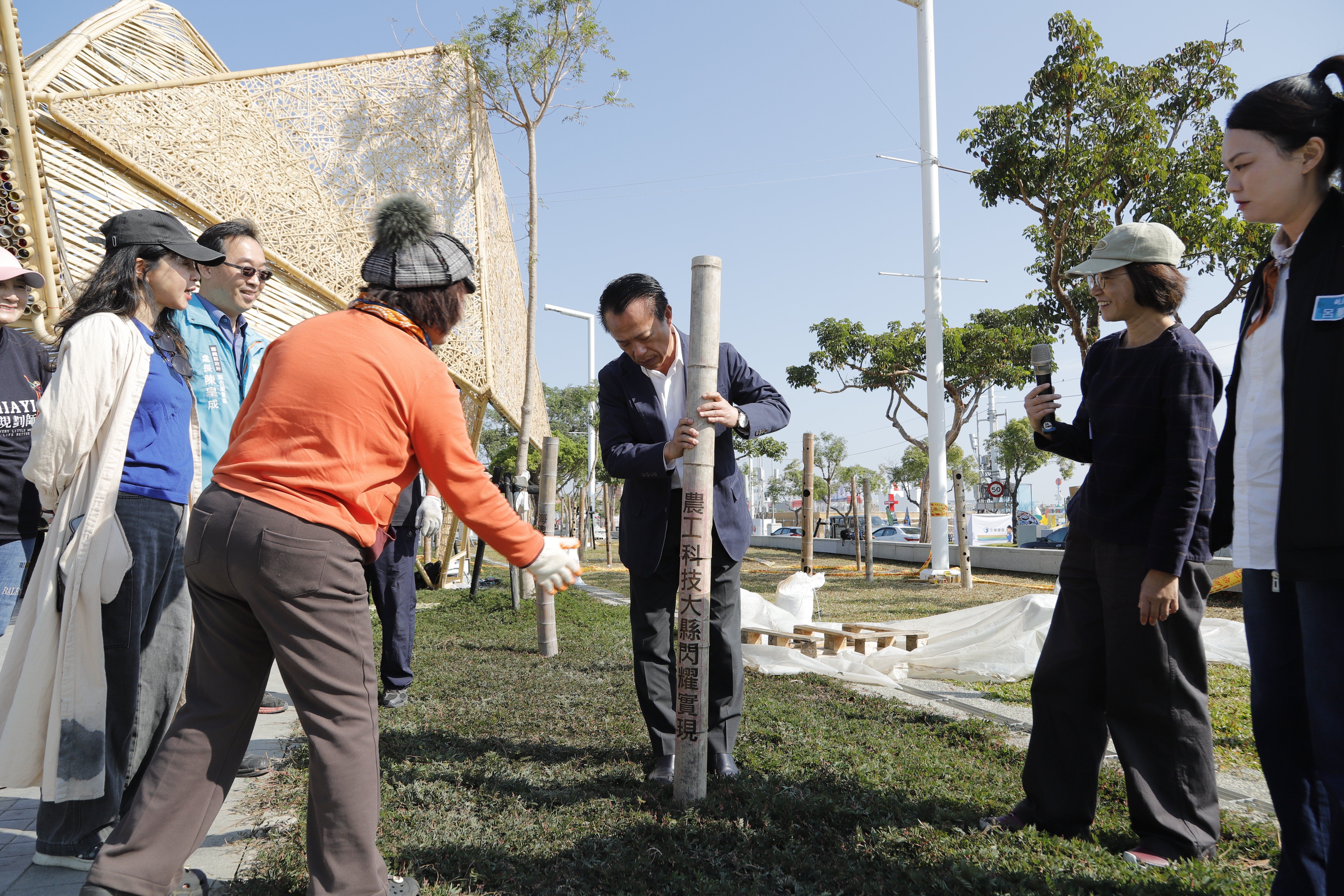 翁章梁走訪社規師、新住民燈區,首先於藍腹鷴燈組前邀翁縣長親自安裝一支有社規師共創詩句的竹筒燈,隨後由許芳瑜老師導覽燈區;新住民朋友則分享來台第一件帶來的物品或者最想念的物品,翁縣長與新住民共同將物件放上行囊的國度燈具,象徵迎接及點燈。