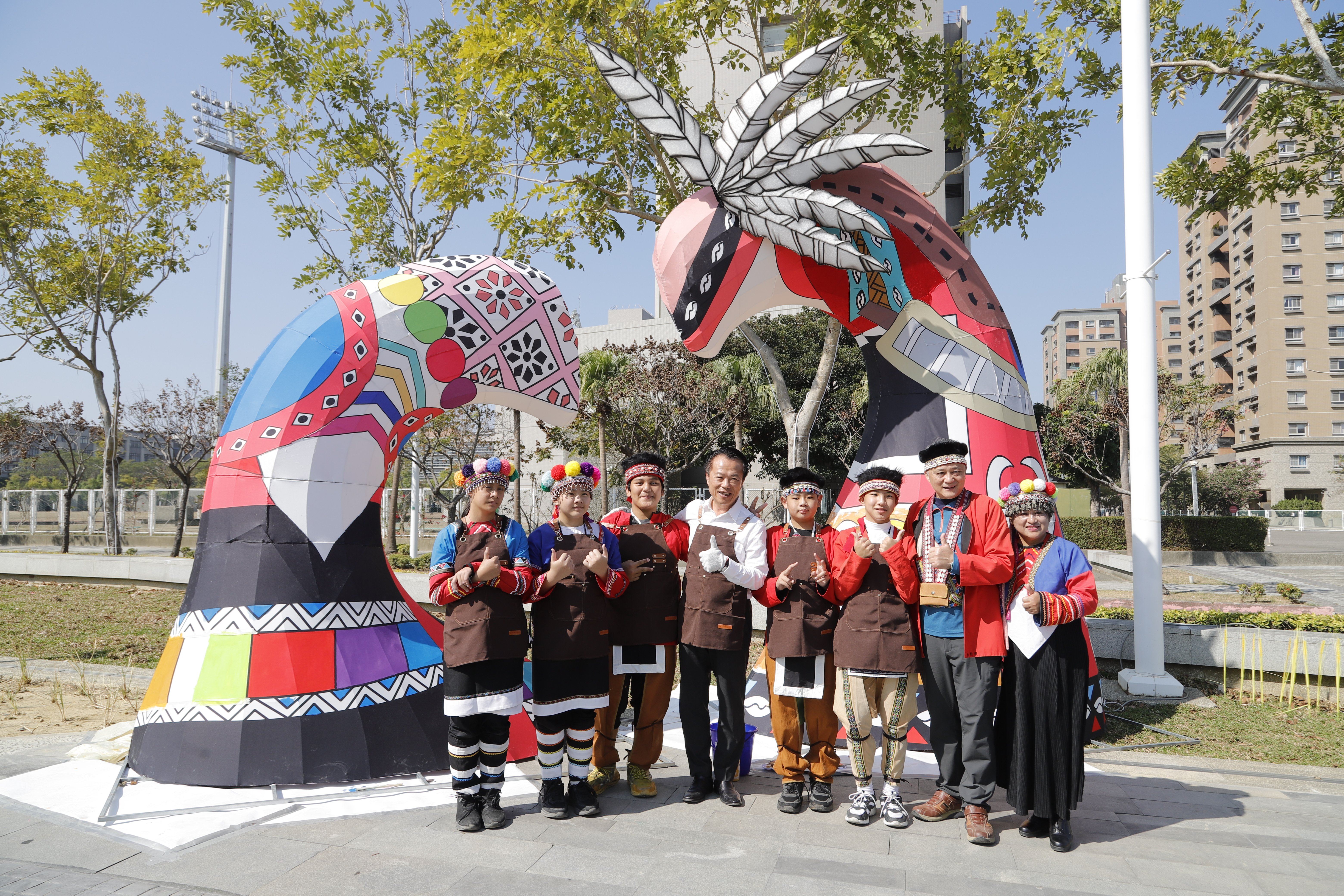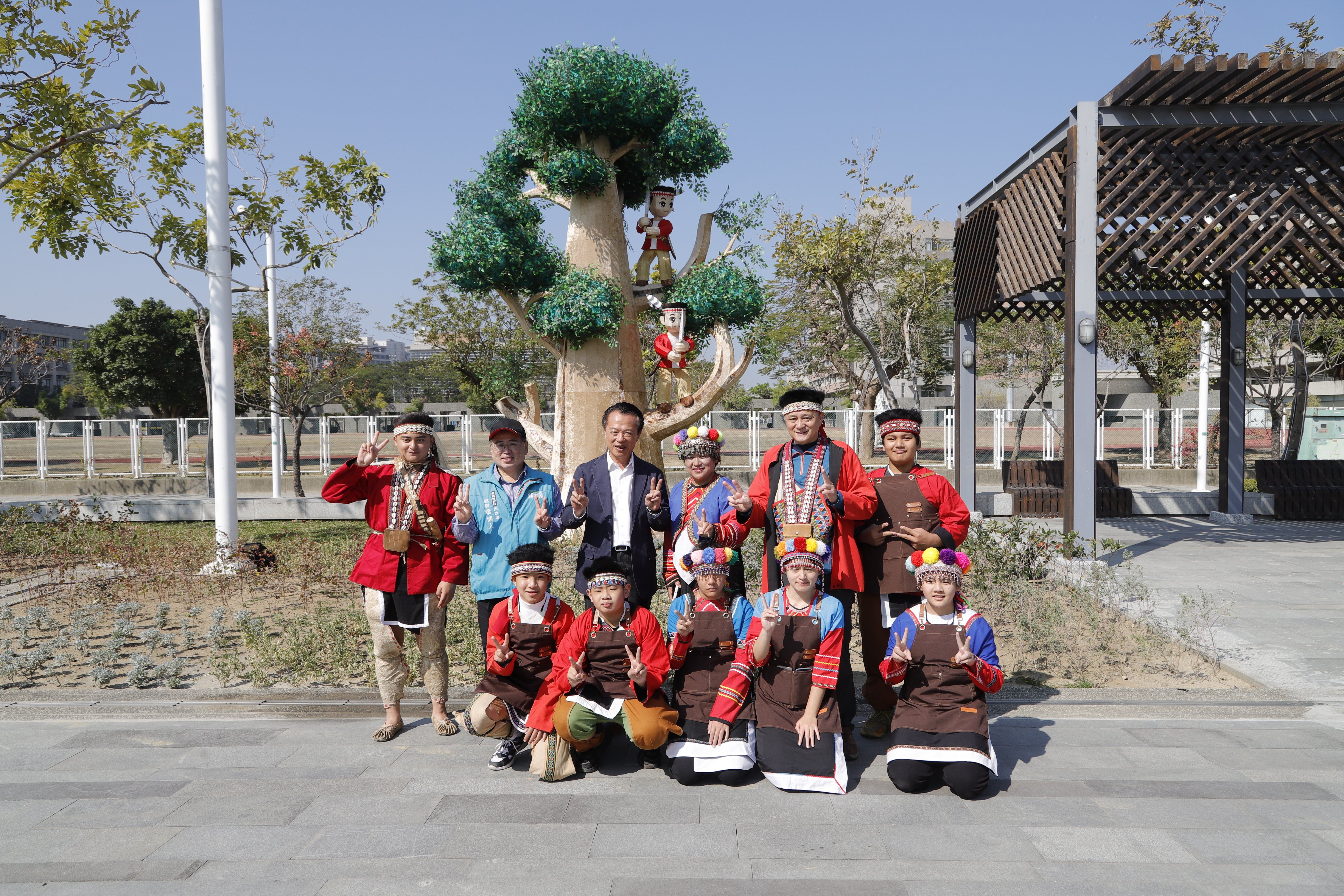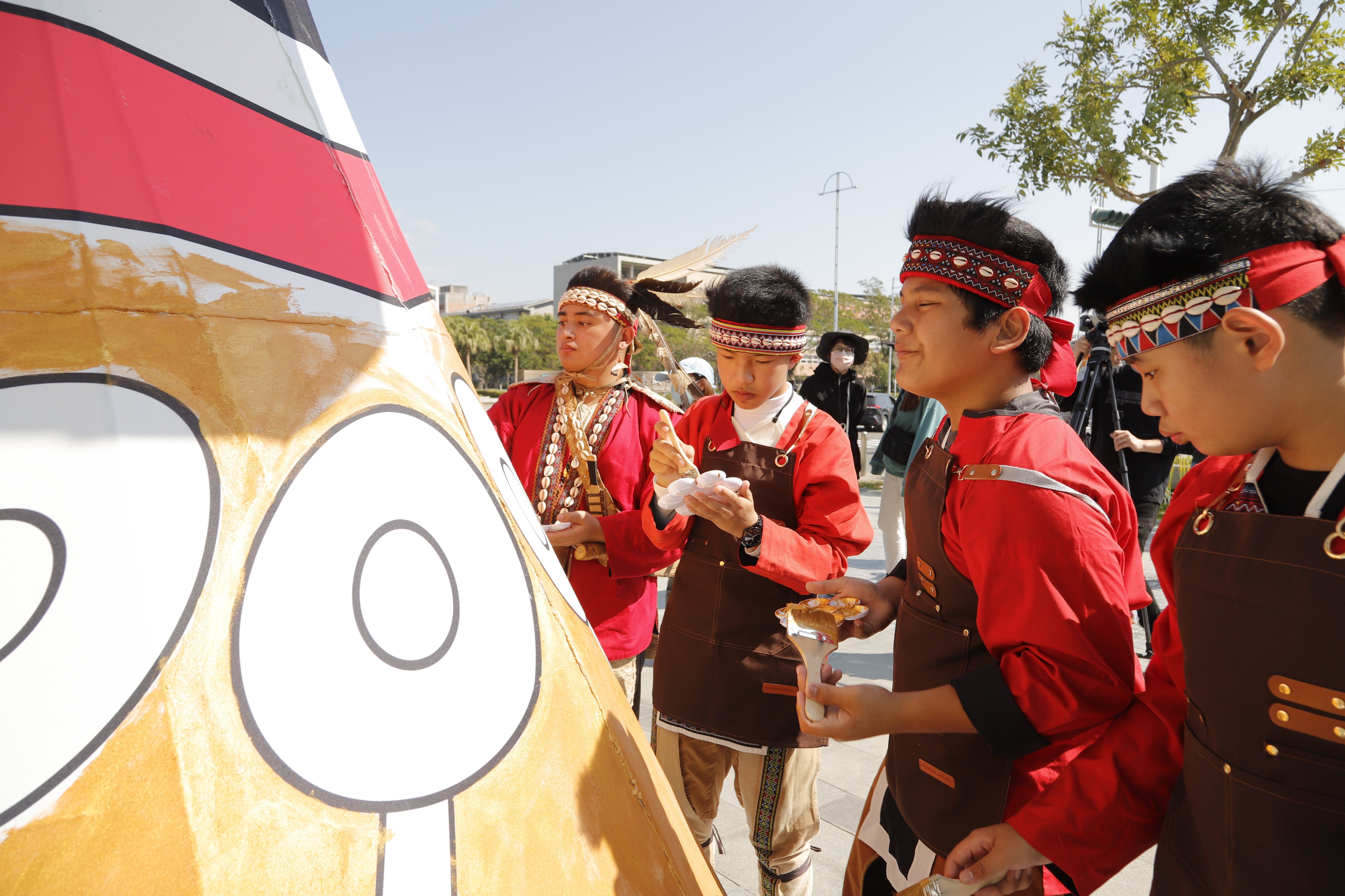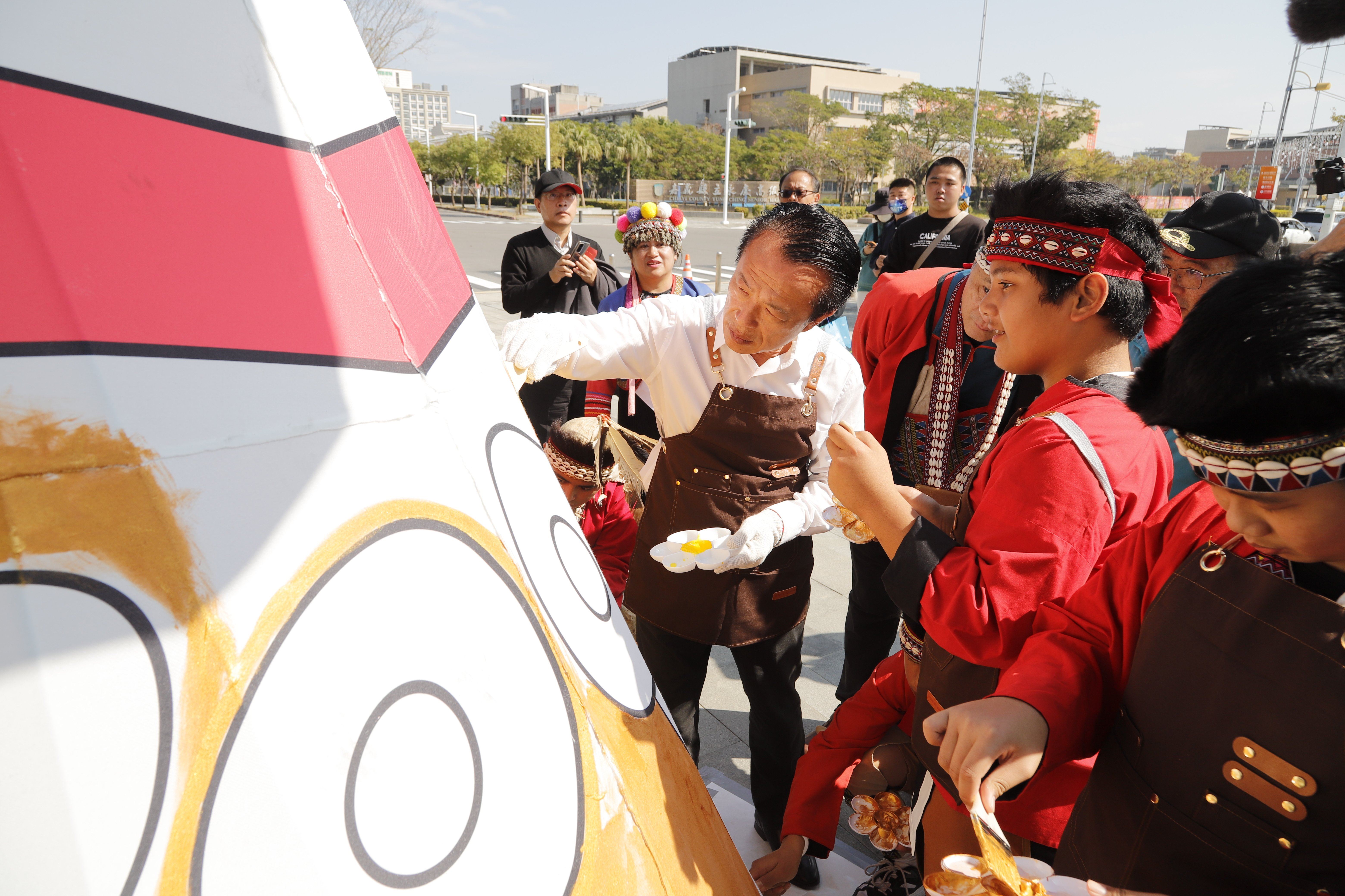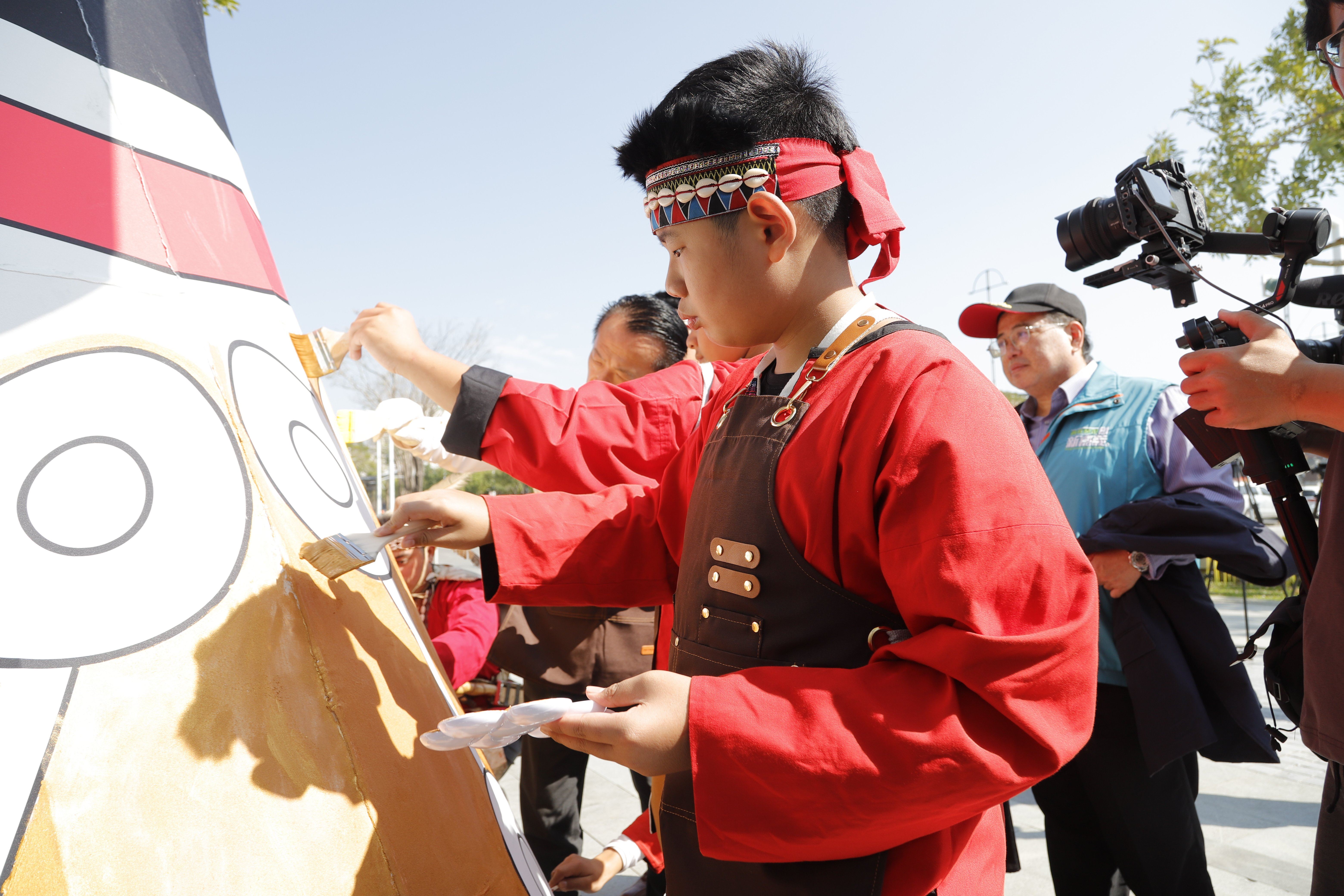 翁章梁隨後走入鄒族燈區「神之境」,與策展人鄭佩茜、族人孩童共同彩繪「迎賓之心」燈組,以充滿儀式感的創作,傳遞嘉義縣熱情歡迎全國遊客的心,同時凝聚原鄉對土地與燈會的認同感。