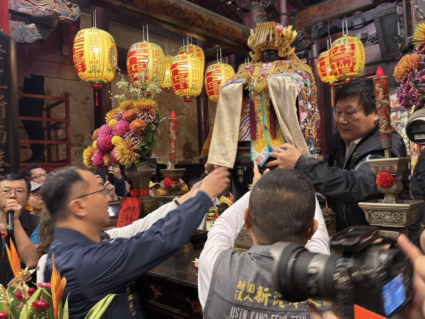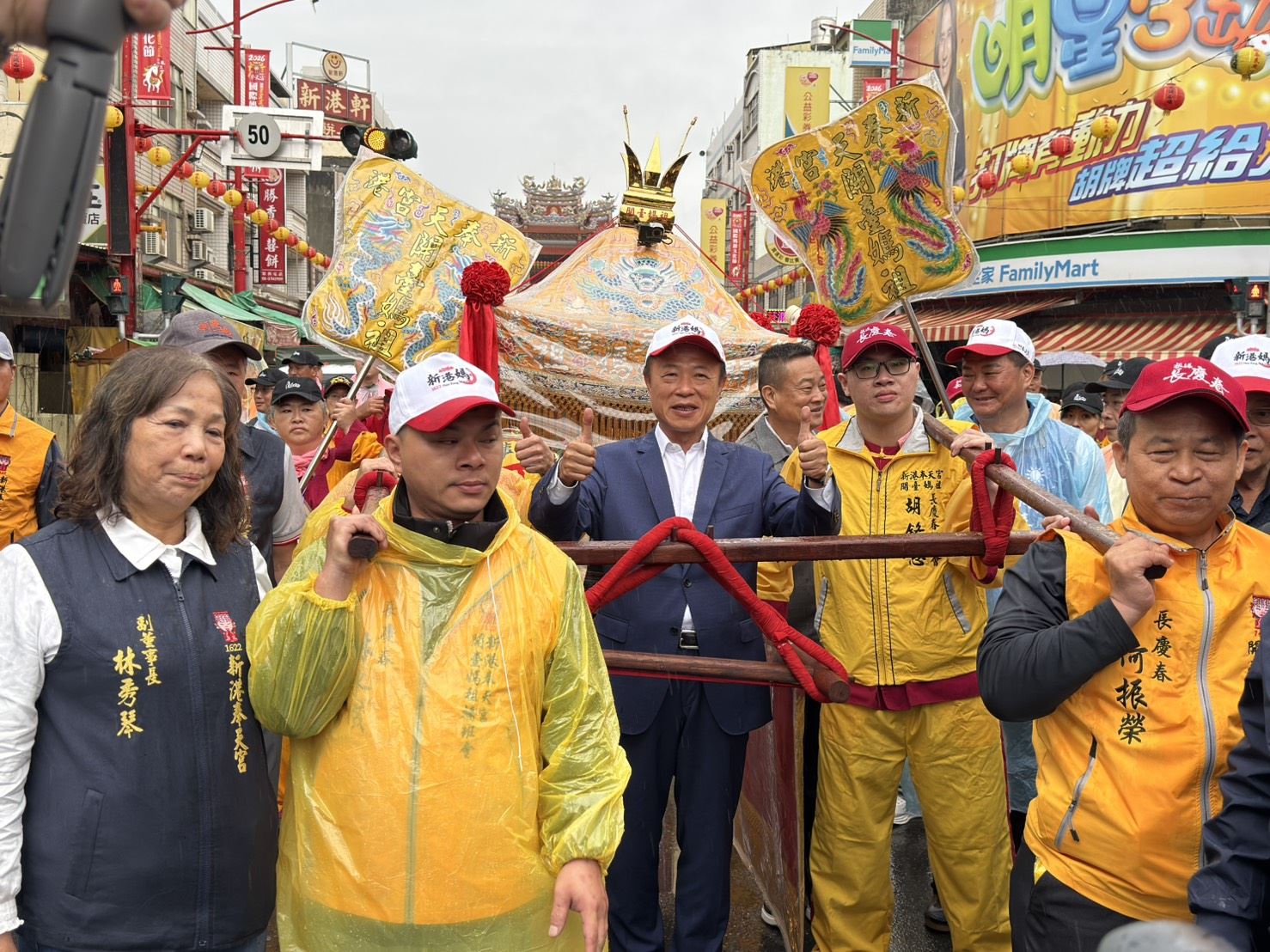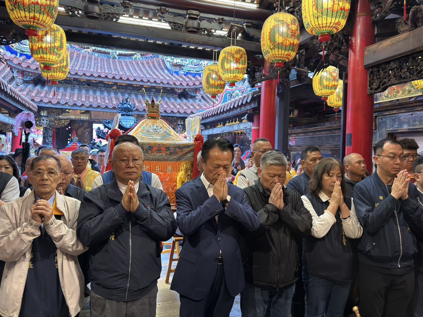 翁章梁完成奉天宮團拜後,隨後前往六興宮參與元宵遶境起駕團拜典禮,向神明祈求地方平安,燈會活動順利,也為燈會開燈日加持祝福。