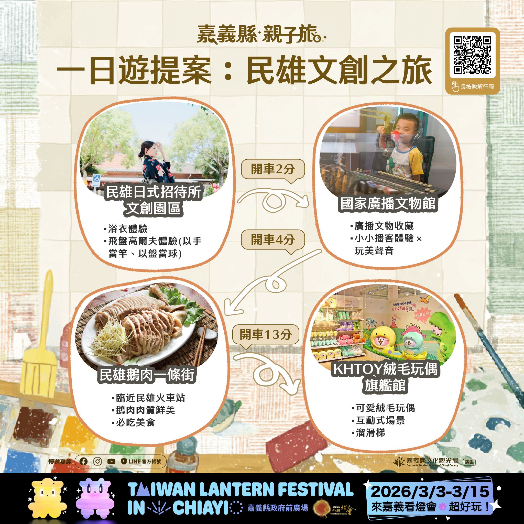 文觀局強調,透過這28條親子賞燈遊程的推出,期盼民眾於春節假期走訪嘉義各鄉鎮,體驗在地文化與特色美食;燈會期間則可安排白天走遊、夜晚賞燈,感受日夜不同的旅遊體驗。