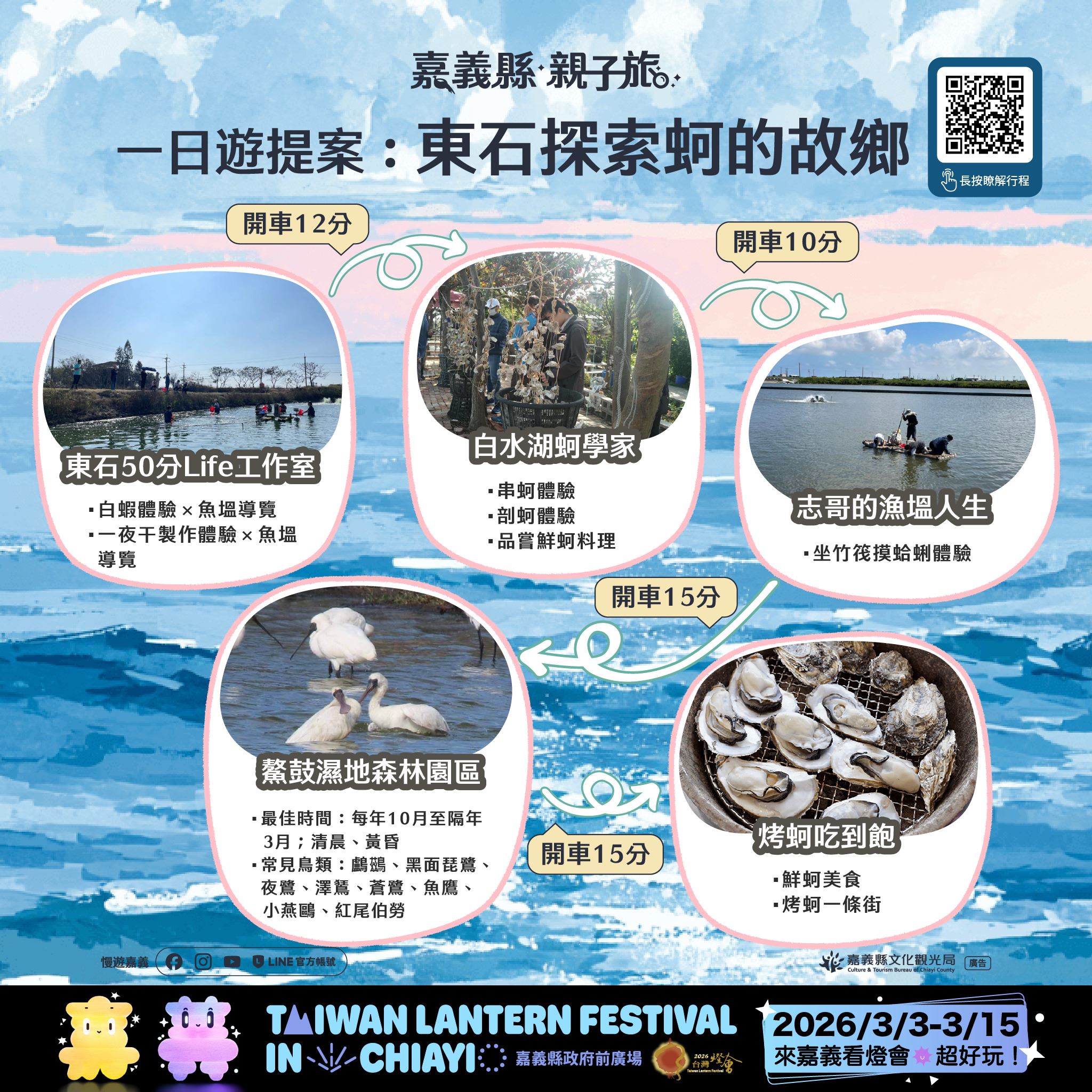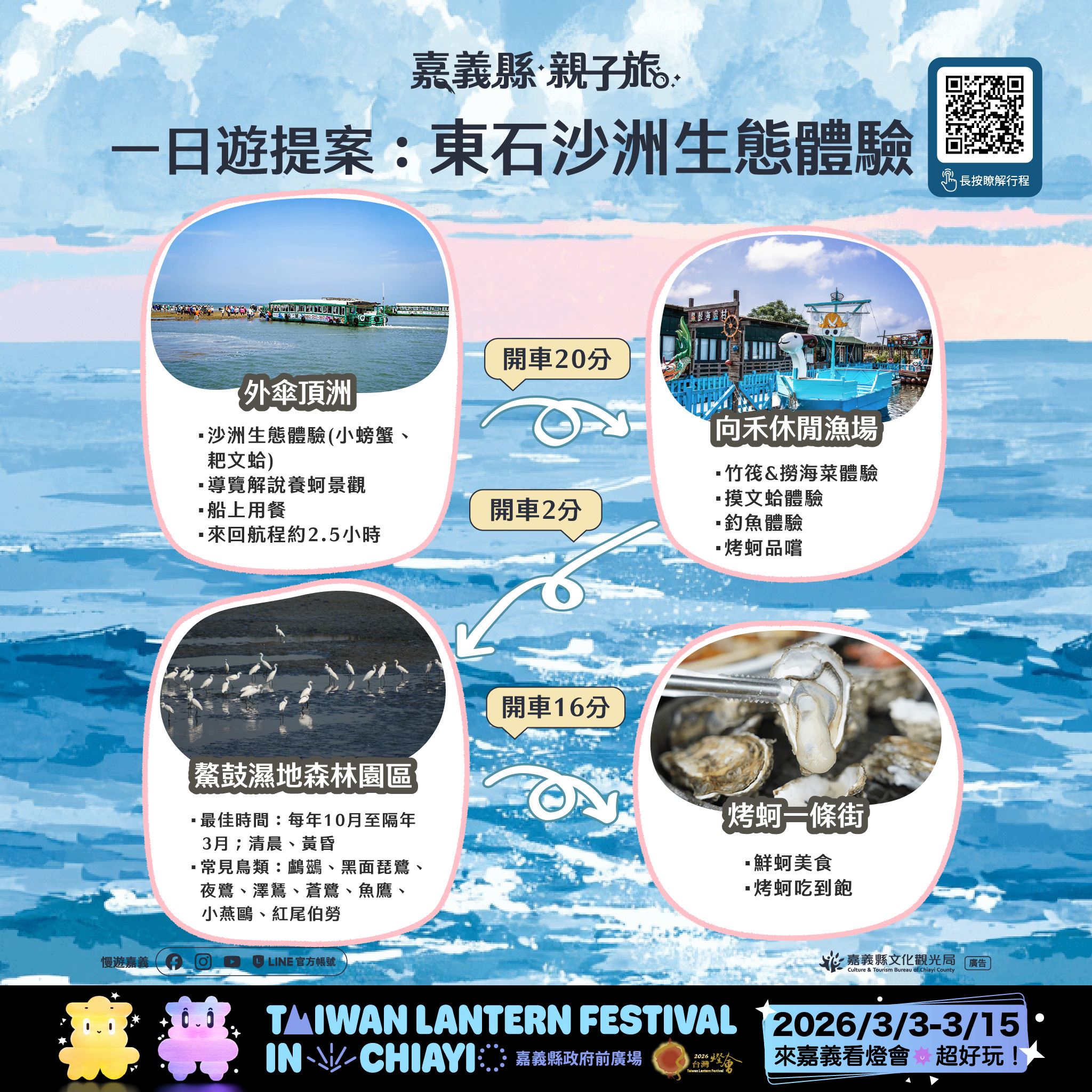 一日遊的親子遊程中,路線結合各鄉鎮在地特色,例如鹿草、六腳、水上、大林、朴子、新港等地,安排主題工廠參訪、手作體驗與在地美食巡禮,增添孩子動手與觀察學習的機會;民雄、中埔、番路、竹崎等路線則融合人文歷史、步道健行與農創體驗,讓孩子在旅行中深入認識在地文化;布袋、東石等海線地區則以濕地生態、漁村文化與海上體驗為特色,可親近自然、體驗海洋生態,非常適合親子同遊。