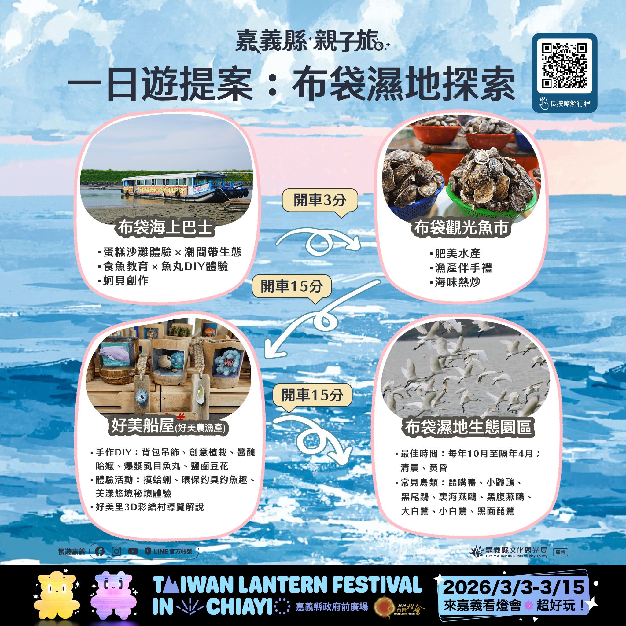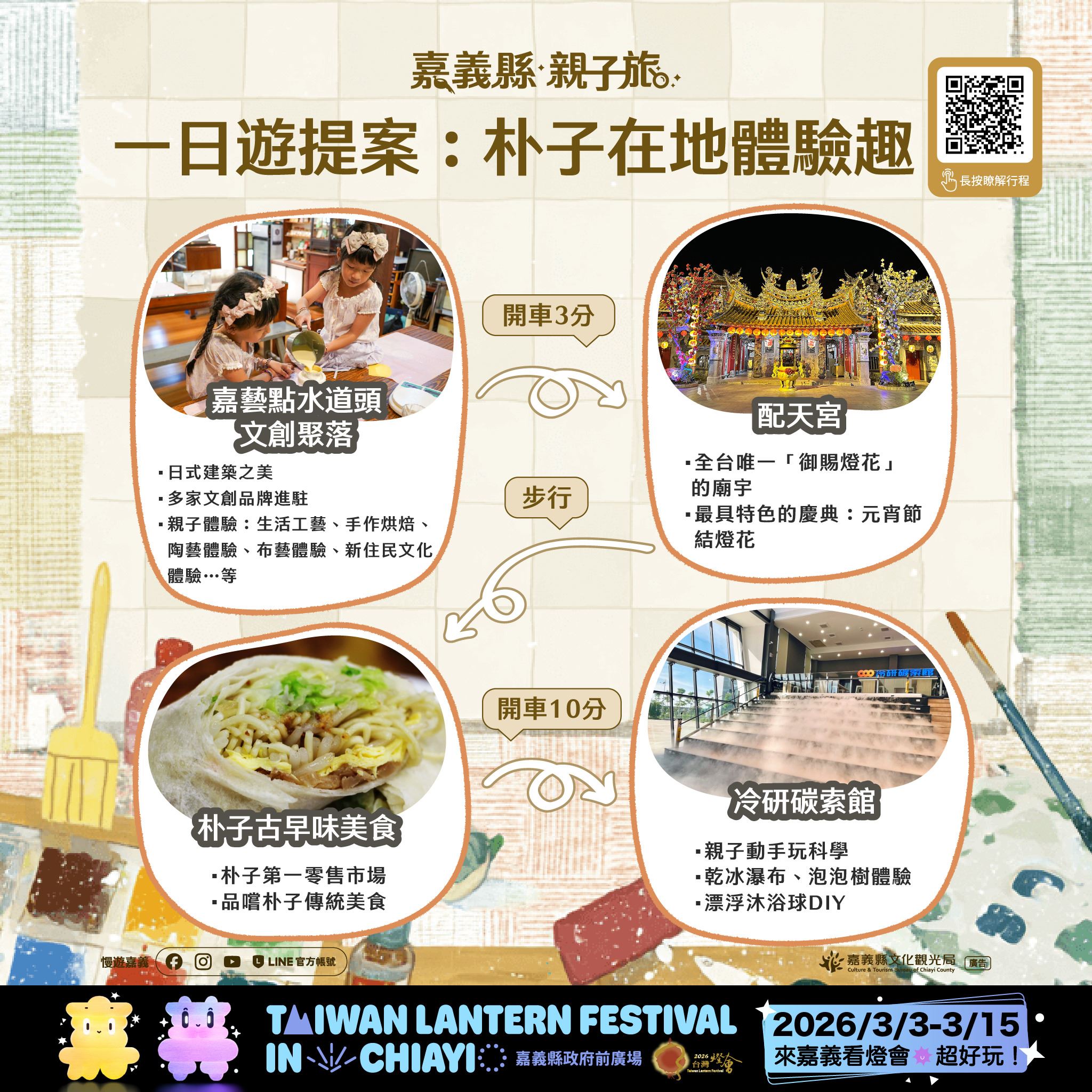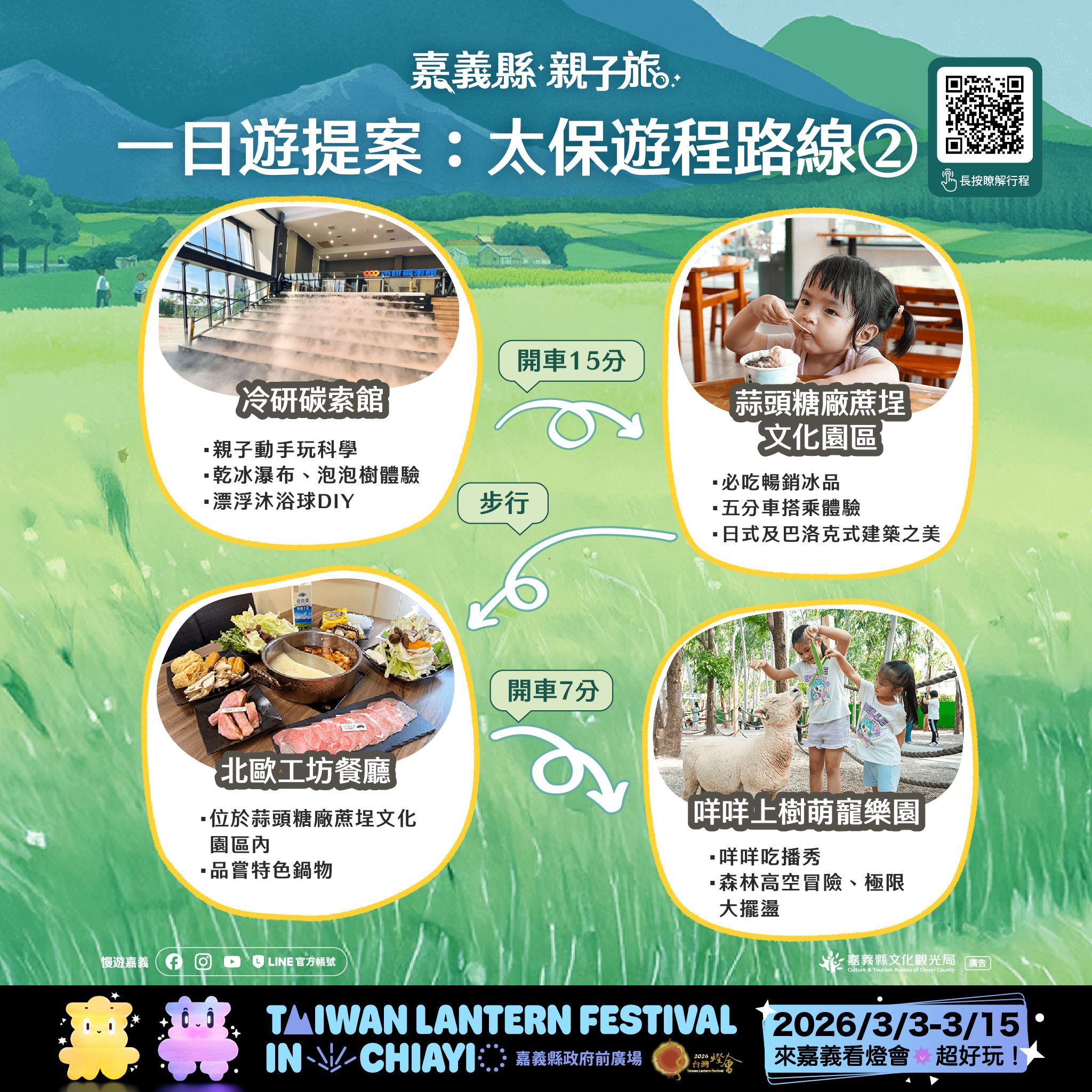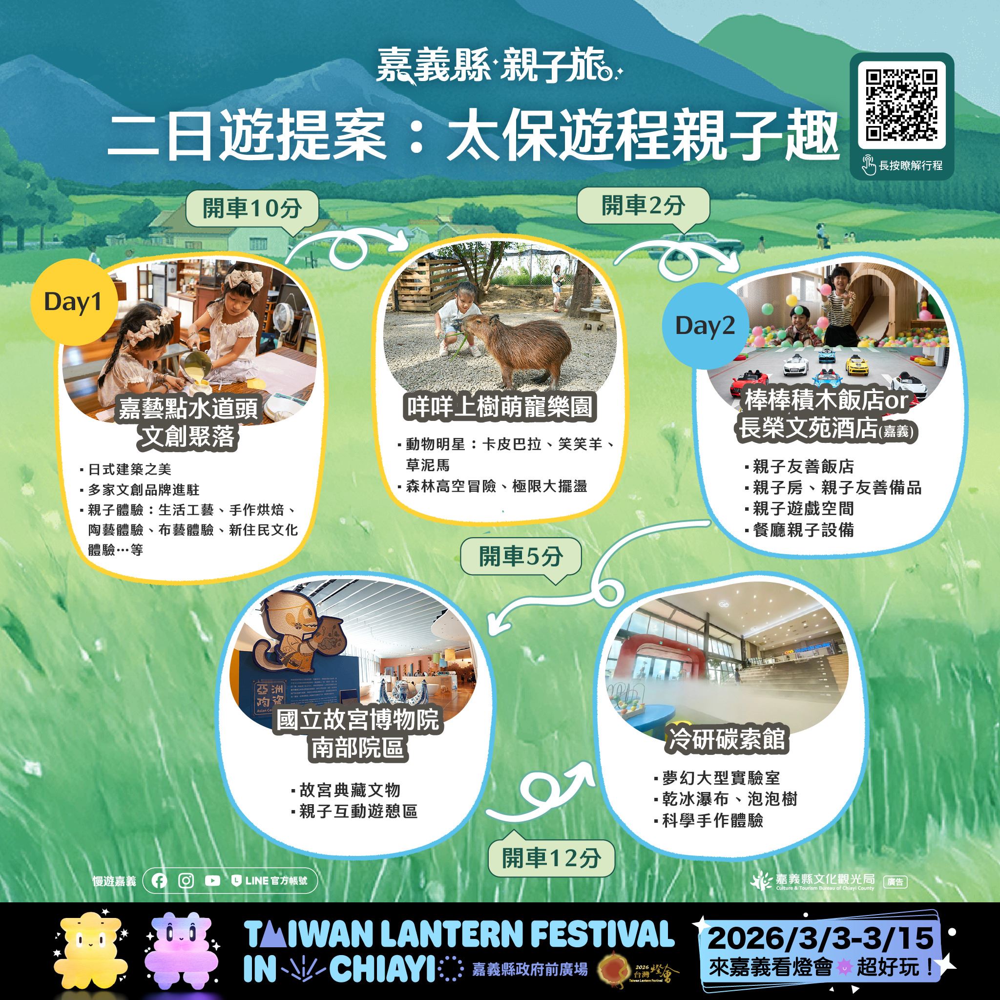 相關遊程資訊已同步整合於「2026台灣燈會」官方網站之「觀光旅遊-親子旅遊」專區(https://2026taiwanlanternfestival.org/FamilyTravel),歡迎家長依需求規劃專屬的親子嘉義之旅,一起為孩子留下溫暖而難忘的旅行回憶。