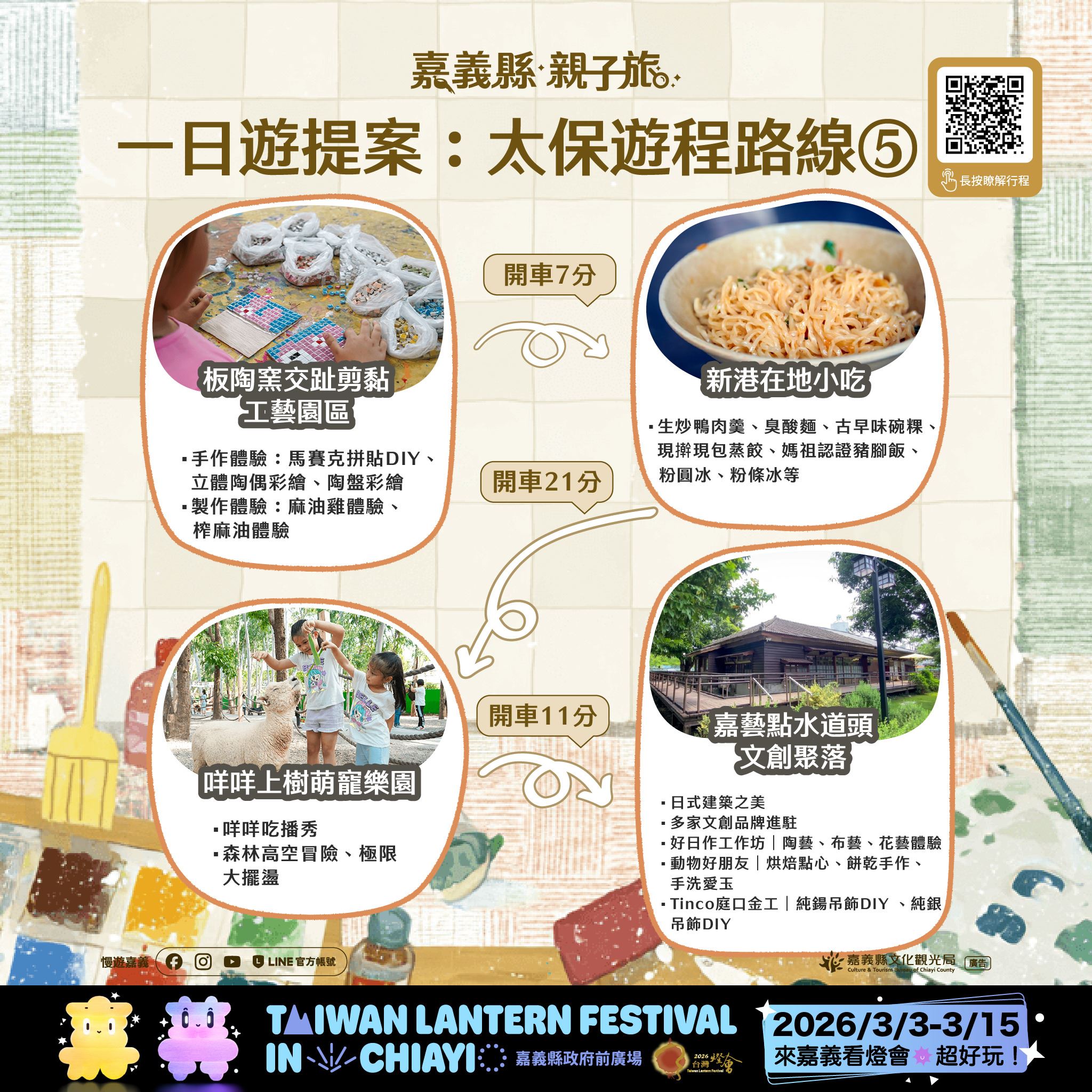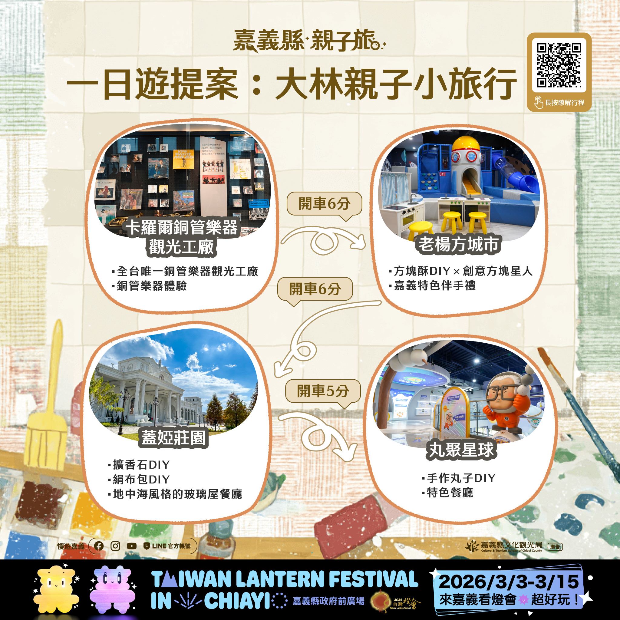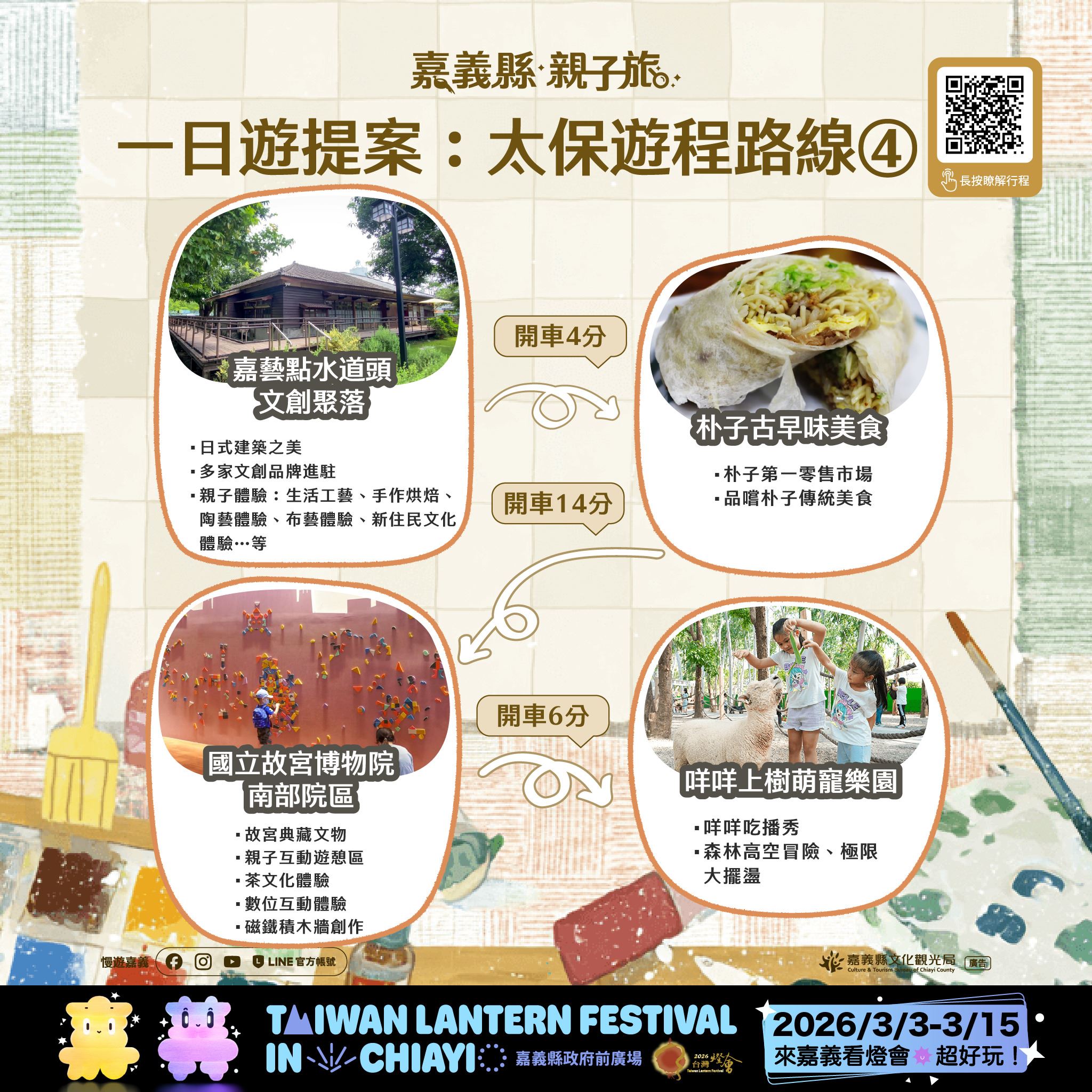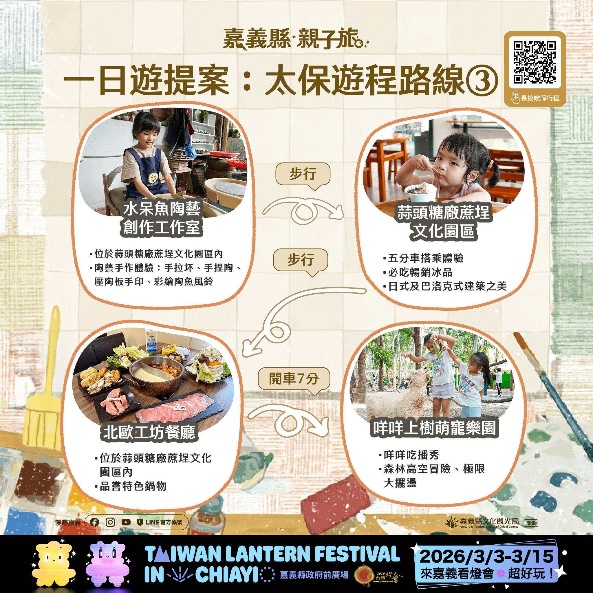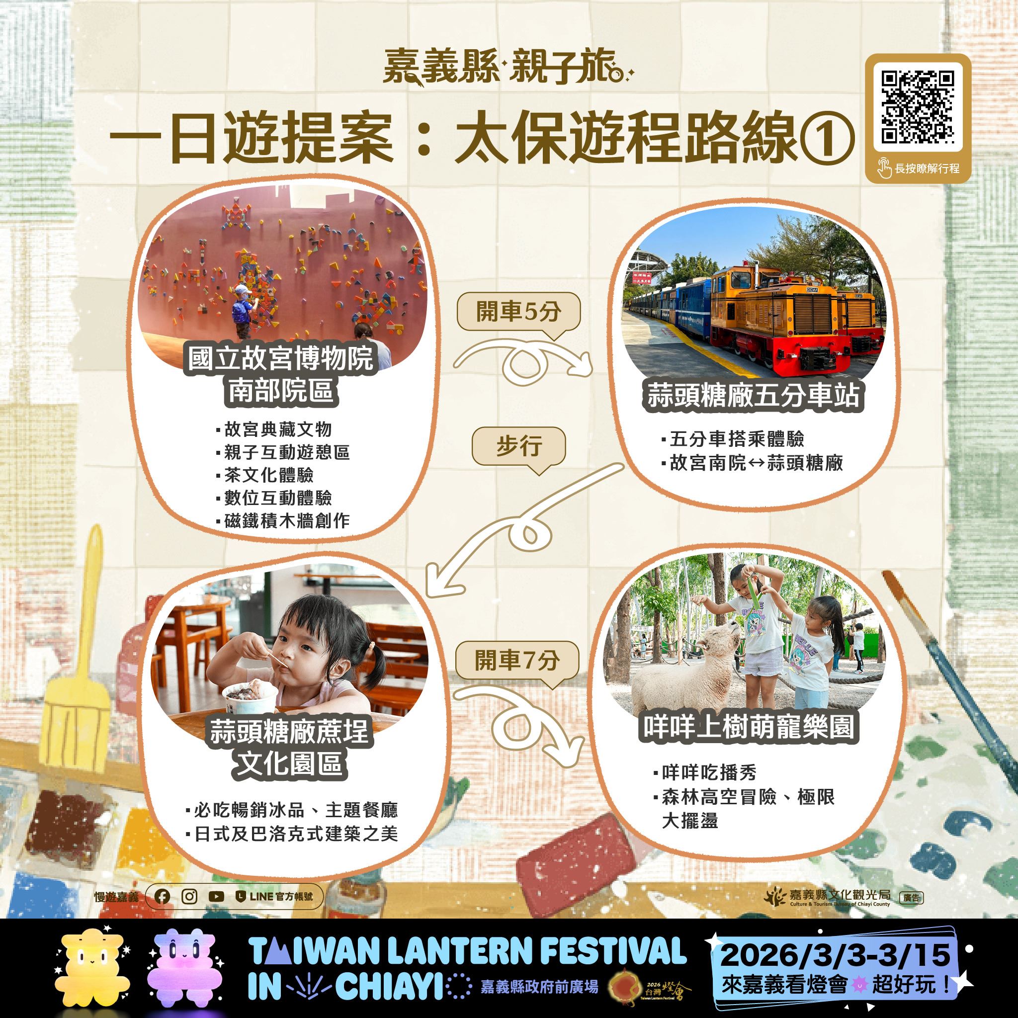 隨著2026台灣燈會在嘉義將於3月3日至3月15日盛大登場,文觀局特別規劃太保市多條親子路線,串聯故宮南院、蒜頭糖廠、文創聚落、主題工廠及萌寵樂園,提供多處親子友善場域,適合全家同遊。