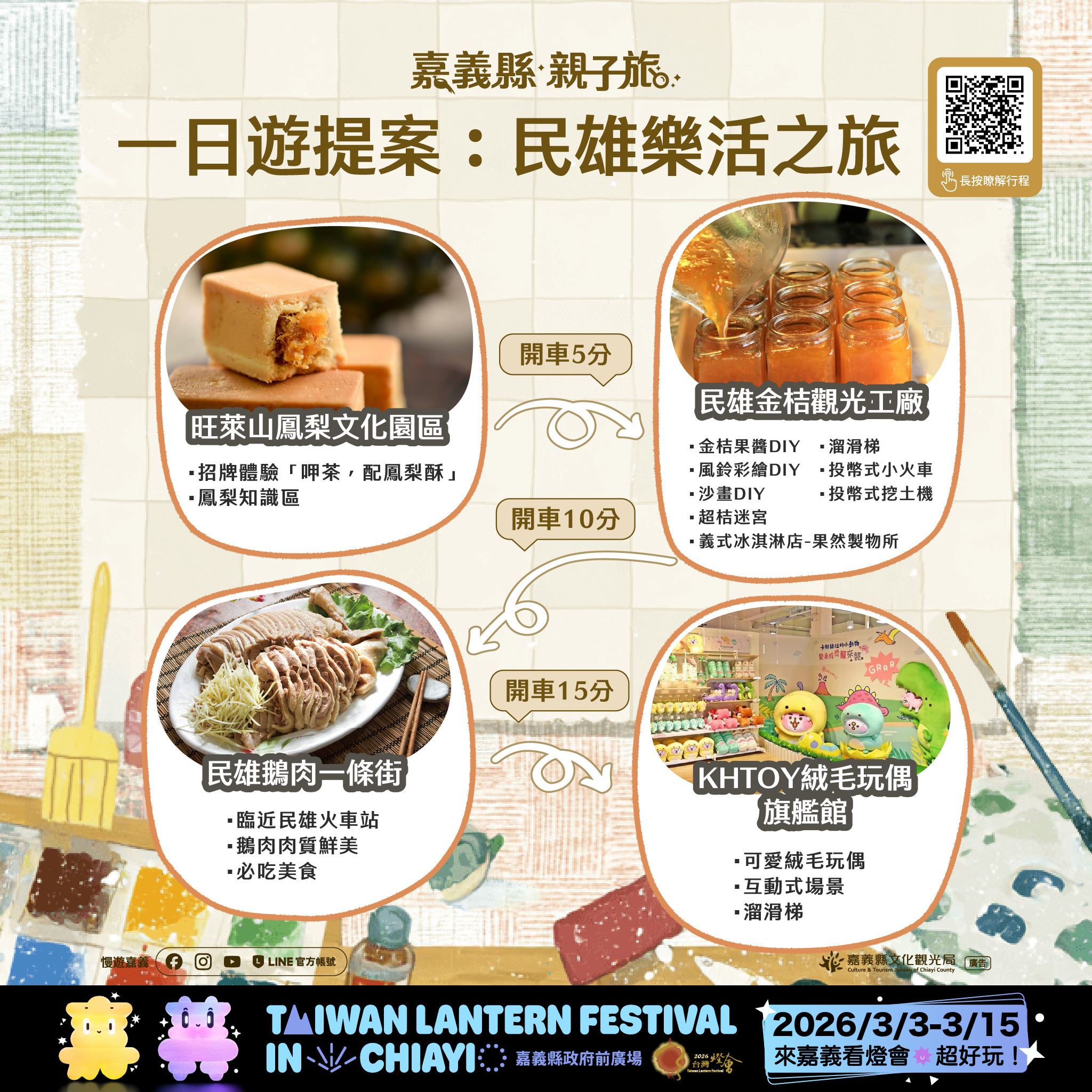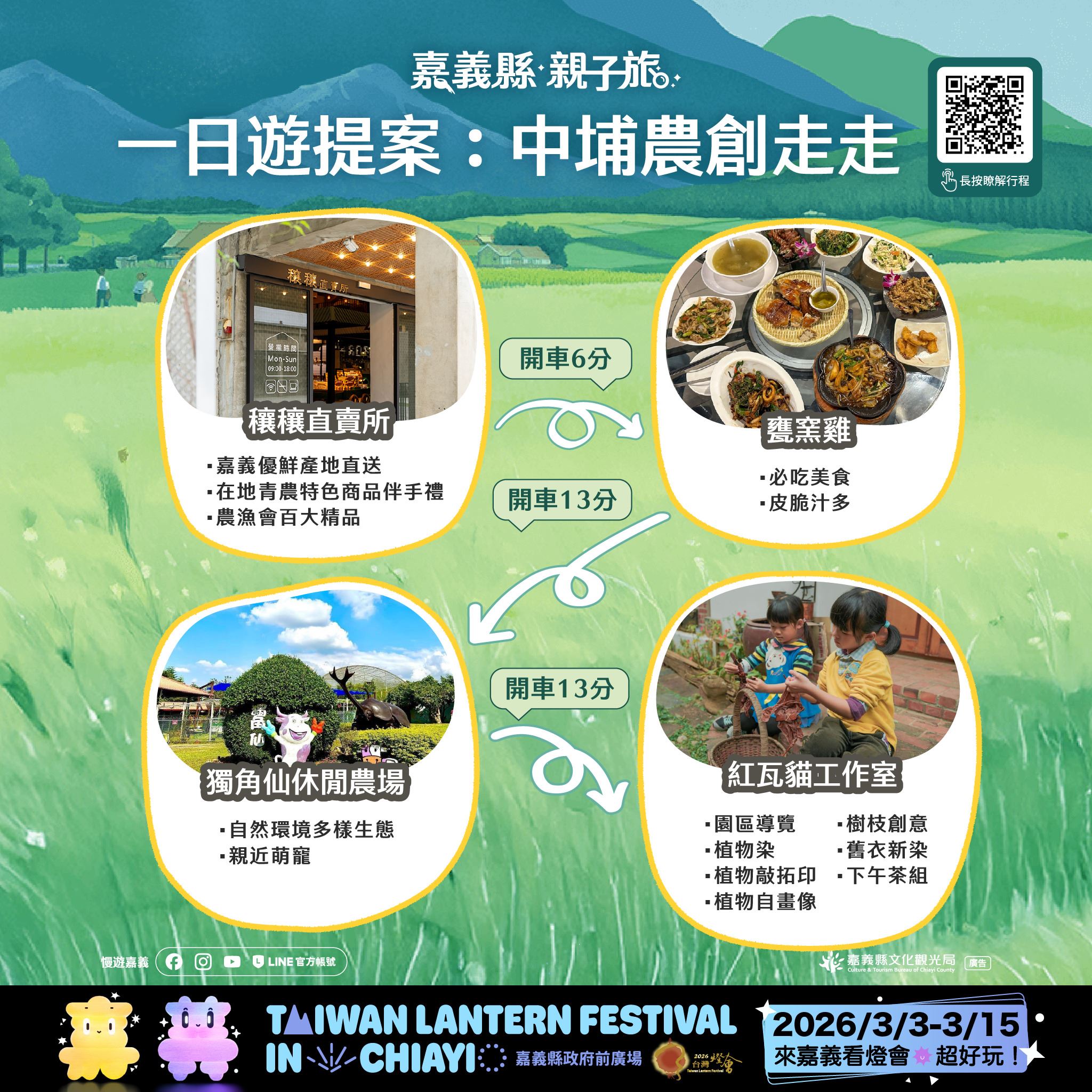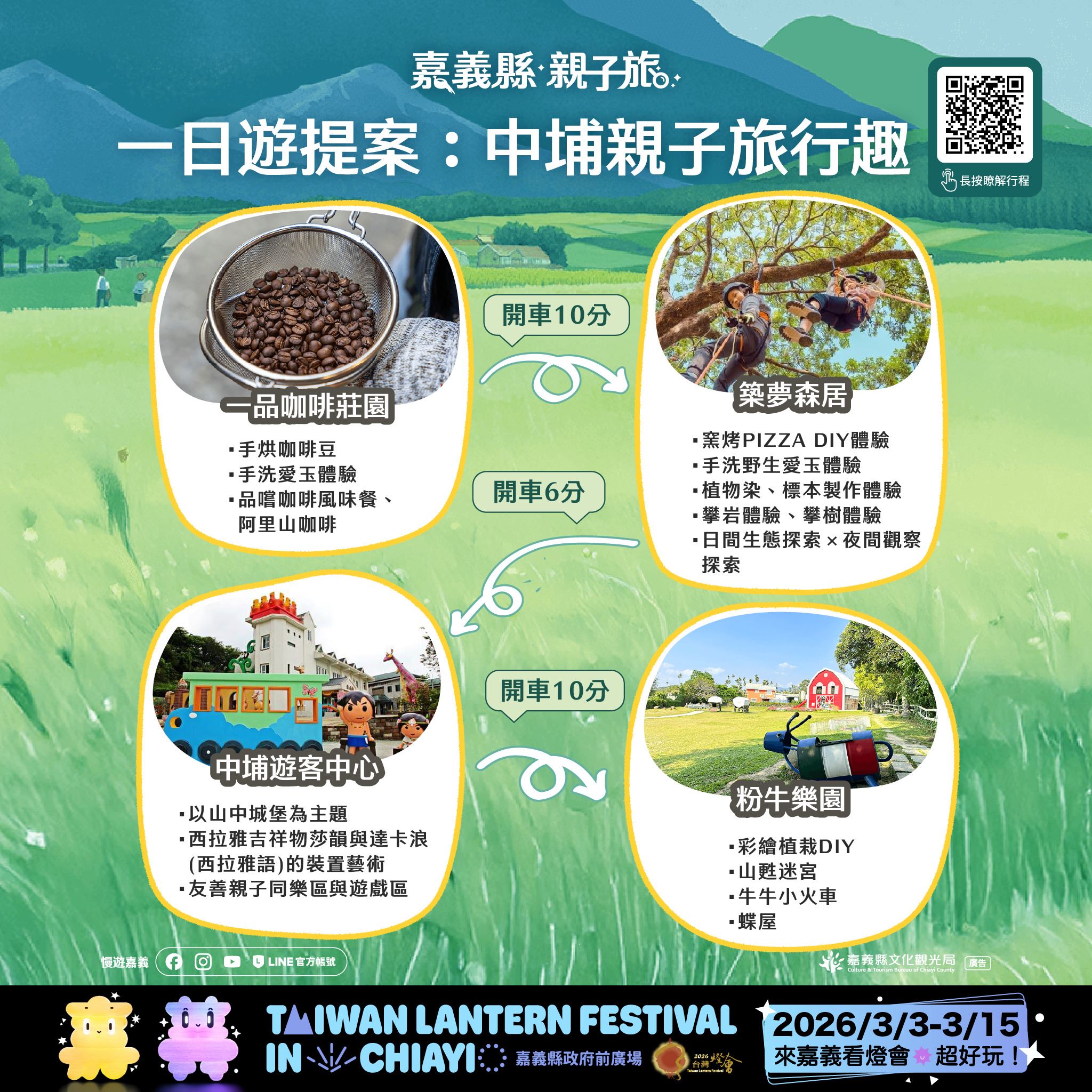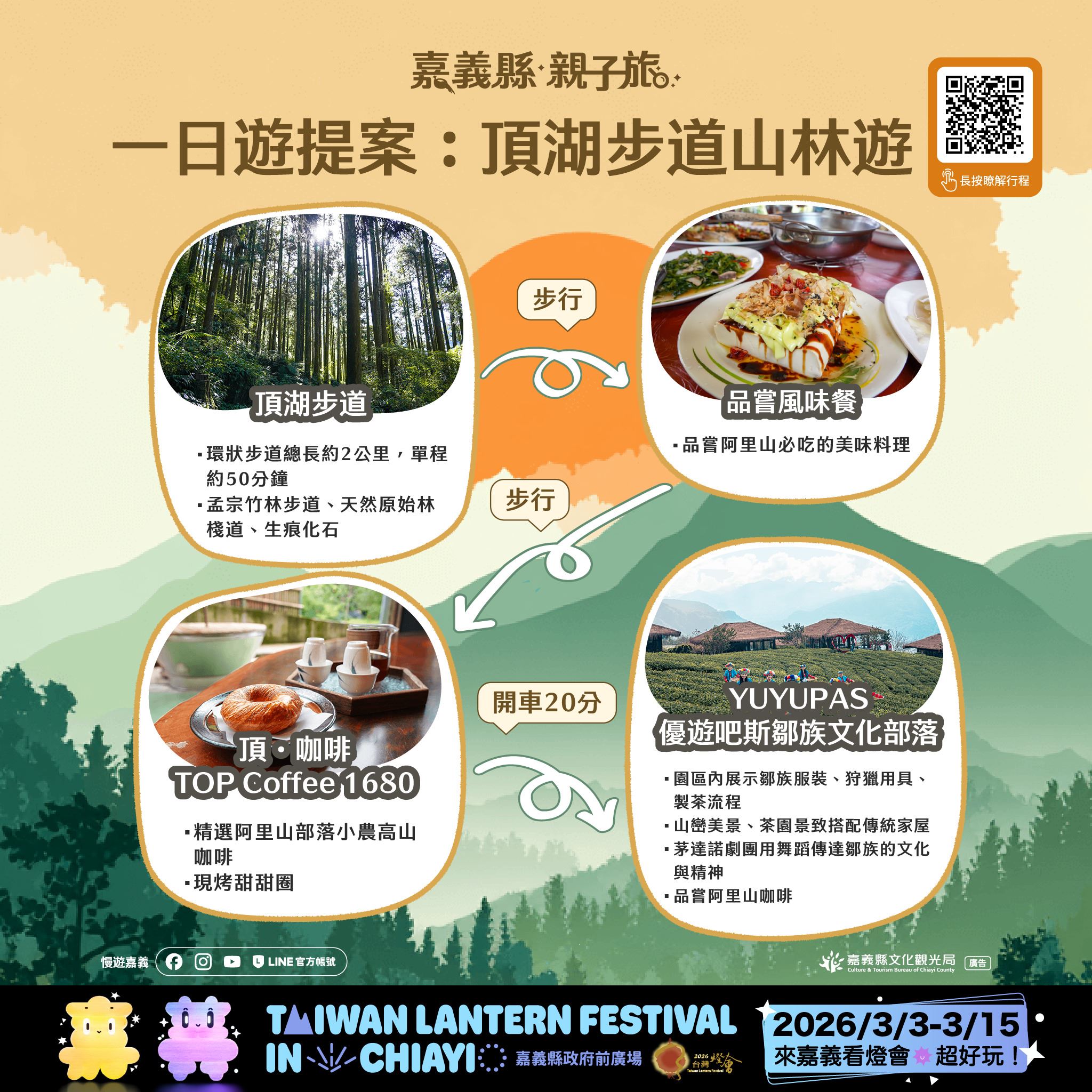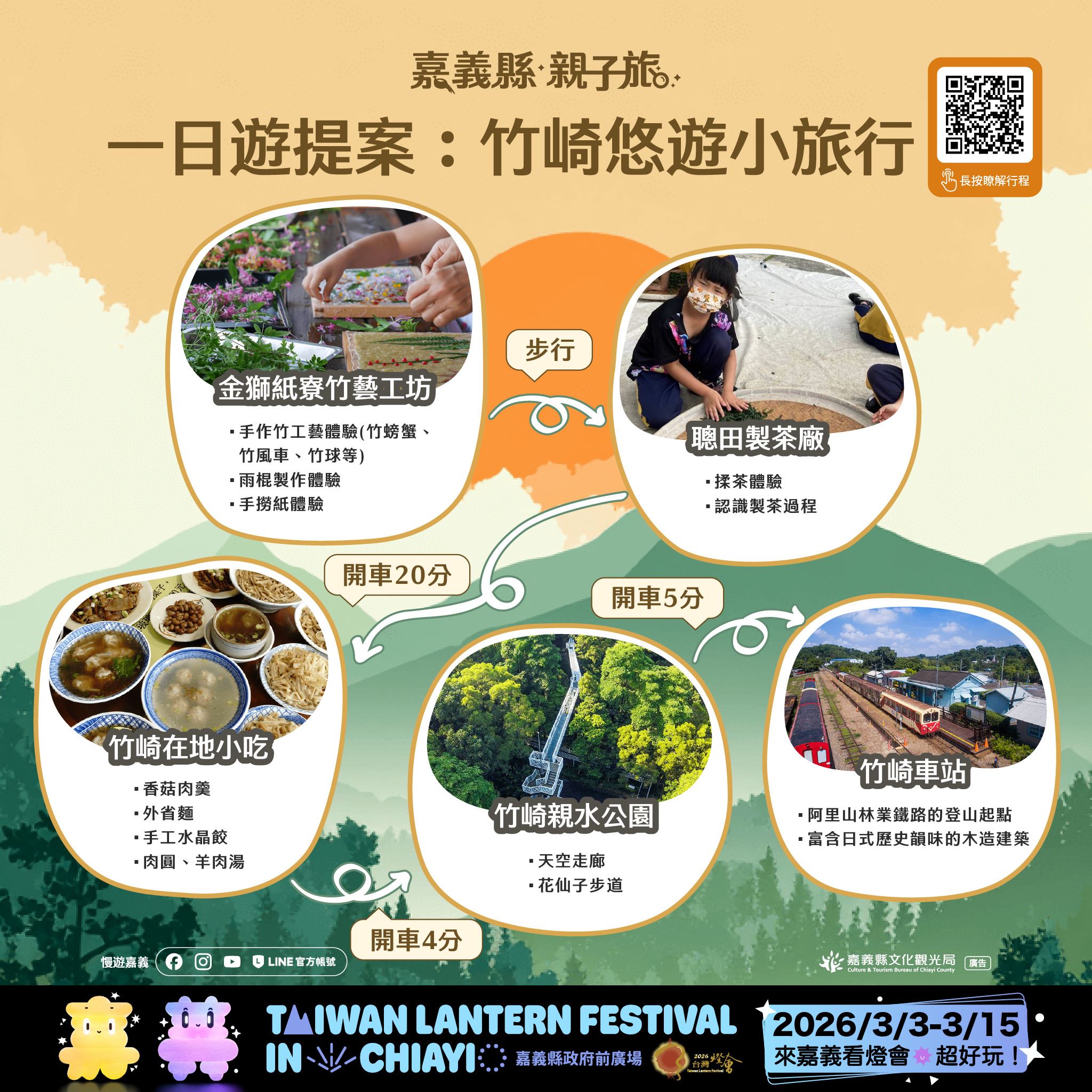 本次推出的28條賞燈親子遊程,涵蓋26條一日遊與2條二日遊路線,串聯嘉義縣多元景點與特色產業,遍及平原、海線與山線等鄉鎮,讓不同年齡層的孩子與家長,都能找到適合全家共遊的行程選擇。遊程內容橫跨文化體驗、自然生態、主題工廠、農村體驗及鄒族部落文化,白天深度走訪嘉義,夜晚再安排賞燈行程,讓旅遊節奏更輕鬆、回憶更豐富。