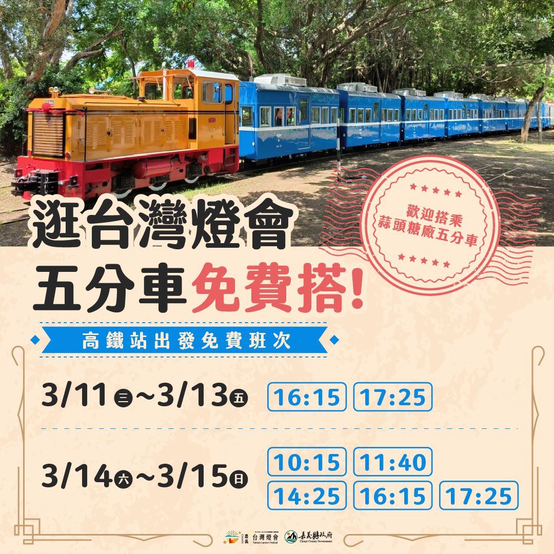 2026台灣燈會在嘉義,嘉義縣政府與台糖公司合作推出蒜頭糖廠五分車接駁服務,提供遊客自高鐵嘉義站前往蒜頭糖廠的單程免費搭乘體驗,讓民眾在前往燈會途中,也能感受嘉義糖業鐵道文化與懷舊風情。