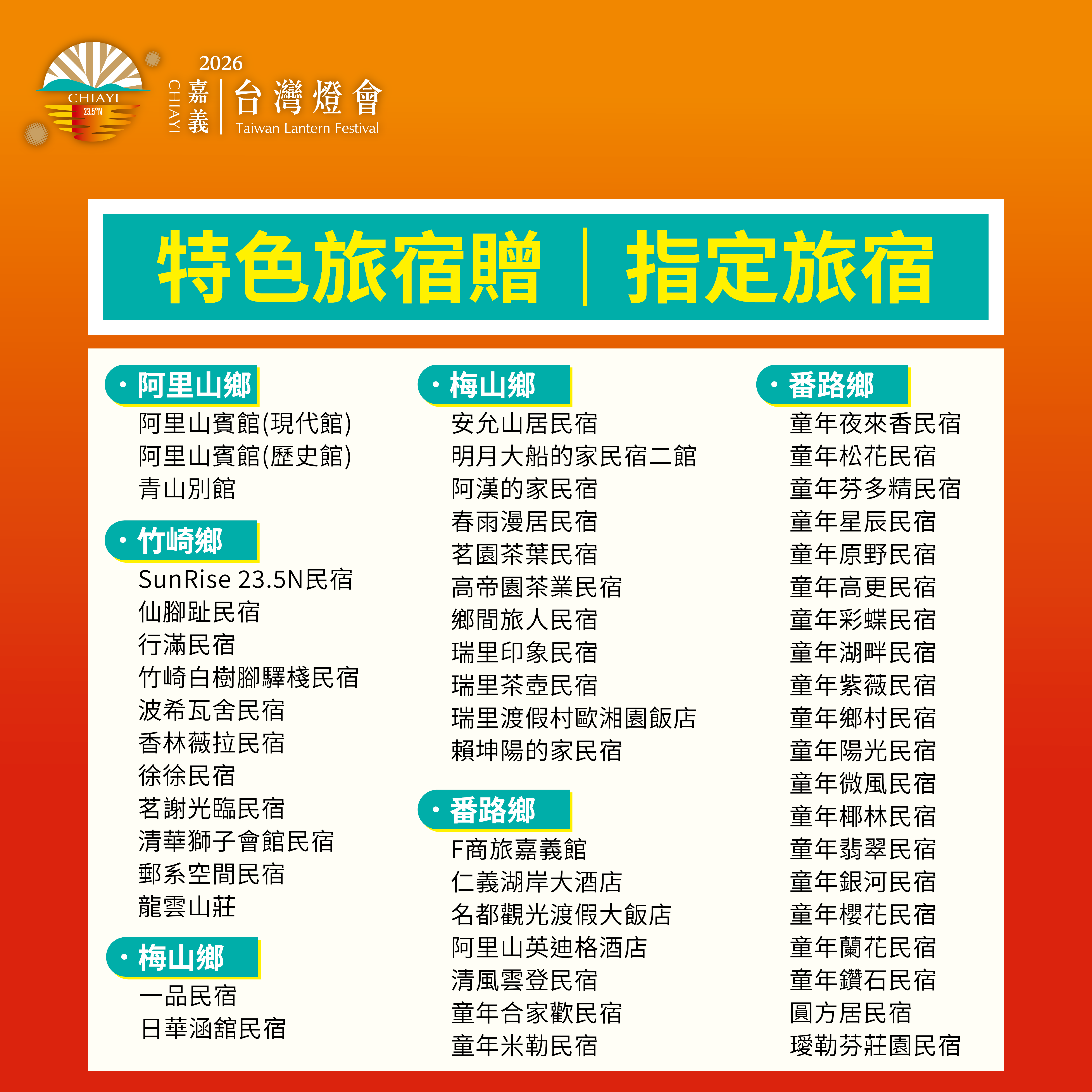 ①遊客於3/2~3/14入住嘉義縣指定合法旅宿(目前共87家,持續募集中)
