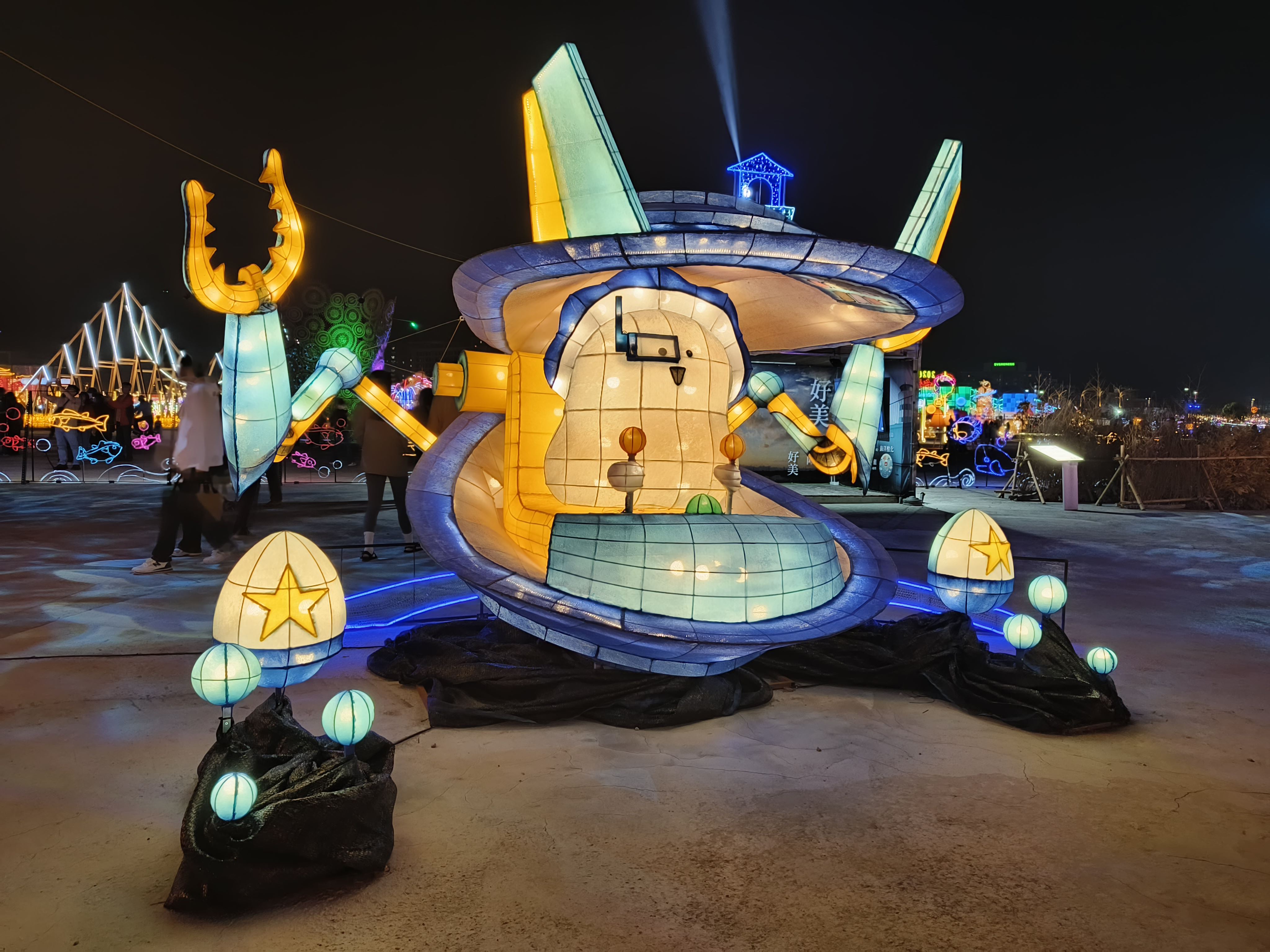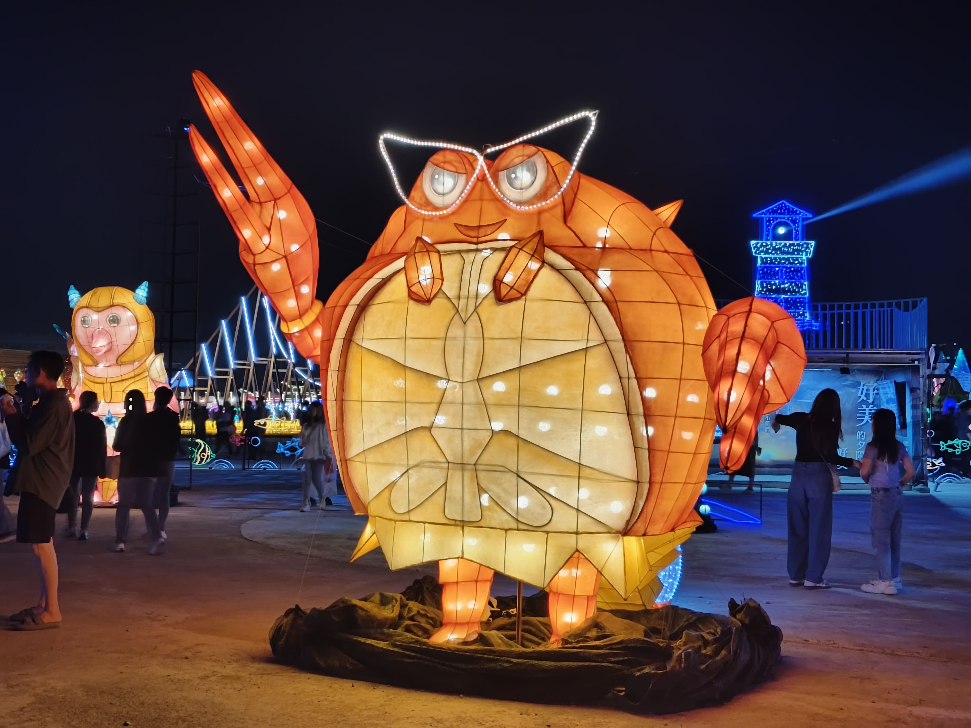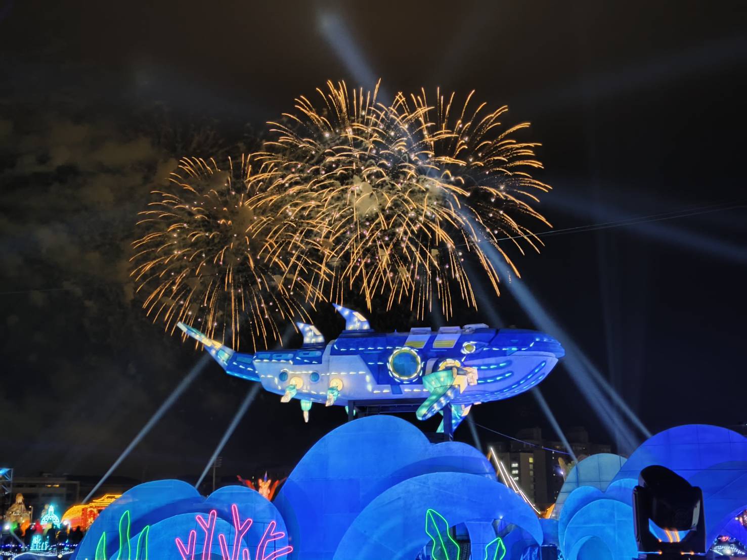 象徵智慧、強大、溫柔、堅定的力量,鯨魚戰艦堅強守護海洋,華麗的燈光雷射特效,沉浸式的海洋音效,聲光效果十足,燈會期間每天晚上6:15-9:45,每30分鐘一場的主燈秀,光彩奪目、絢麗璀璨,超吸睛。