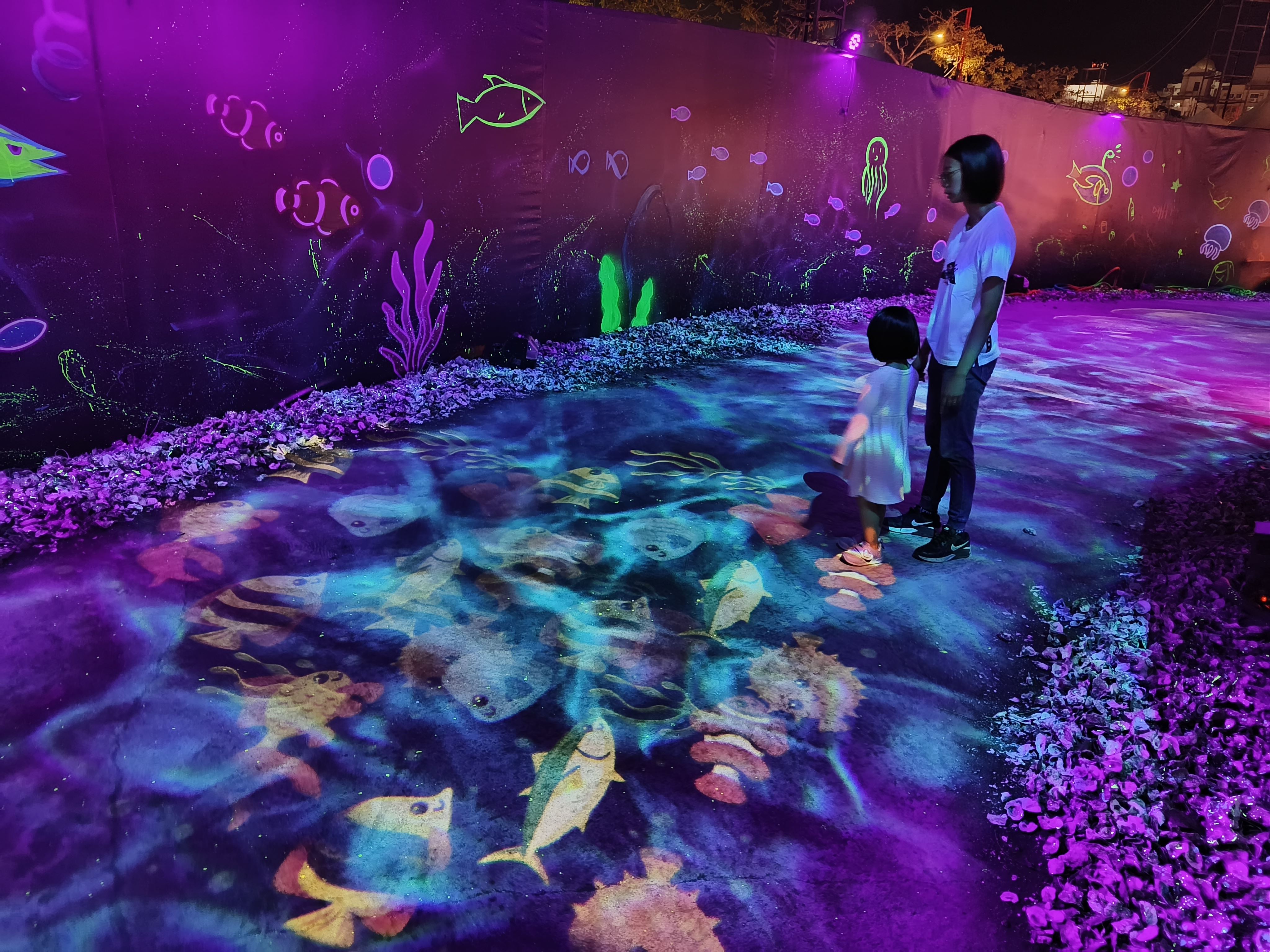 展區內除了大量的海洋生物燈飾之外,還可以看到地上好多彩色的小魚兒在腳下穿梭游來游去,非常有沉浸感。海底隧道不定時噴出的泡泡,更是讓小朋友超級興奮。