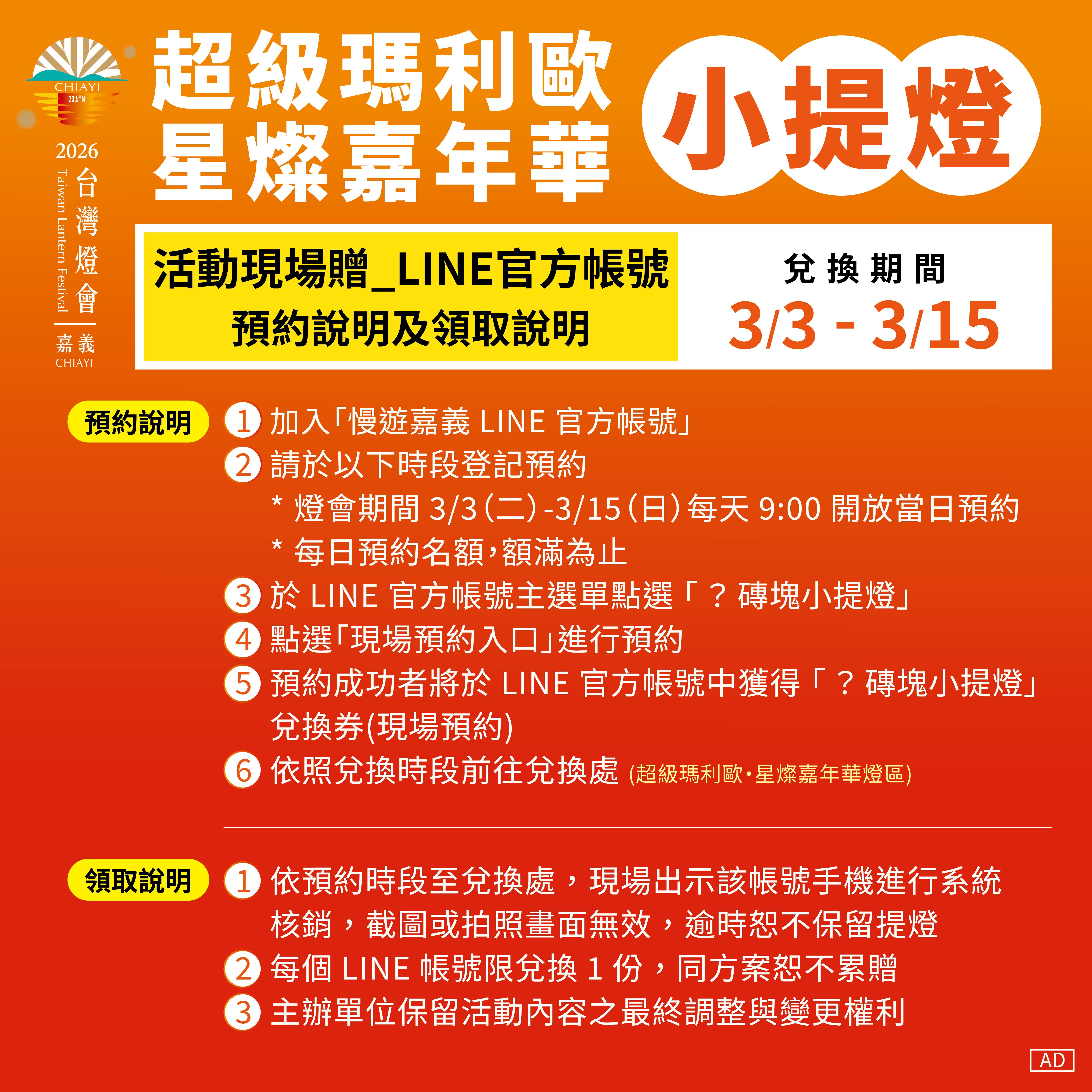 民眾可於「慢遊嘉義LINE官方帳號」進行事前抽籤預約,事前抽籤登記期間為2/12(四)09:00至2/24(二)23:59,於抽籤預約登記期間內,選擇三個時段參加抽籤,也請留意,選擇時段送出後將無法取消或更改,請於登記前先確認好可參加的時段再進行選擇抽籤,結果將於2/25(三)12:00公告。中選者可於3/3至3/15燈會活動期間領取(平日14:00-20:45、假日10:00-20:45),民眾完成抽籤中選後,將獲得活動預約兌換券(每帳號僅1張),而每個LINE帳號 僅限中選1次、兌換1份「?磚塊小提燈」,於燈會活動期間至兌換處「超級瑪利歐·星燦嘉年華燈區」,依預約時段現場核銷領取。民眾須於規定時間內完成現場兌換時段登記,並依時段到場領取,逾時將無法保留提燈數量。 - 活動現場贈(LINE限定)