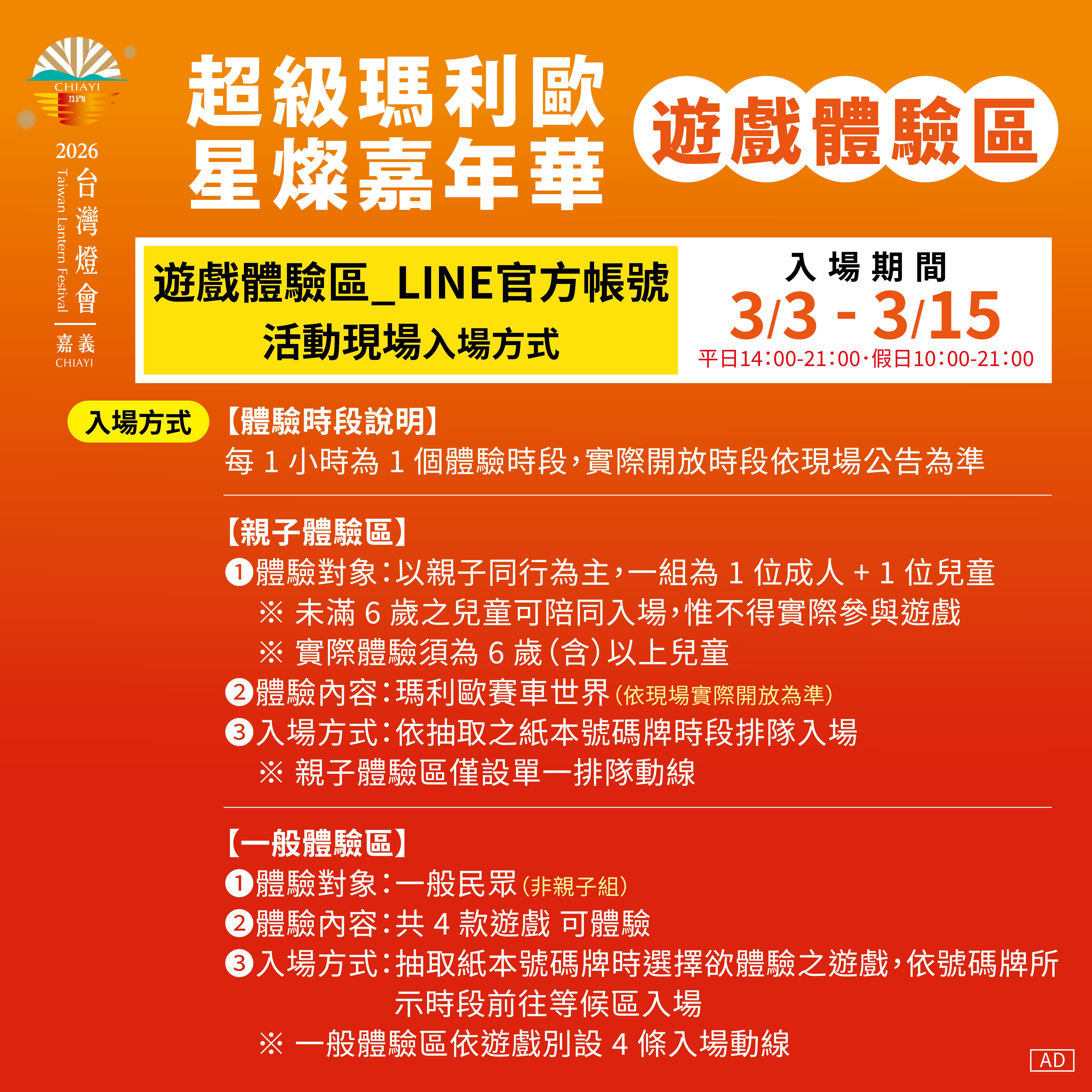 主辦單位表示,活動內容將依現場狀況彈性調整,保留最終變更權利。更多活動、旅遊資訊與「2026台灣燈會×超級瑪利歐・星燦嘉年華」最新消息,請持續「慢遊嘉義LINE 官方帳號」、Facebook及Instagram查詢。