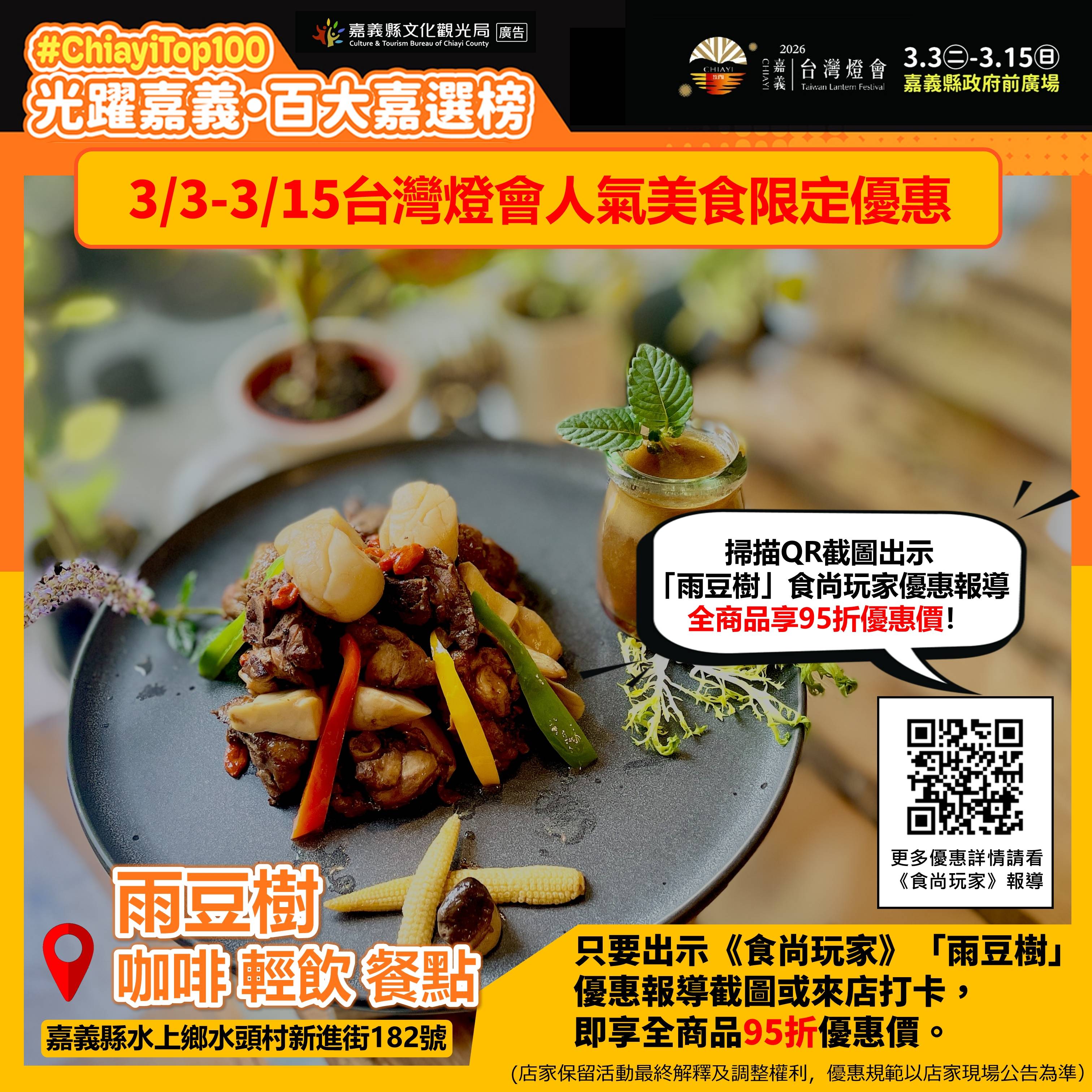 其中,「雨豆樹」凡出示食尚玩家官網優惠報導截圖或來店打卡,即享全商品95折;「品安豆花店」推出豆花品項買十送一,且加購「紅骨仙草凍」僅需銅板價5元(原價10元);「嘉漁海鮮宴餐廳」只要於結帳說出通關密語「2026台灣燈會在嘉義」,可享訂購滿5000元現折300元,未滿5000元亦可現折100元。