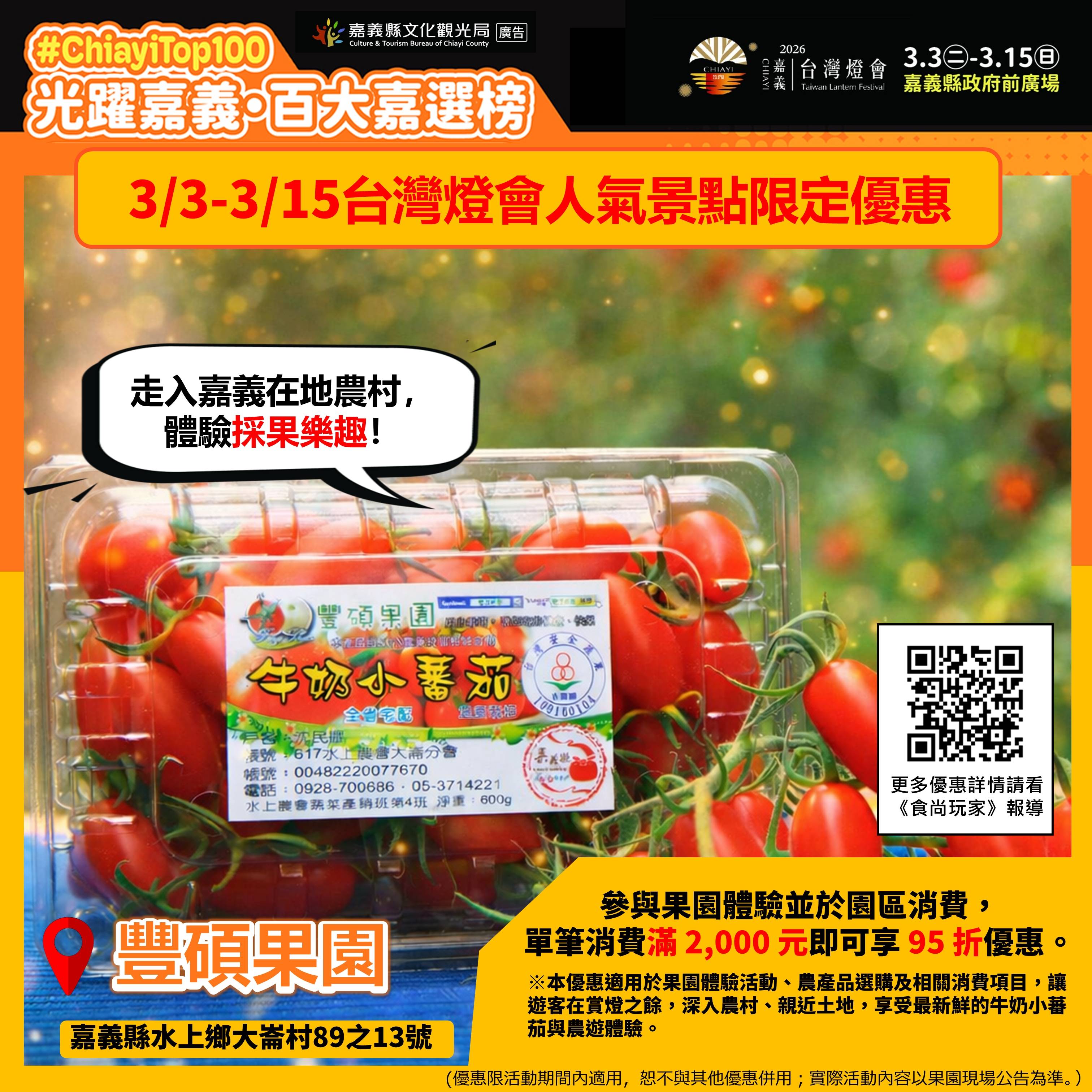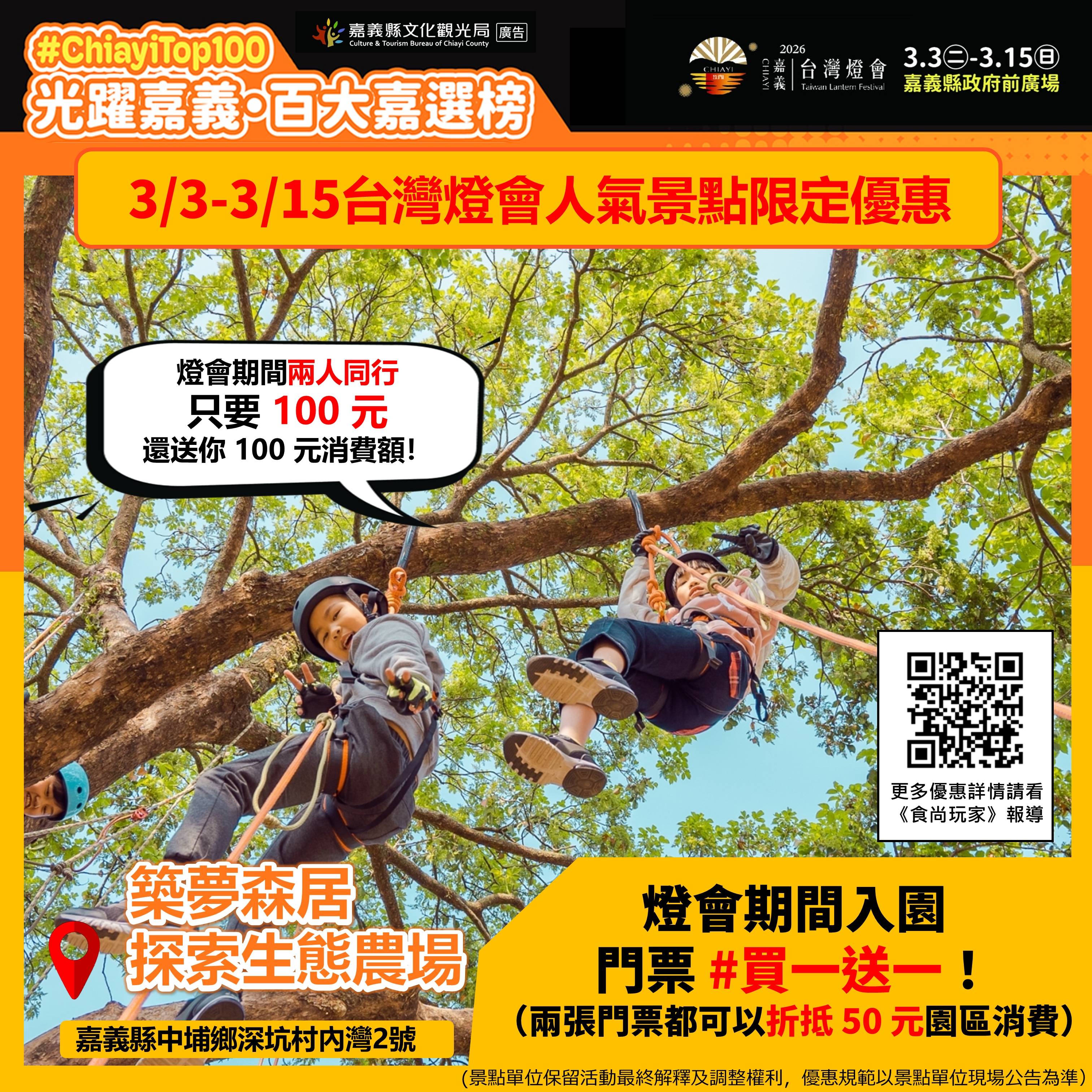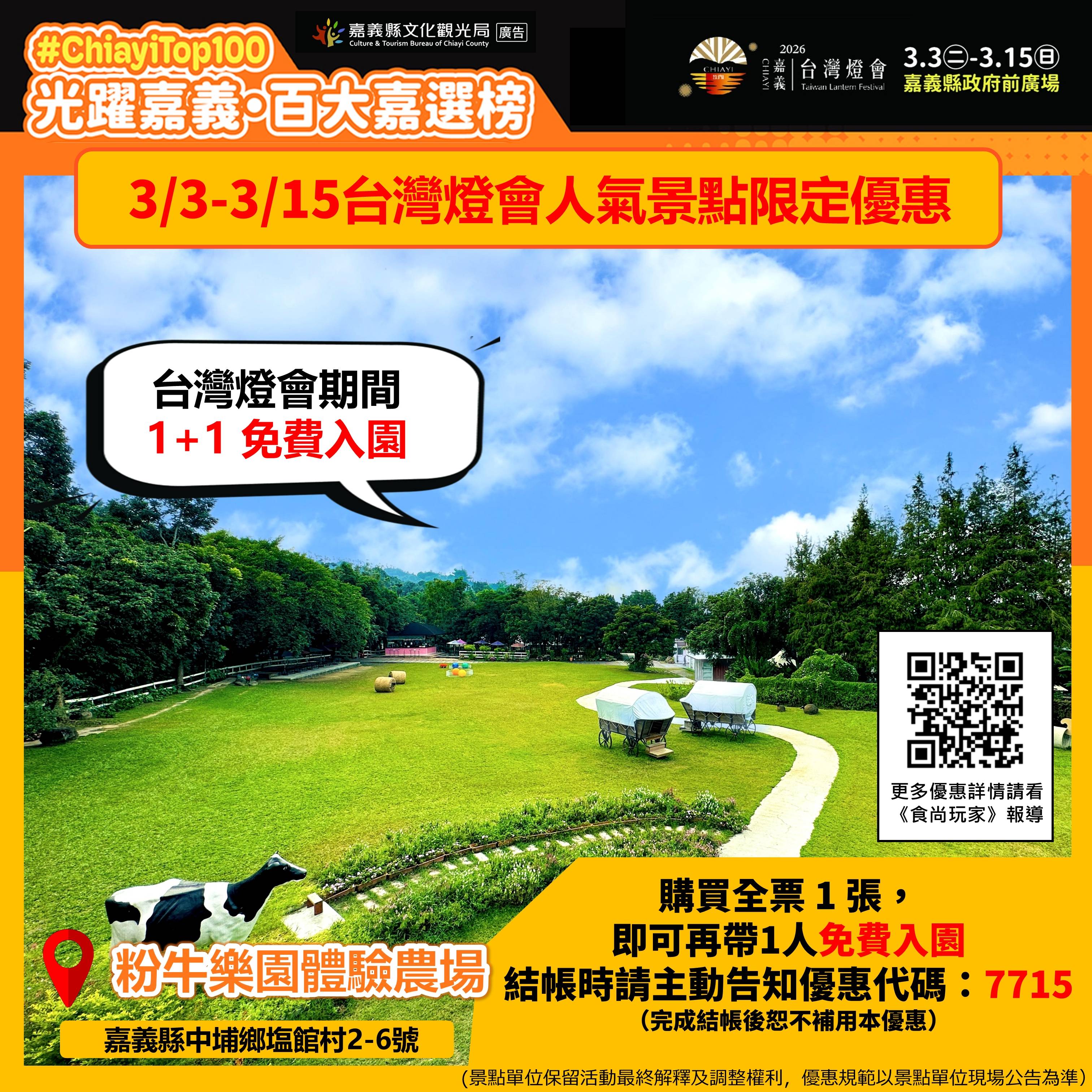 「中埔穀倉農創園區」單筆滿399元贈黑木耳蒟蒻或果乾乙包,並推出燈會限定款禮盒優惠價370元;「粉牛樂園體驗農場」於台灣燈會期間推出全票1+1優惠,購買全票1張即可再帶1人免費入園,結帳時主動告知優惠代碼「7715」即可享優惠。