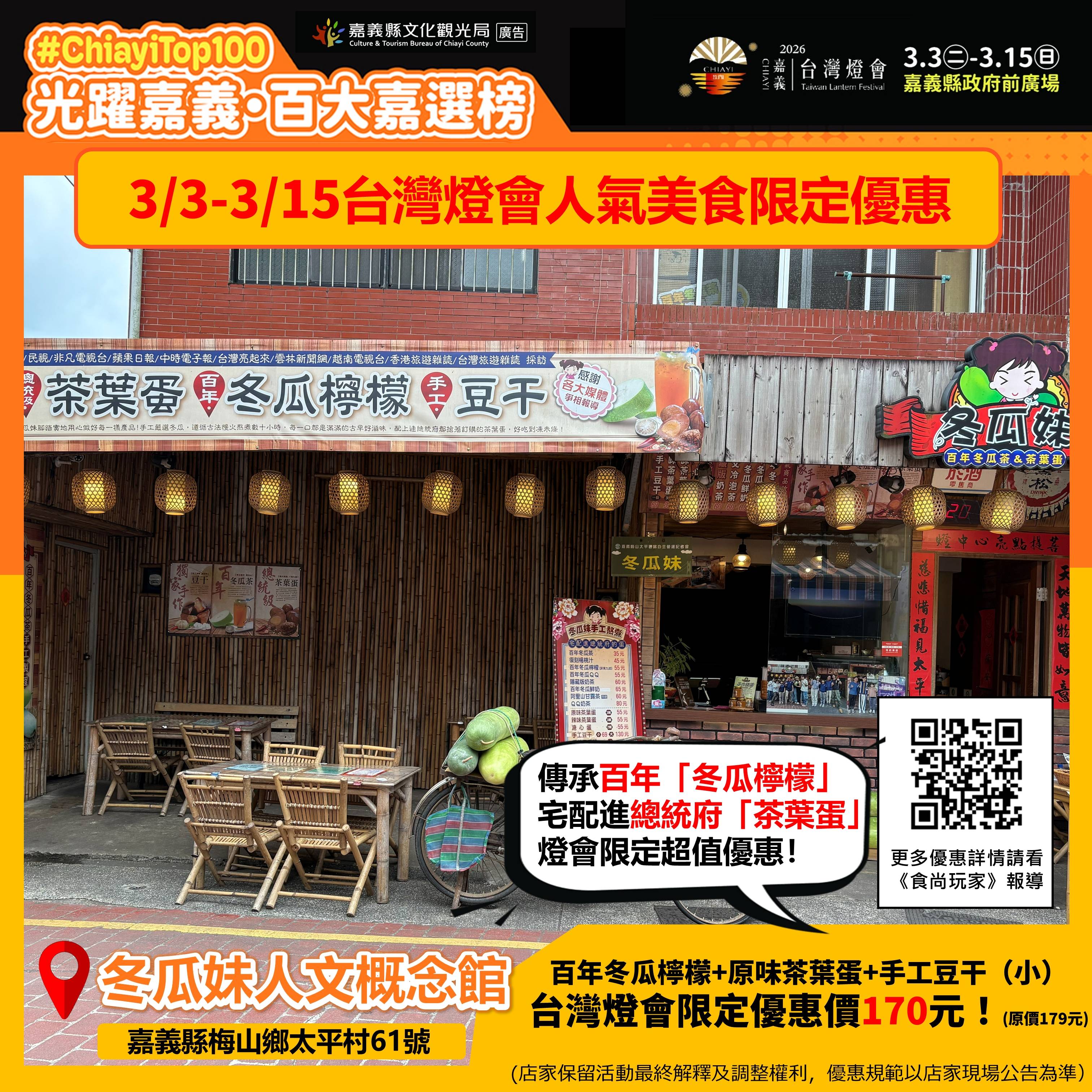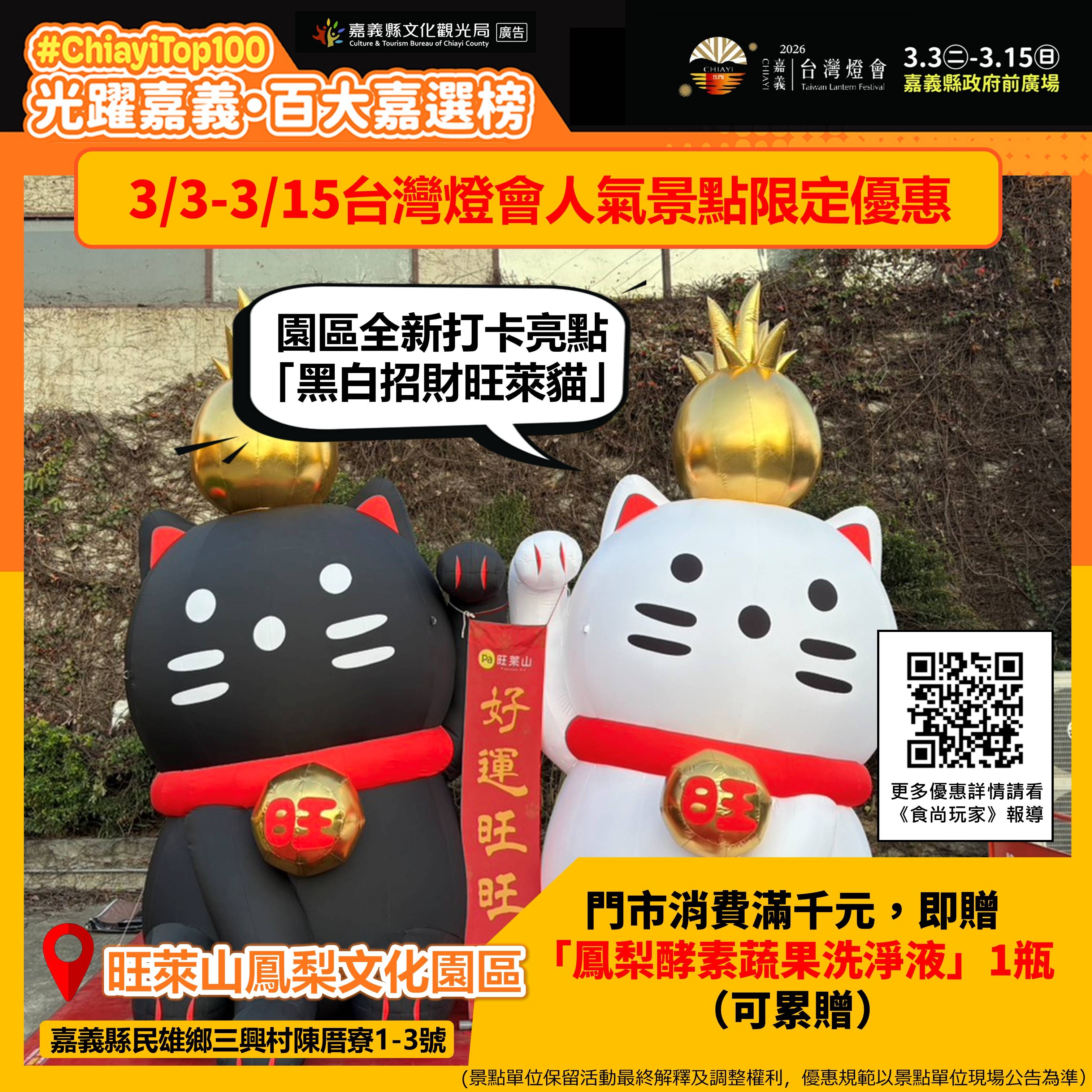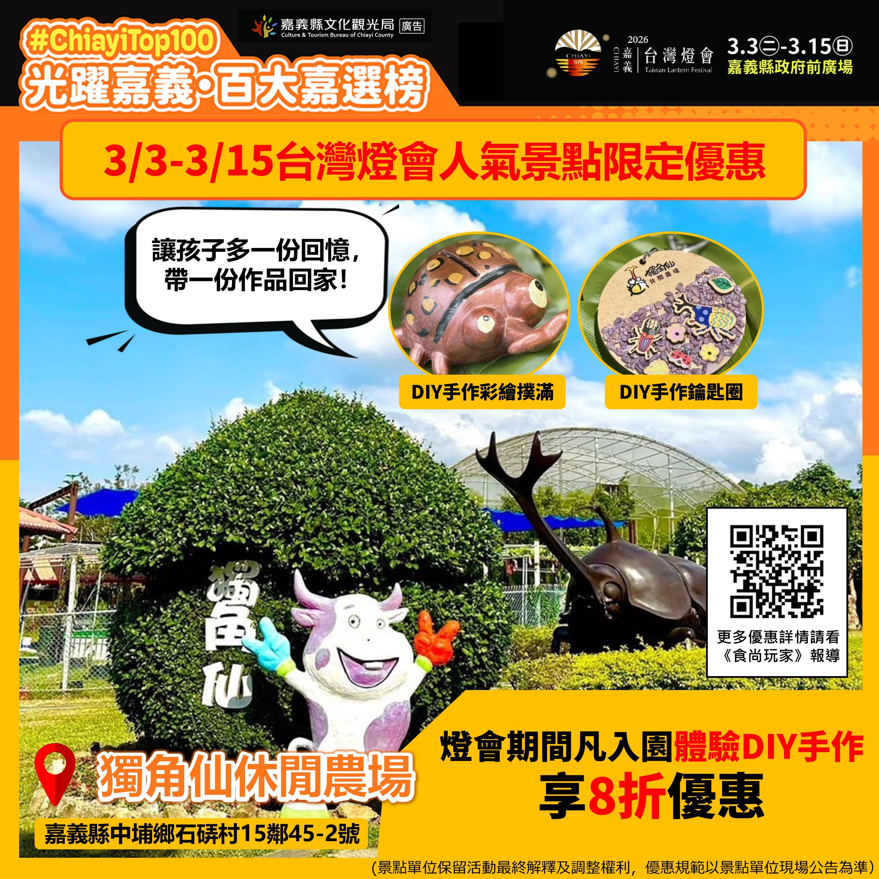 2026台灣燈會3月3日登場,為讓遊客在賞燈之餘能深入體驗在地的飲食風土與人情溫度,嘉義縣文化觀光局特別聯手「光躍嘉義.百大嘉選榜」獲獎的十大人氣美食與景點,共同推出「燈會期間限定優惠」,包含門票買一送一、餐飲折扣、滿額送好禮等多樣優惠方案,邀請全民來嘉義開啟一場好吃、好玩又超值的賞燈旅程。