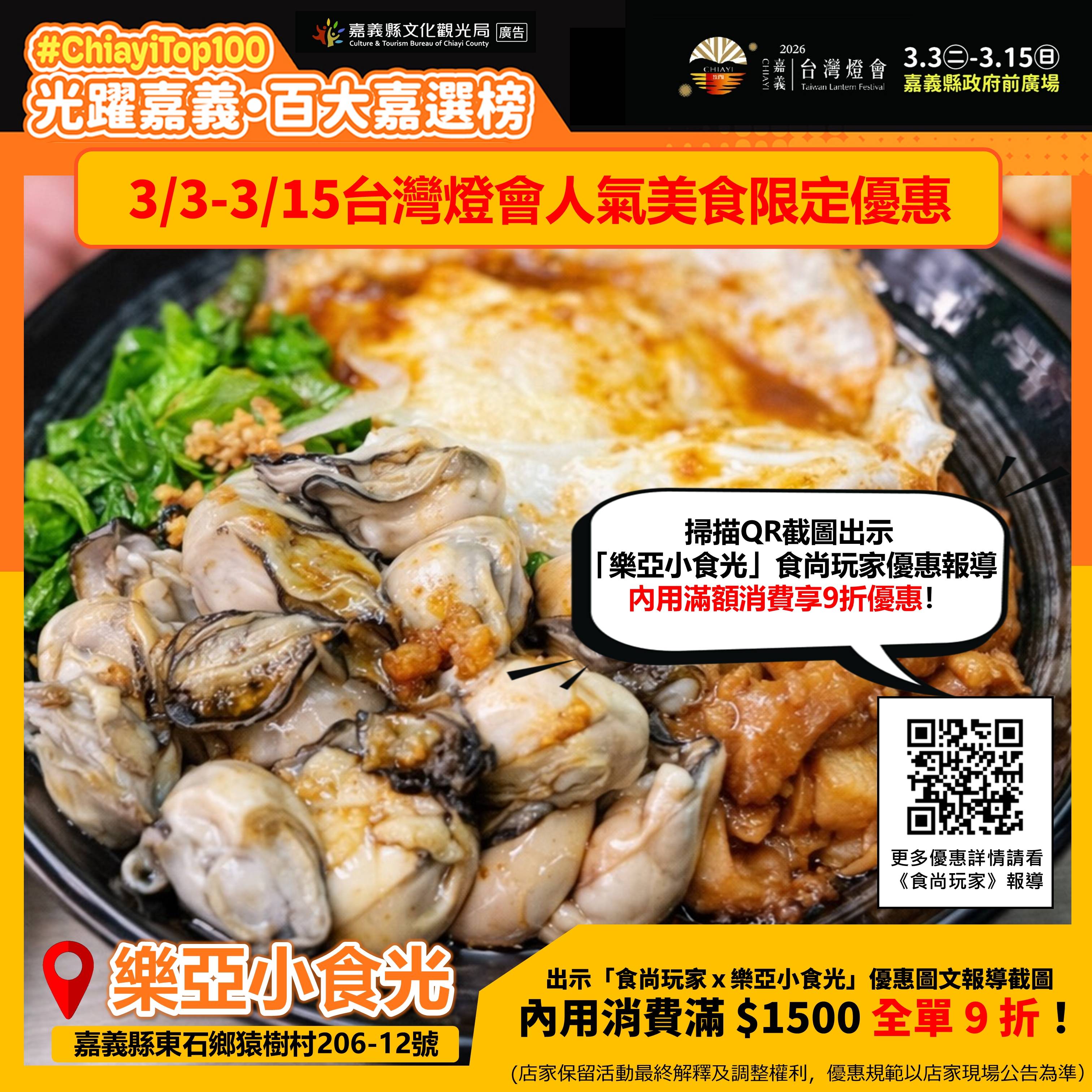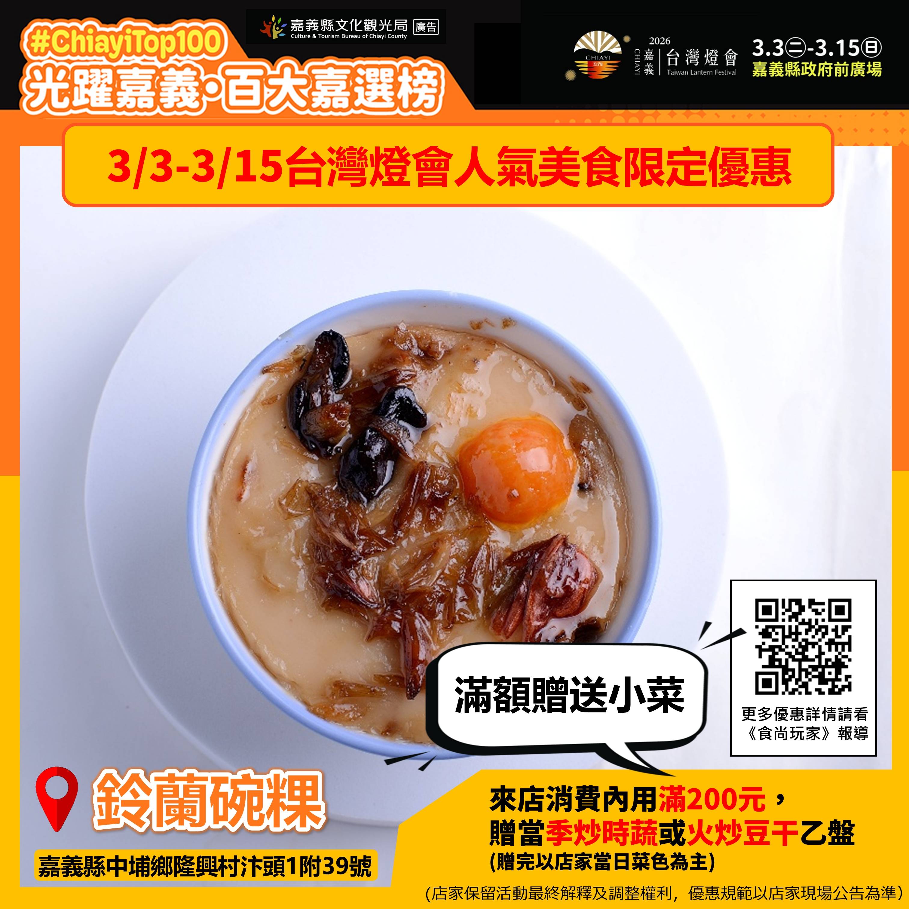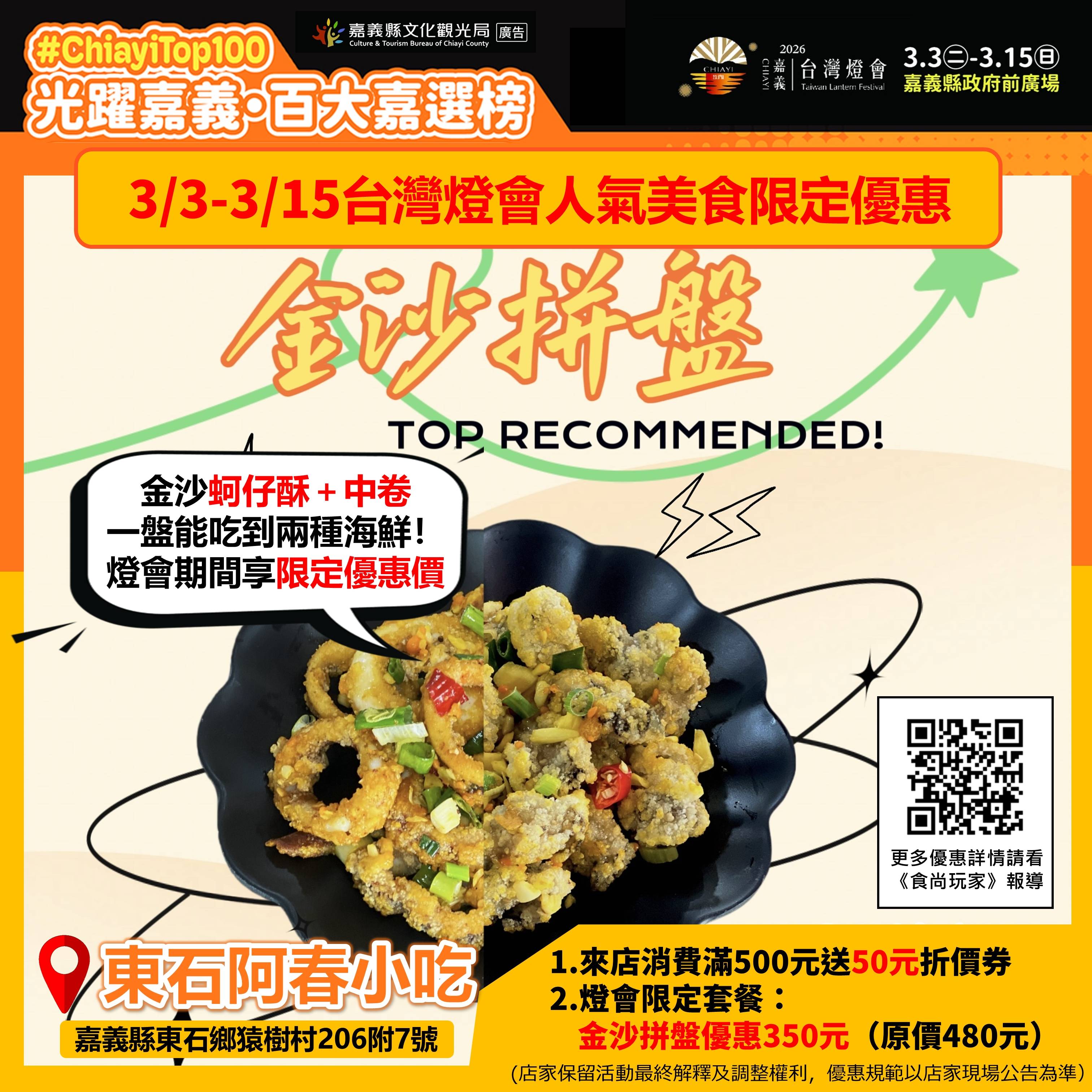 「竹香園甕缸雞嘉義店」於粉專指定貼文留言「2026看燈會必吃嘉義百大美食」即贈招牌山菜一盤;「鈴蘭碗粿」內用滿200元贈當季炒時蔬或火炒豆干乙盤;「東石阿春小吃」單筆滿500元送50元折價券,且享金沙拼盤優惠價350元(原價480元)。