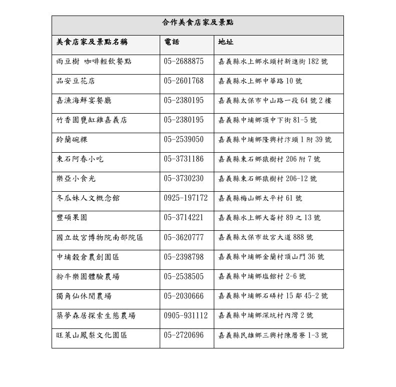 美食店家包括「雨豆樹」、「品安豆花店」、「嘉漁海鮮宴餐廳」、「竹香園甕缸雞嘉義店」、「鈴蘭碗粿」、「東石阿春小吃」、「樂亞小食光」及「冬瓜妹人文概念館」等店家皆推出專屬優惠。