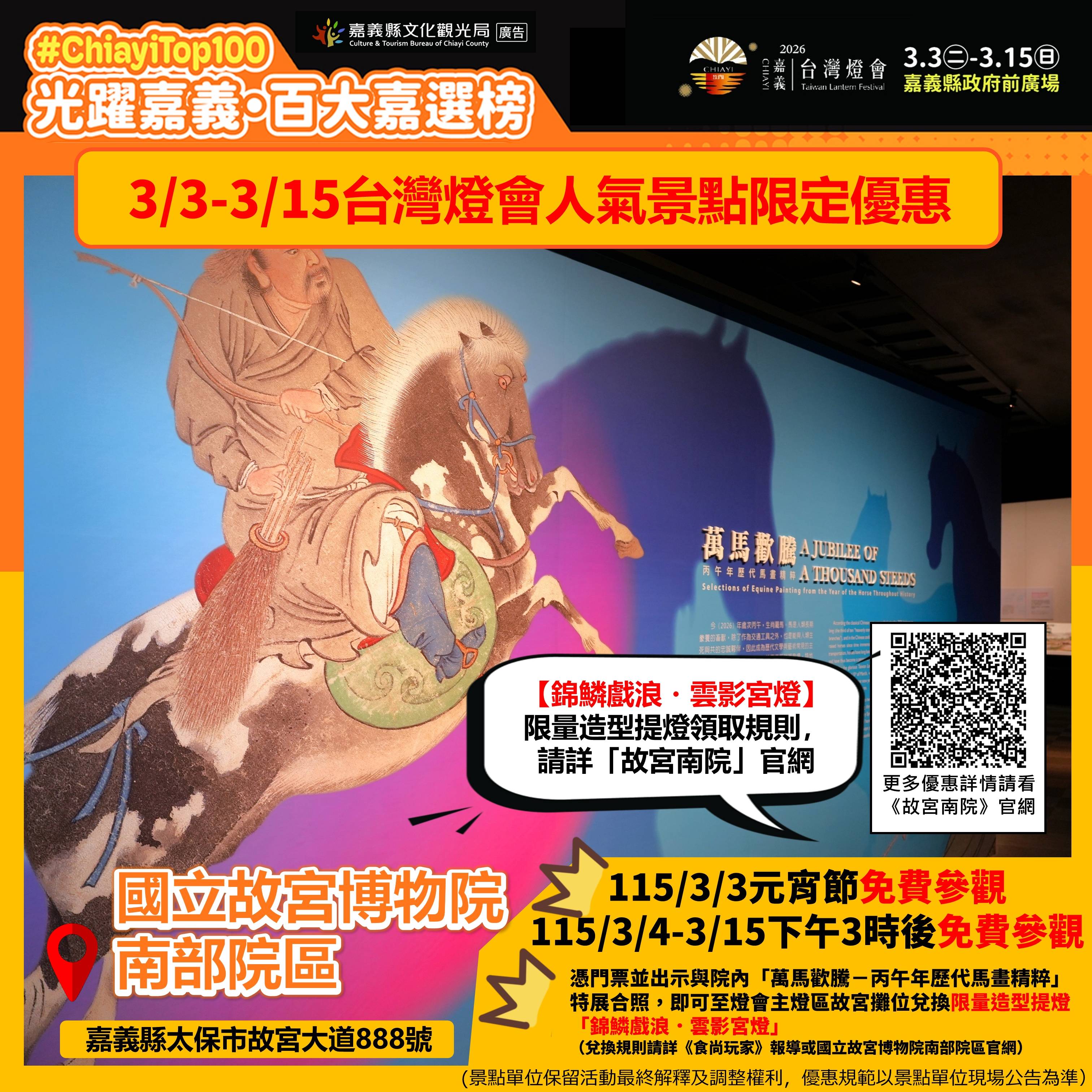 景點優惠內容同樣豐富,於燈會期間,「豐碩果園」單筆消費滿2000元享95折;「國立故宮博物院南部院區」響應燈會,3月3日元宵節全天免費參觀,3月4日至15日每日15:00後免票入館,持門票與「萬馬歡騰」特展合照還可至燈會公益攤位兌換限量「錦鱗戲浪.雲影宮燈」。