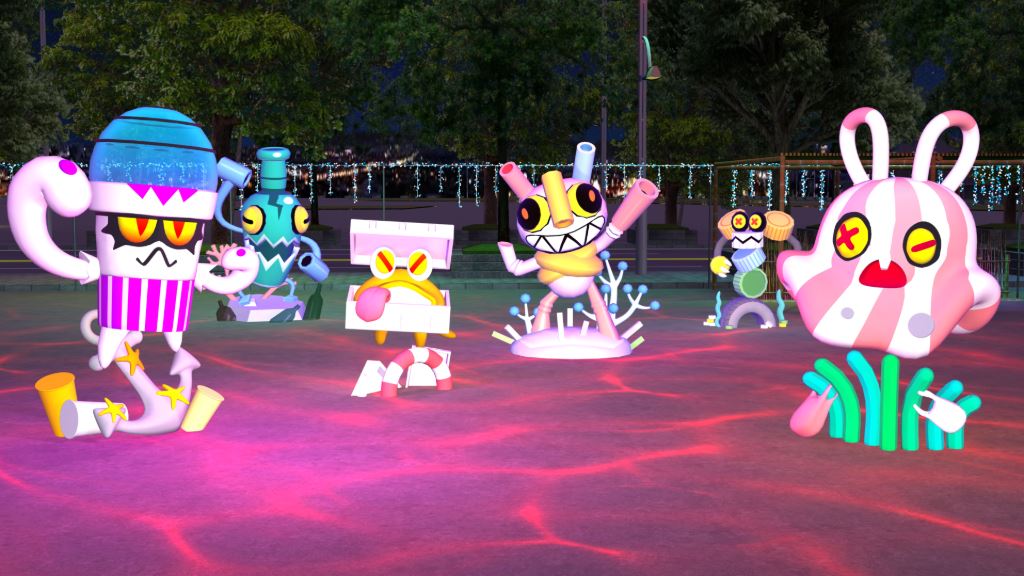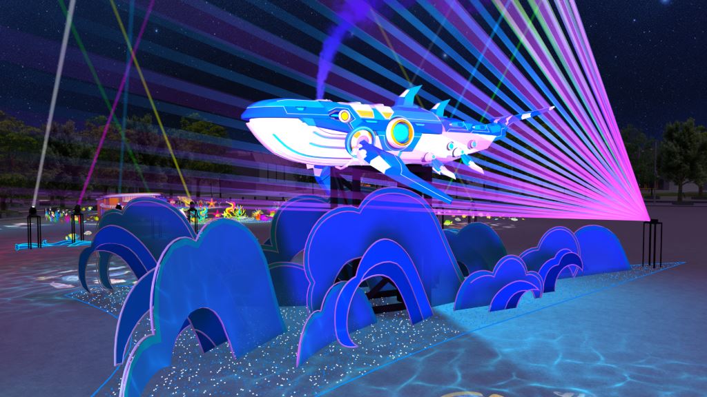 在2-3層樓高的夜空中,主燈機械鯨魚戰艦於夜空中啟航,以未來感十足的身軀與光影,領航全區視覺焦點,也象徵守護海洋生態的核心力量,主燈秀將於每日晚間18:15-21:45,每30分鐘展演一次。