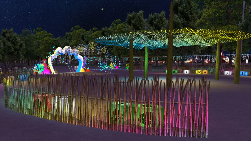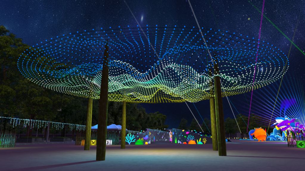 從「海洋之心」進入「永續海洋燈區」,穿越「蚵棚之境」,沉浸在「海底隧道」中,加入「英雄戰將」的行列對抗「海廢怪」,「環海戰艦」宣示共同守護海洋的決心,「等鱟站」期待未來在嘉義的海灘,能與野生小鱟們來一場浪漫邂逅。