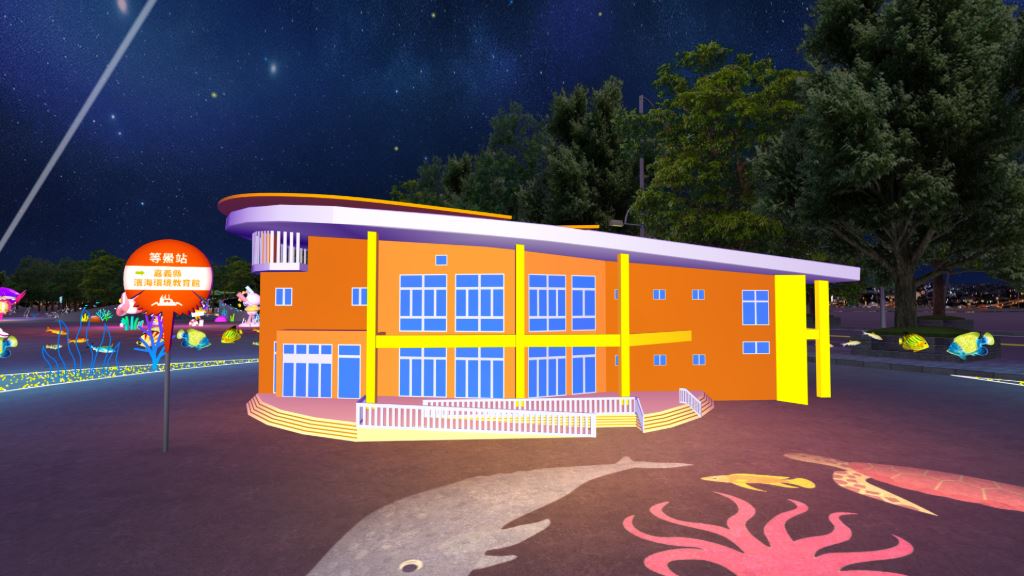 「等鱟站」以嘉義縣濱海環境教育館為藍圖,結合鱟造型的設計,周邊以豐富的海洋環境燈飾襯托環境教育館,象徵守護美麗海岸線及生態復育的期待。