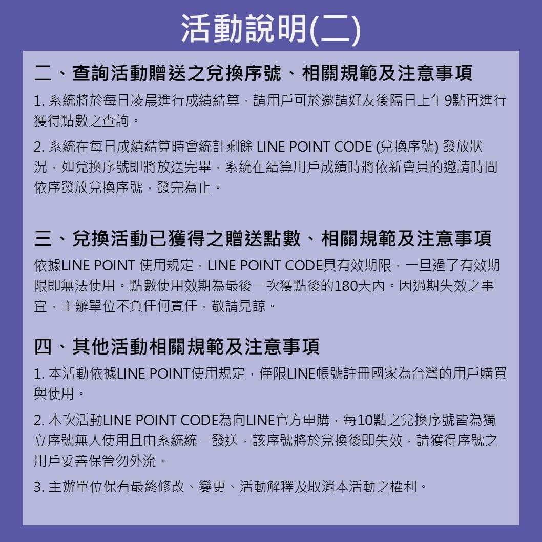 「三五好友加LINE送好禮」活動於26日開跑,民眾邀請3位好友加入「慢遊嘉義」,即可獲得20點LINE POINTS點數,5位好友加入最高可獲得50點;此外,活動還特別加碼舉辦「邀約好友累計數排行榜」,3月底結算統計排名前10名之用戶,可額外獲得100點,最高可獲得150點。