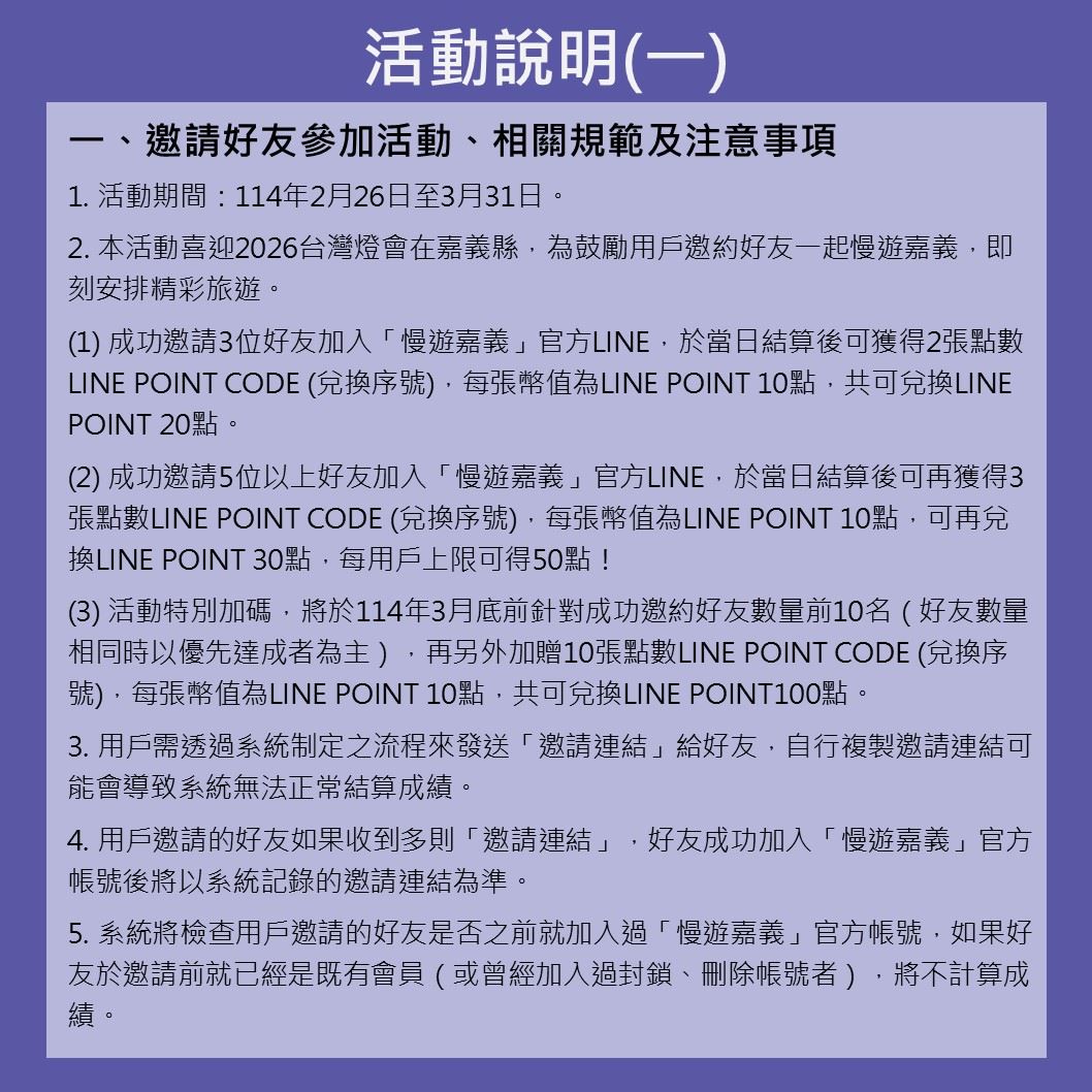 為迎接2026台灣燈會在嘉義縣,文觀局準備送出10萬點LINE POINTS,民眾只要邀請朋友加入「慢遊嘉義」LINE官方帳號,即可輕鬆獲得點數。