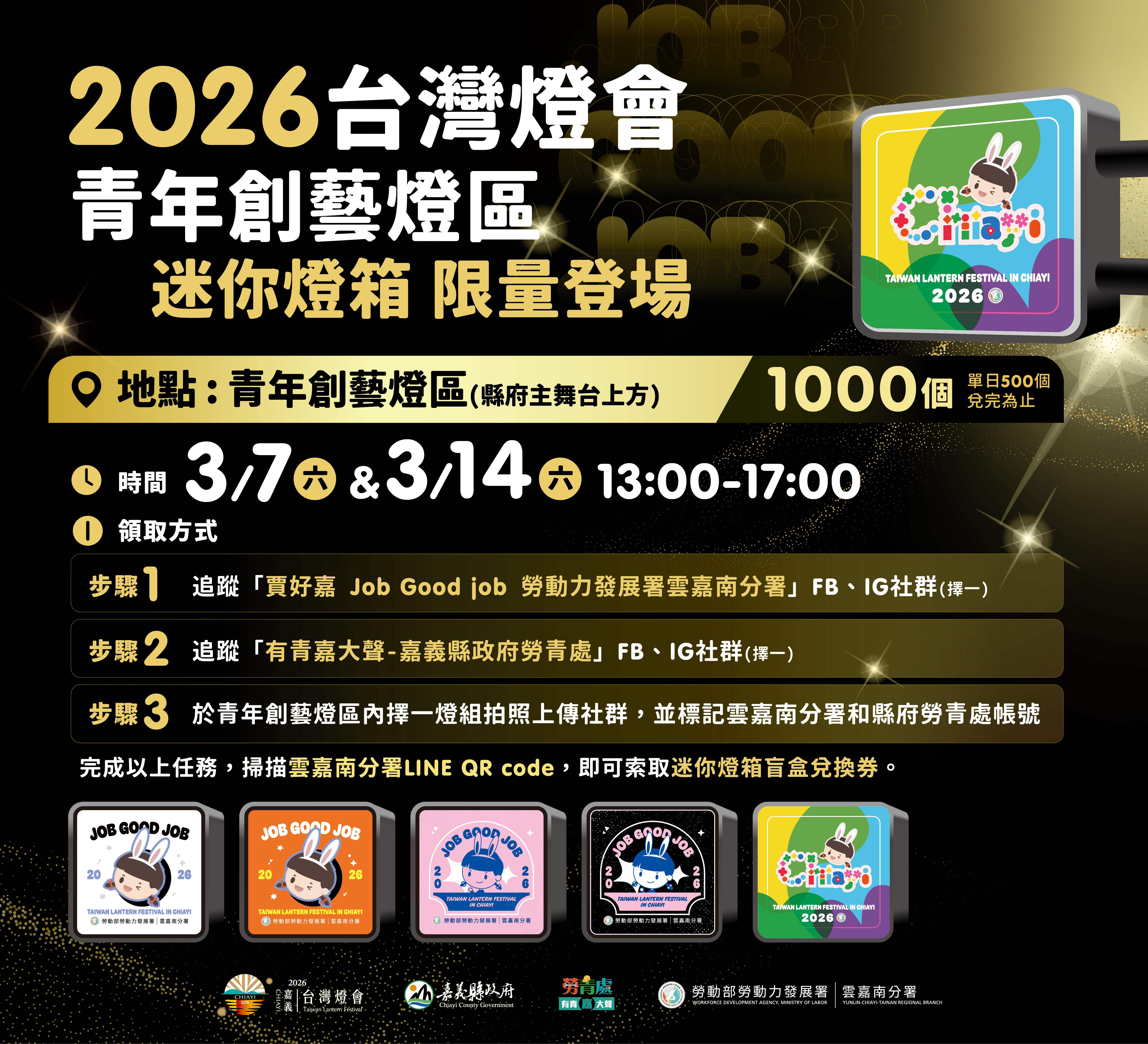 勞工暨青年發展處「青年創藝燈區」推出限定「迷你燈箱」,3月7日(六)及3月14日(六)13:00至17:00在該燈區以「盲盒形式」發送,一天發送500份,款式隨機、驚喜滿滿,只要完成以下步驟,即可把迷你燈箱帶回家。