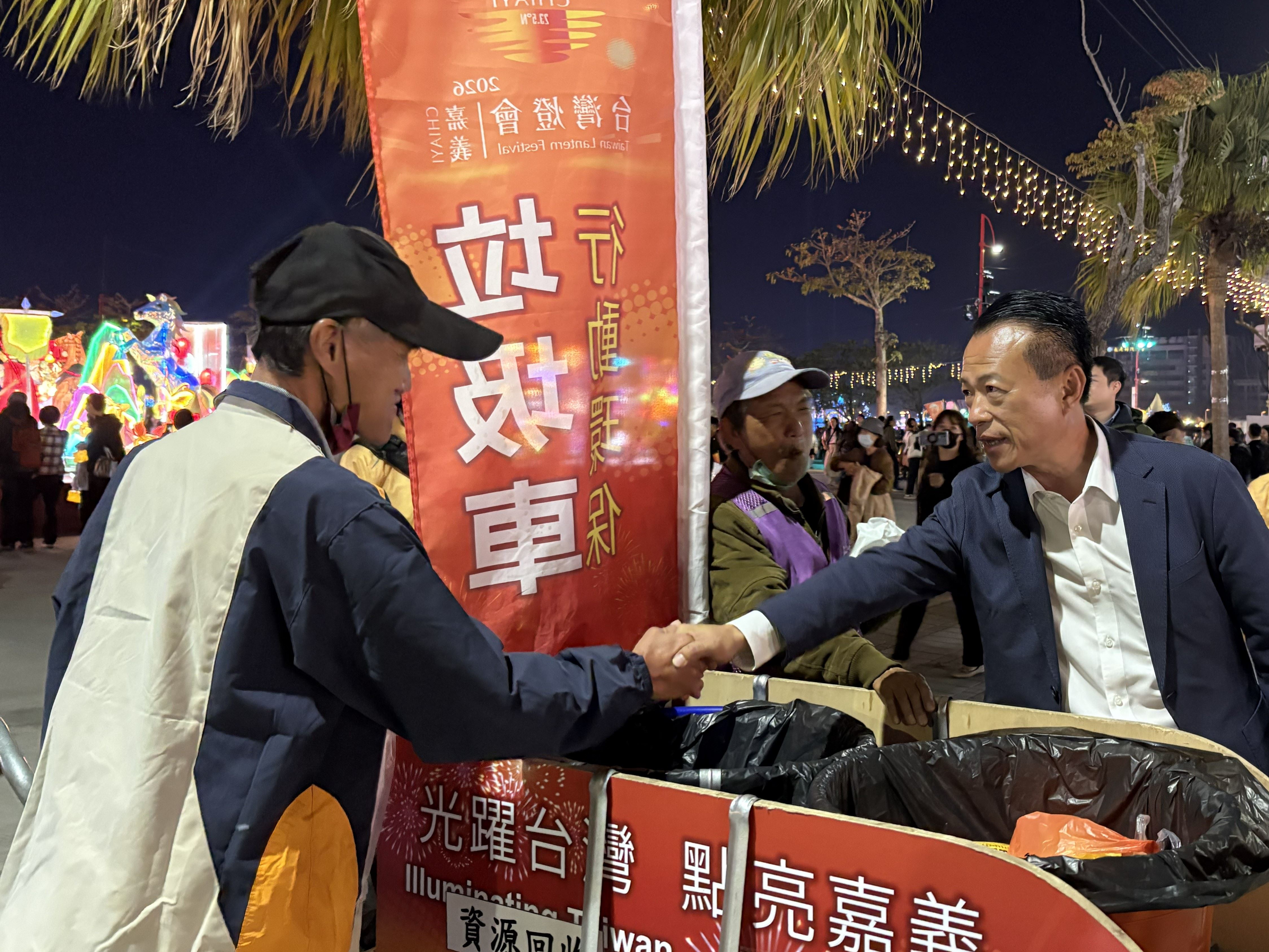 2026台灣燈會今(15)日圓滿落幕。今年燈會展區幅員遼闊、整體工作量龐大,但在場地清潔與現場服務品質方面,獲得民眾一致肯定與讚揚。嘉義縣長翁章梁在燈會最後一天特別走訪各燈區,親自向第一線服務的工作人員表達慰問與感謝。