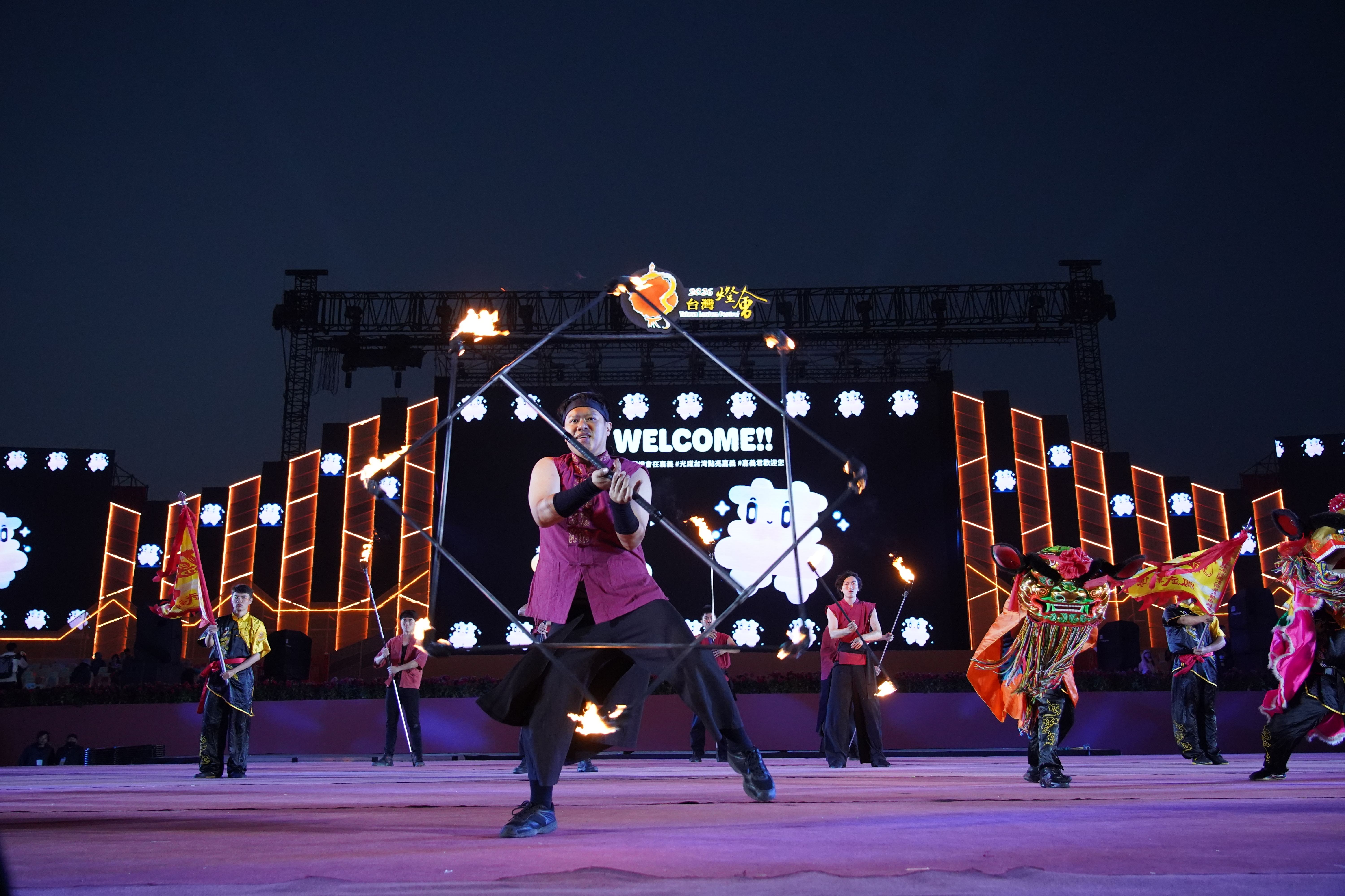 今邀請雲火INFERNO火舞團結合西螺鳳山館與新竹交響管樂團,透過火舞光影、宋江陣與現場演奏交織,營造震撼視聽饗宴;朴子夜光龍獅戰鼓團融合傳統武藝與夜光視覺,展現在地文化的科技轉化;並由韓國擊光打擊樂團及法國Remue Ménage夜光馬戲團共襄盛舉。