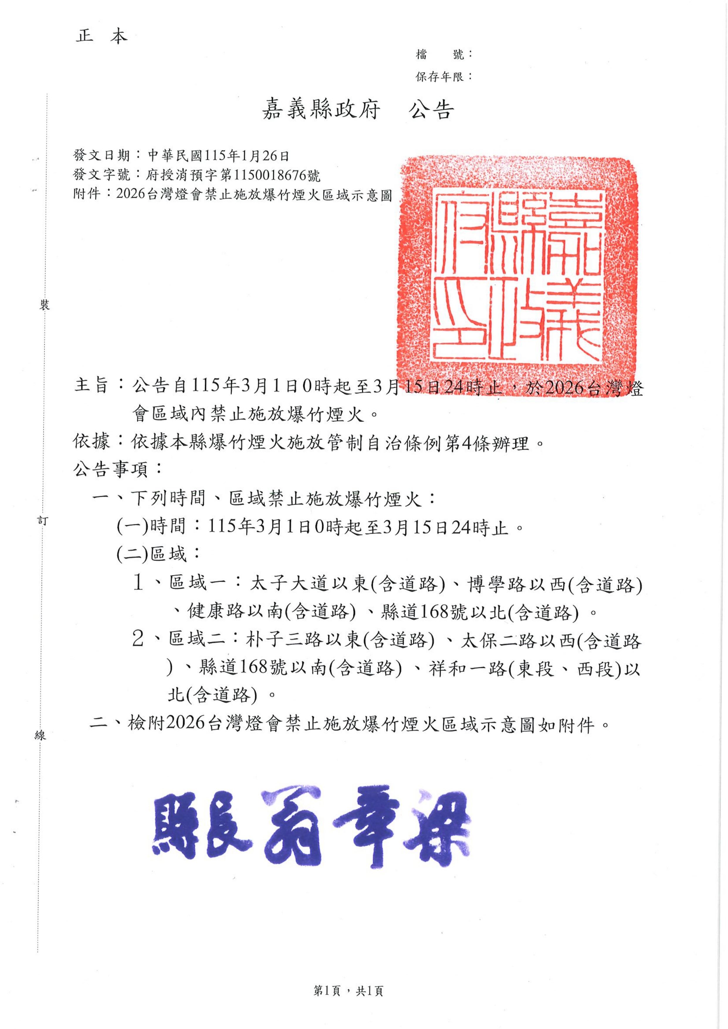 公告自115年3月1日0時起,至3月15日24時止,2026台灣燈會區域內禁止施放爆竹煙火。