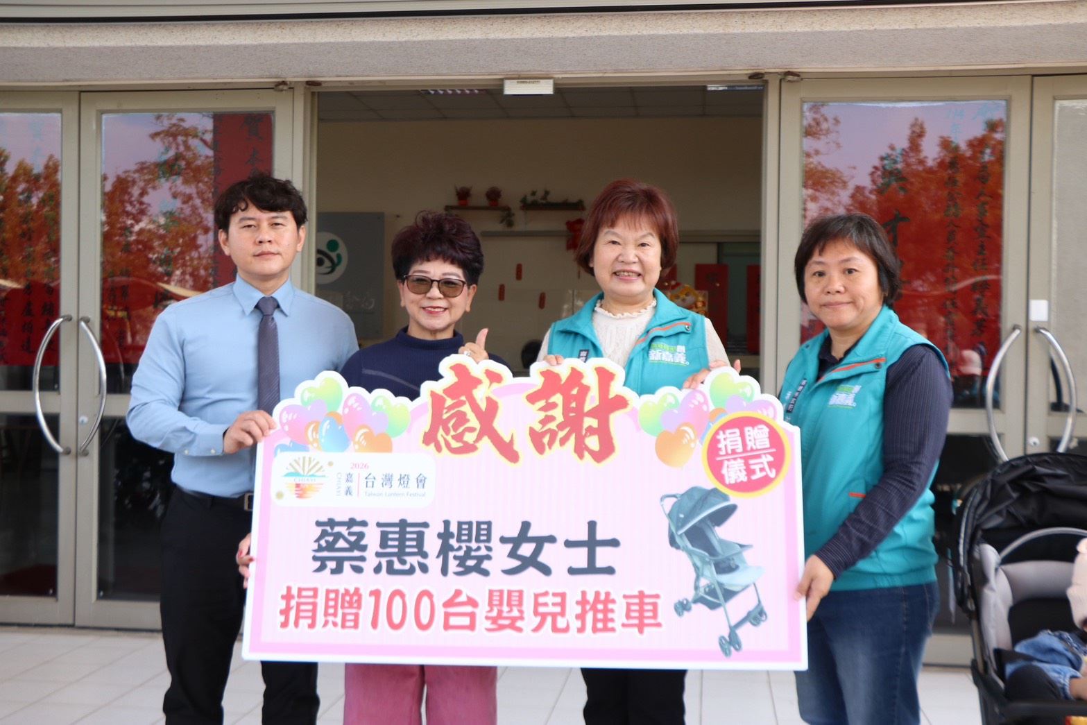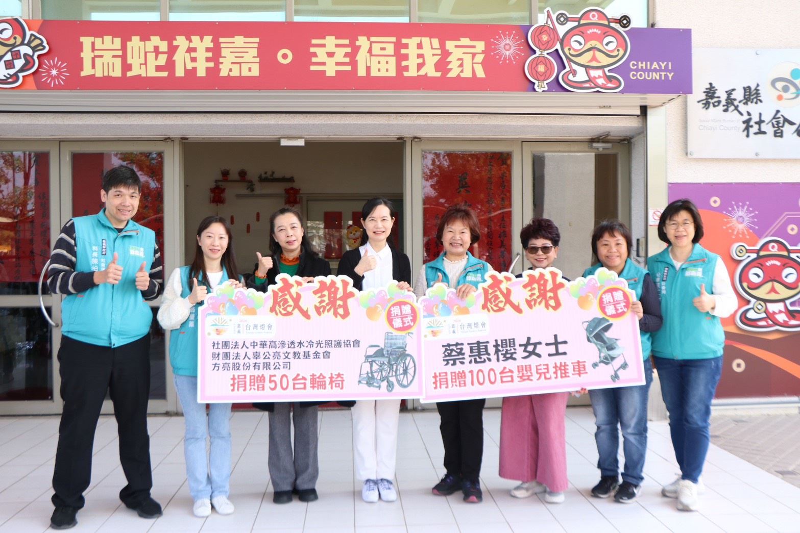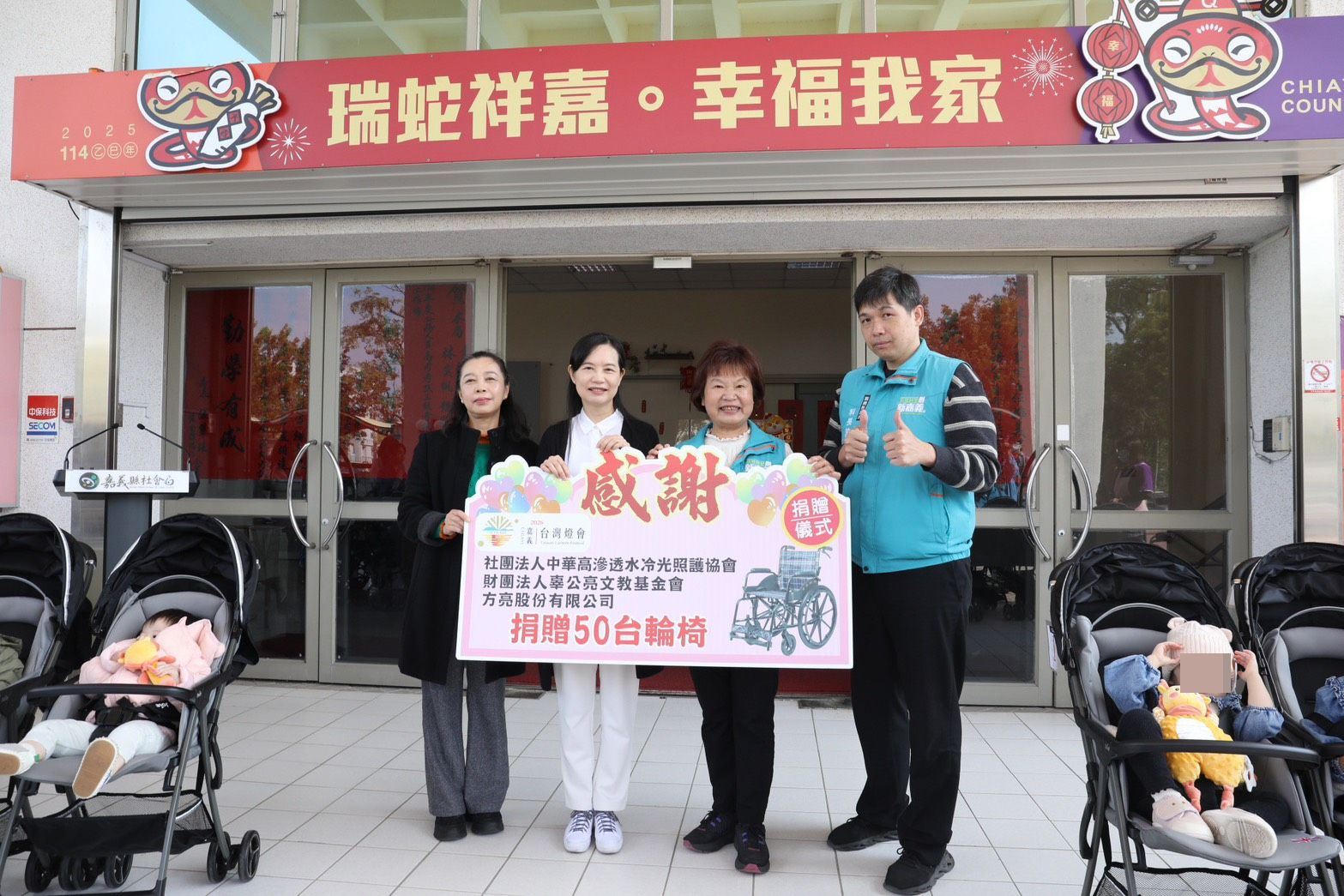 嘉義縣社會局今5日舉行「2026台灣燈會輪椅及嬰兒推車聯合捐贈儀式」,社團法人中華高滲透水冷光照護協會媒合財團法人辜公亮文教基金會及方亮股份有限公司捐贈50台輪椅,仁義湖岸大酒店董事長蔡惠櫻同時捐贈100台嬰兒推車,提供燈會期間身障者、行動不便長輩及育兒家庭更方便、安心的友善環境。