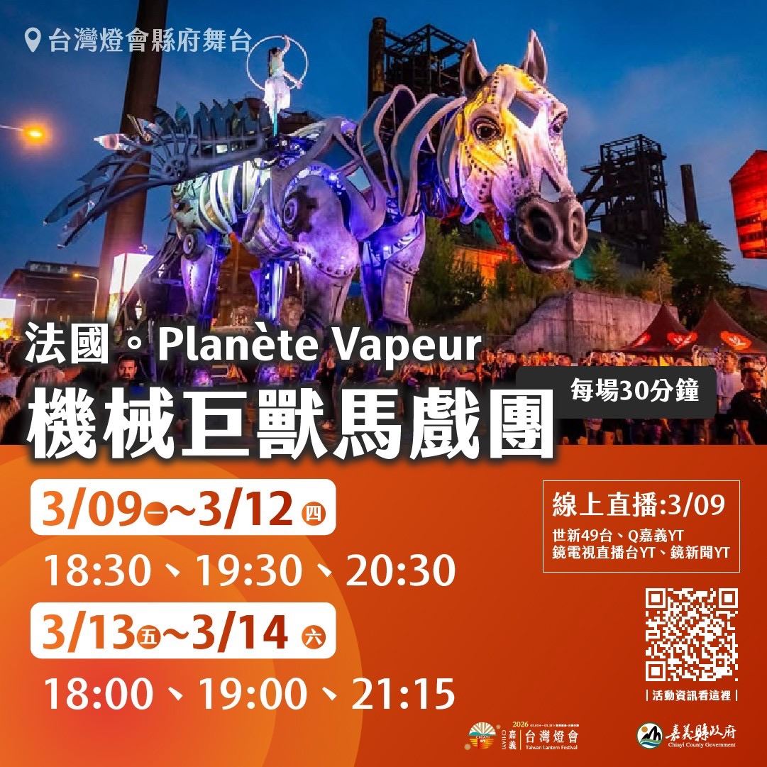 18:30 - 21:00|法國。Planète Vapeur機械巨獸馬戲團|(每60分鐘一場,每場30分鐘,縣府舞台正對面,3/9線上直播)