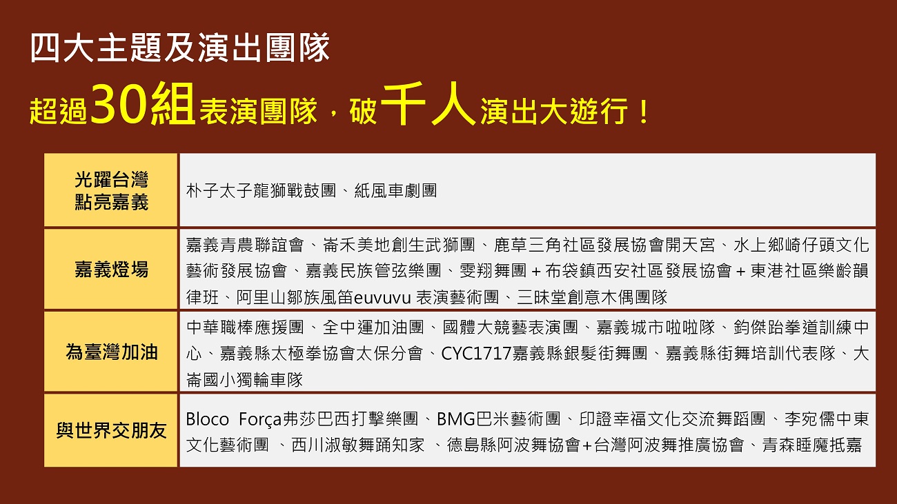 遊行內容橫跨台灣在地文化、表演藝術與國際交流,包含紙風車劇團大型行動裝置演出、嘉義在地社區與表演團隊、運動與青春應援隊伍,以及來自日本、巴西、印尼、中東等多國藝術團體,讓觀眾在一場遊行中看見多元文化交會的精彩瞬間。夜色中燈籠流轉、鼓樂齊鳴,街道化身為流動的舞台,邀請民眾一同走進燈光與世界共舞的嘉義。