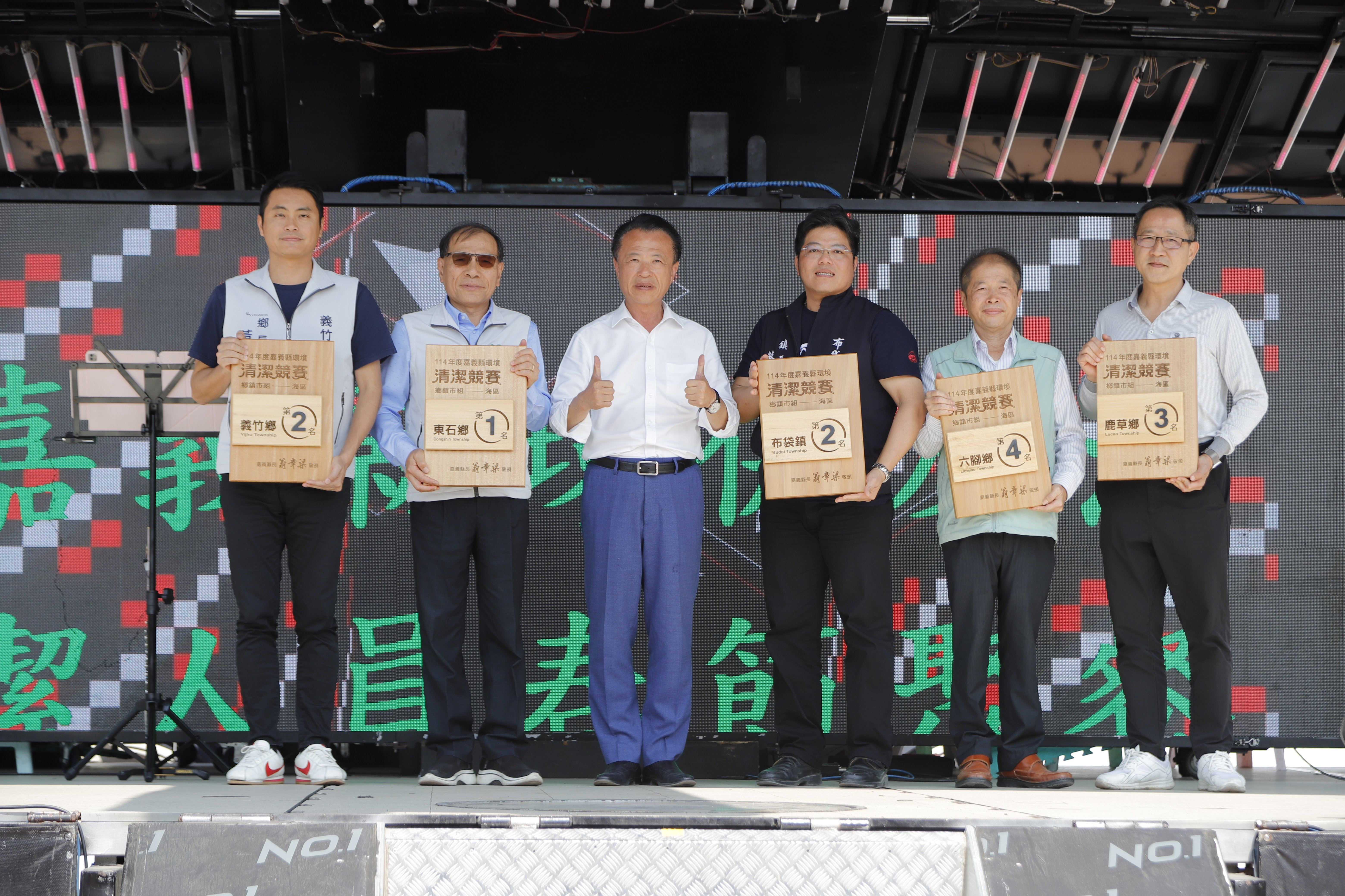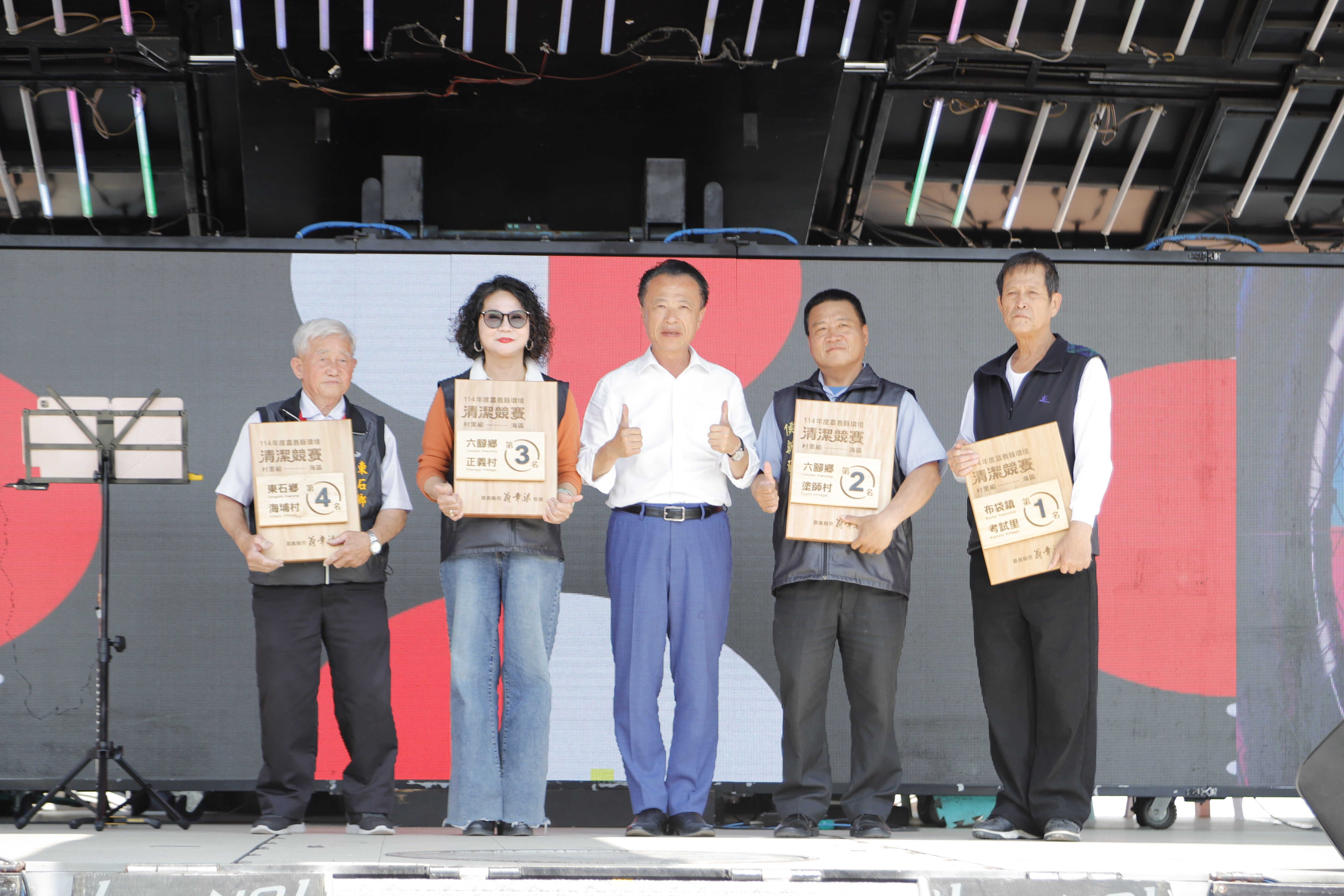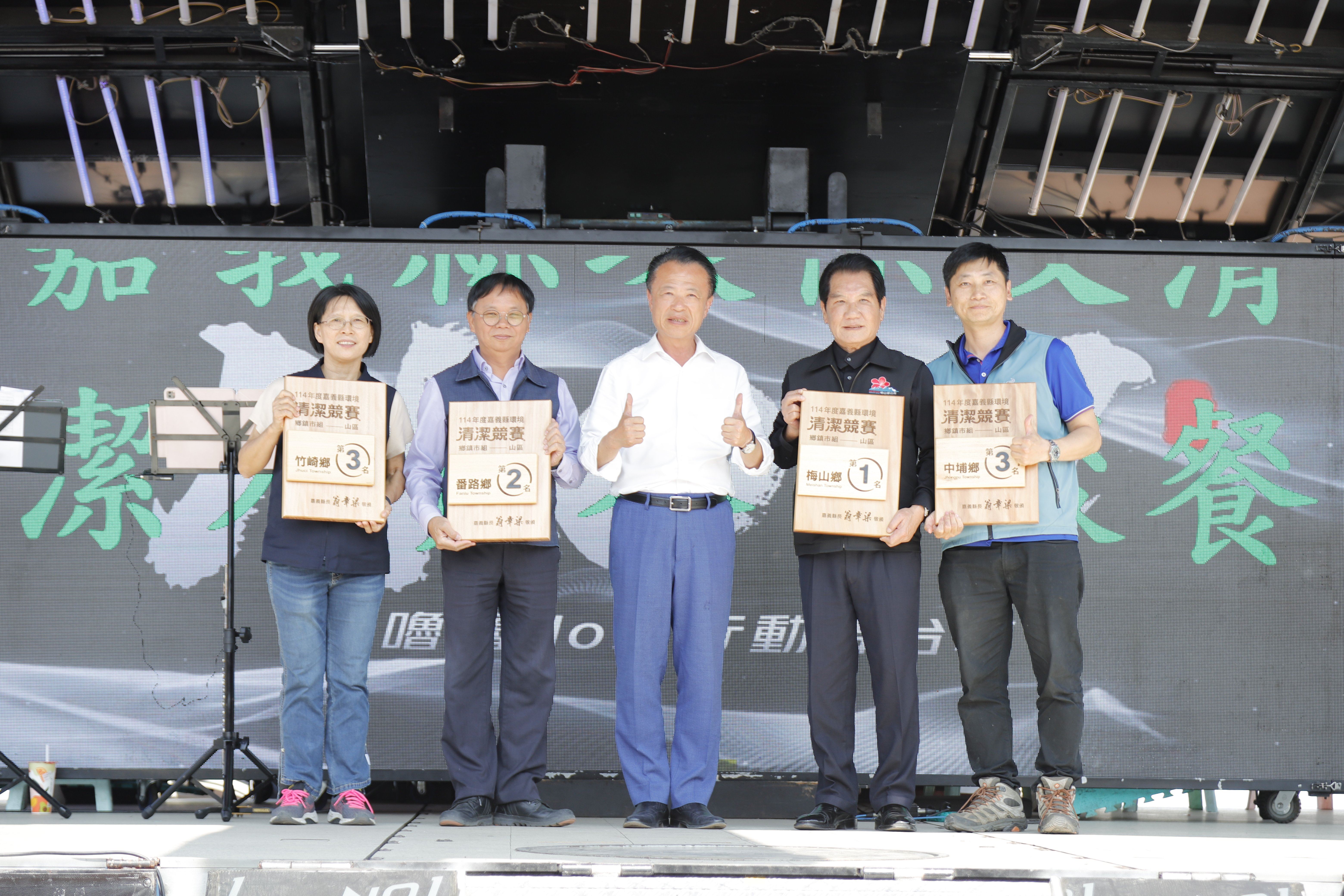 今年競賽成果豐碩,梅山鄉、東石鄉及民雄鄉分別榮獲山區、海區與平地區第一名,獲頒獎金鼓勵;村里組亦有多個社區獲獎,展現地方齊心維護環境整潔的努力成果。