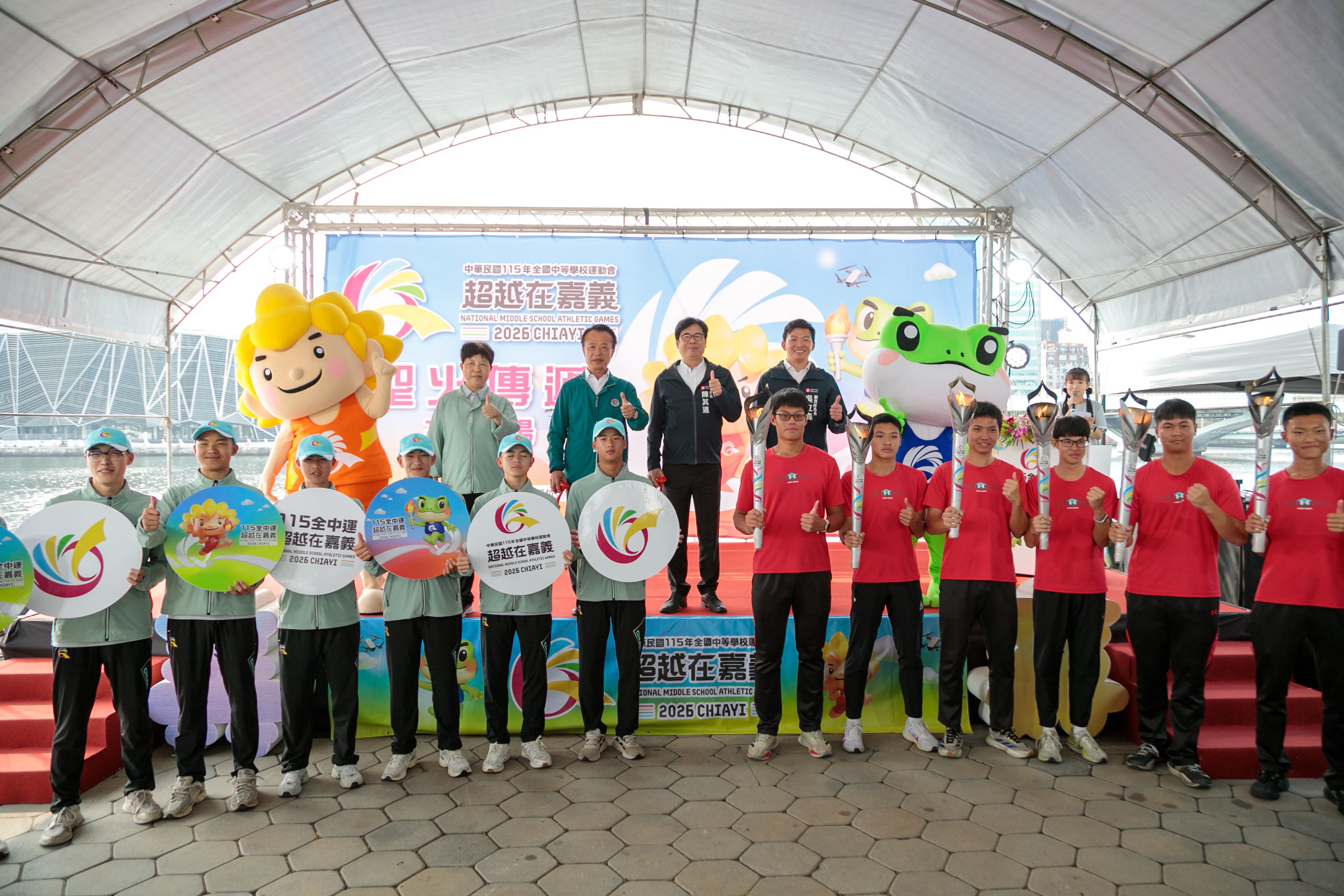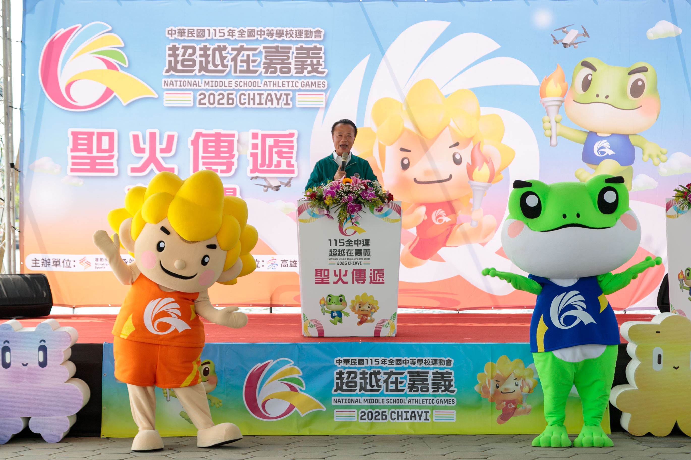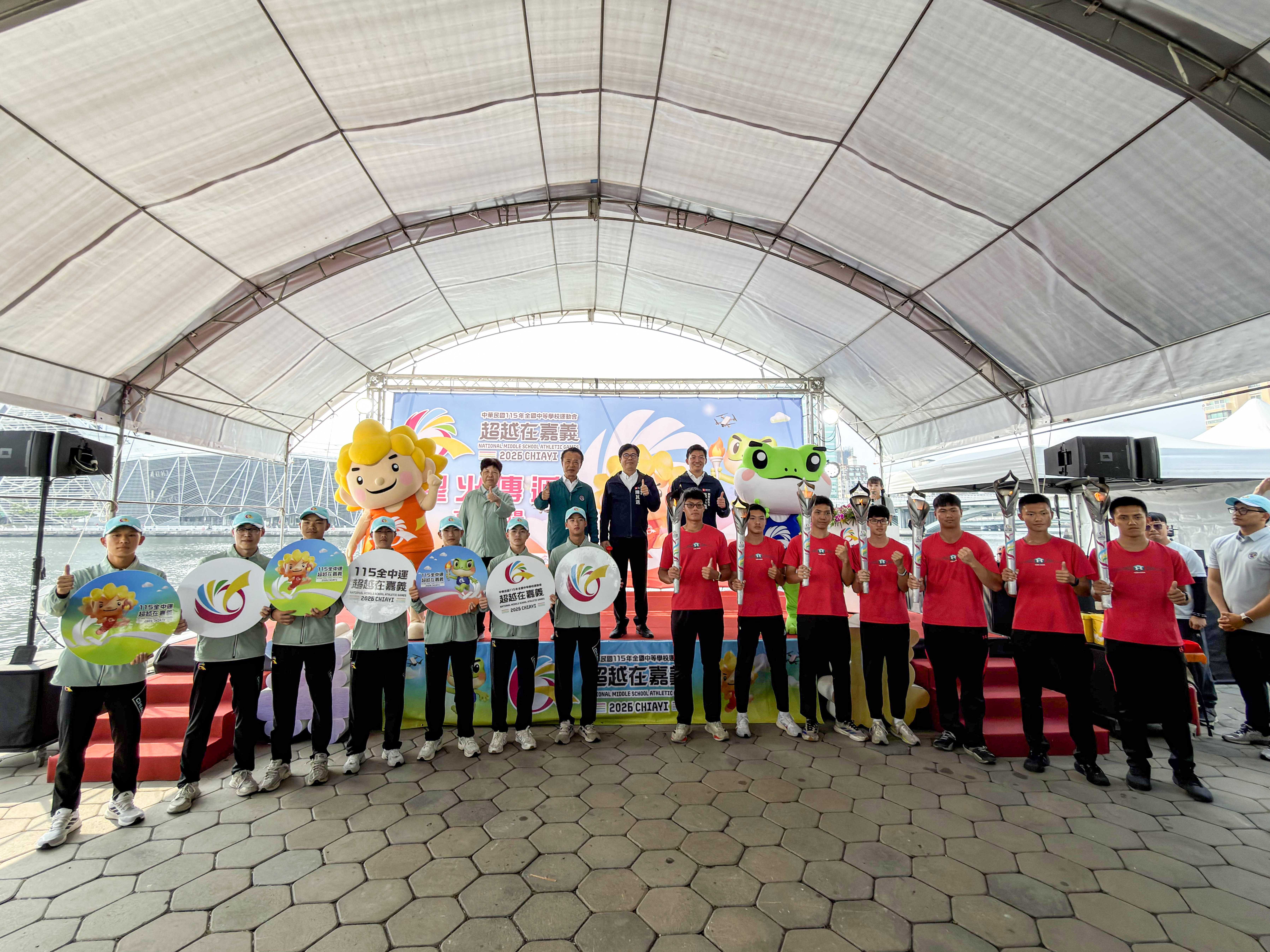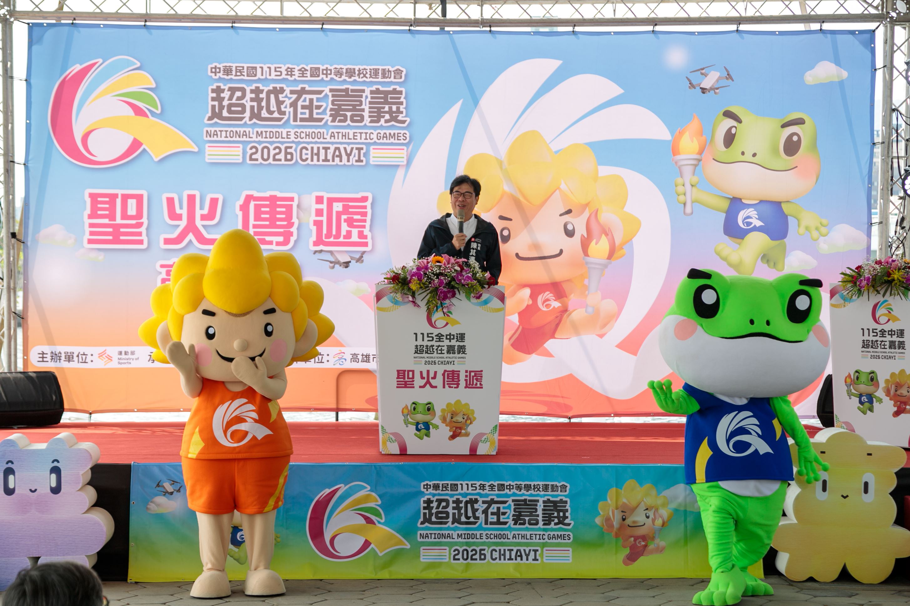 嘉義縣長翁章梁、高雄市長陳其邁率團隊出席造勢,以莊嚴隆重的聖火進場與明火火炬交接儀式為核心,嘉縣、高市各推出一組具代表性的特色表演,蒜頭國小和樹德家商分別帶來街舞表演,吉祥物Q寶、蛙寶亮相接力伴舞,展現城市攜手的合作精神。