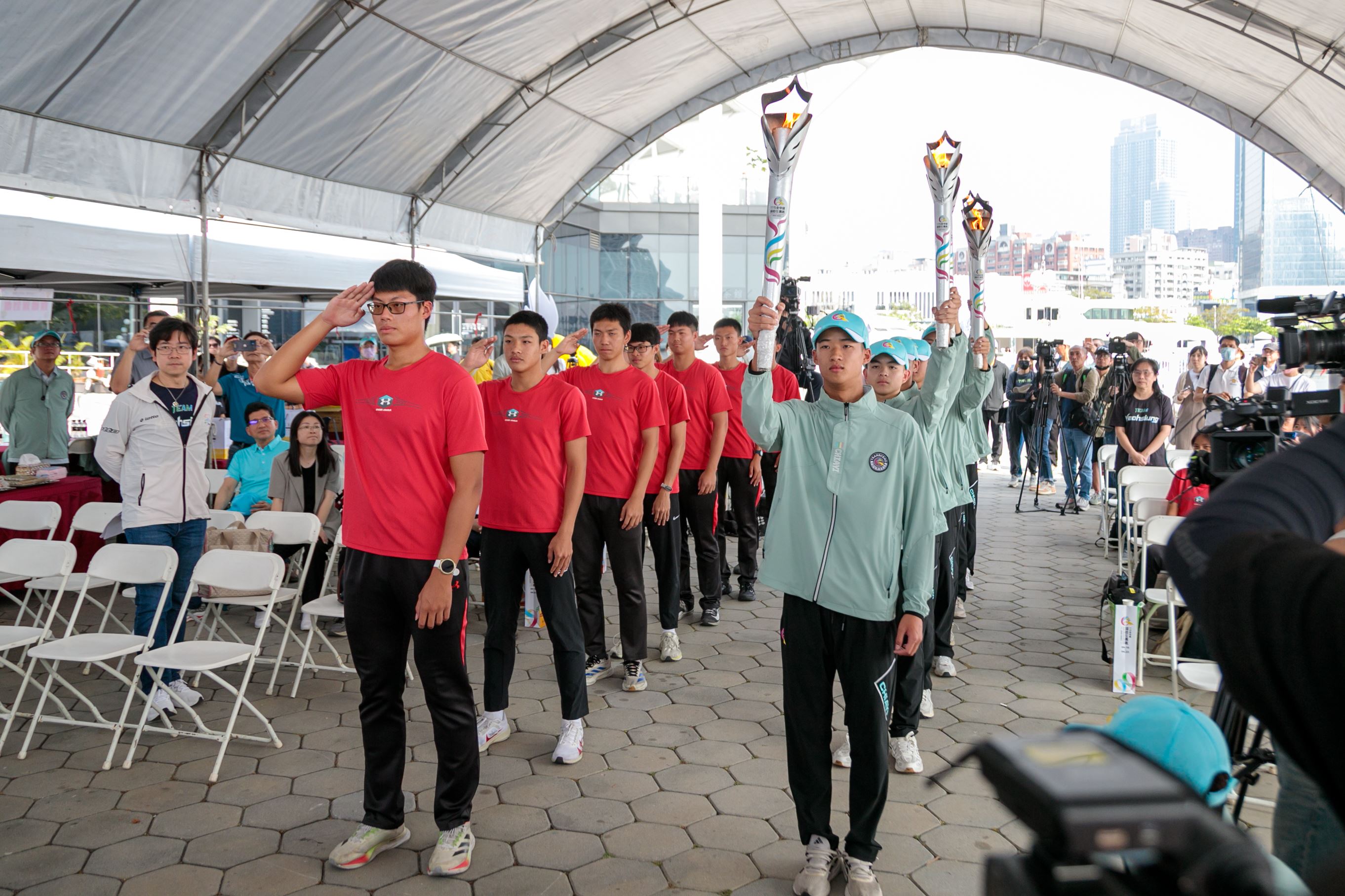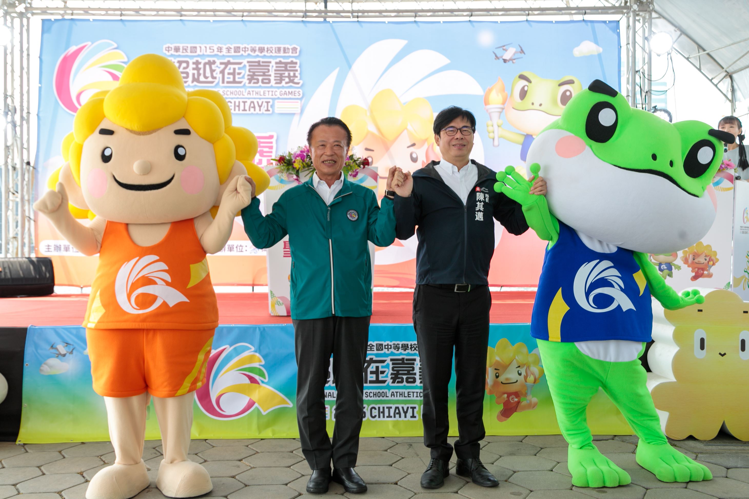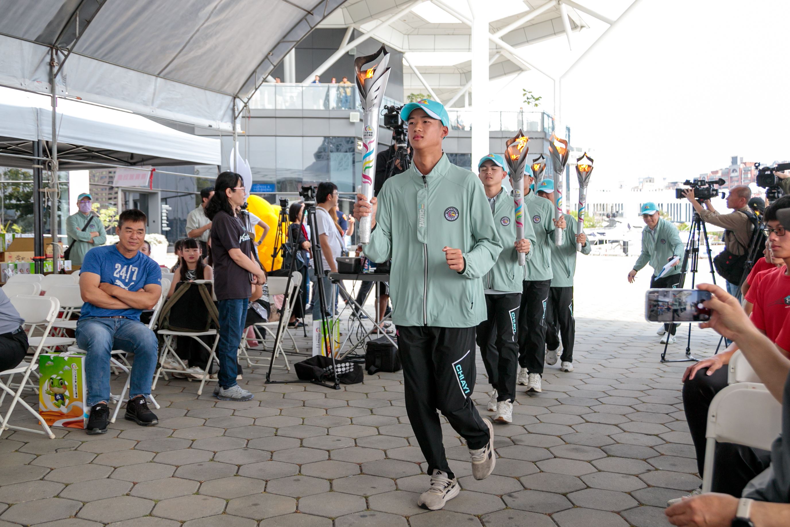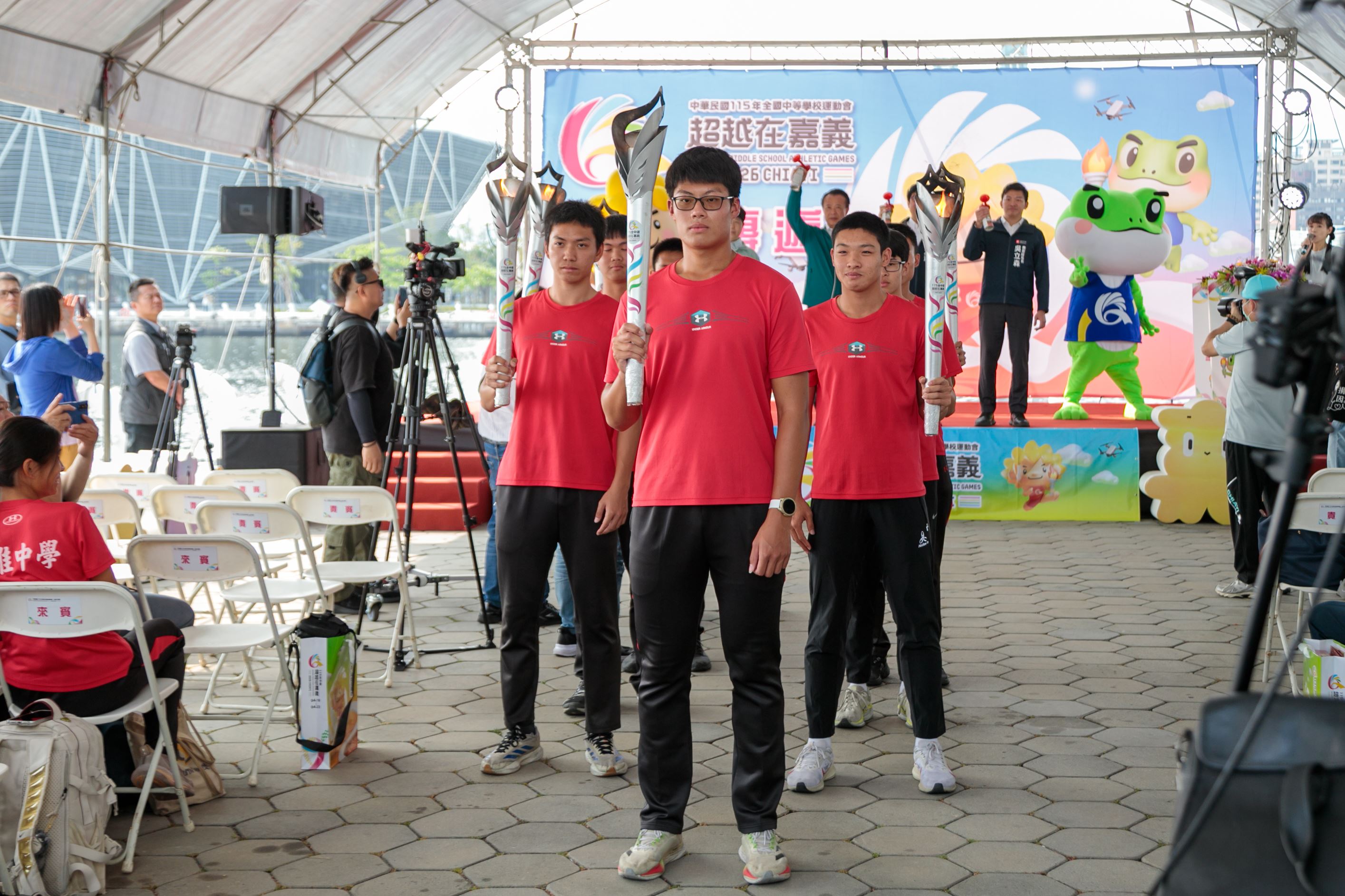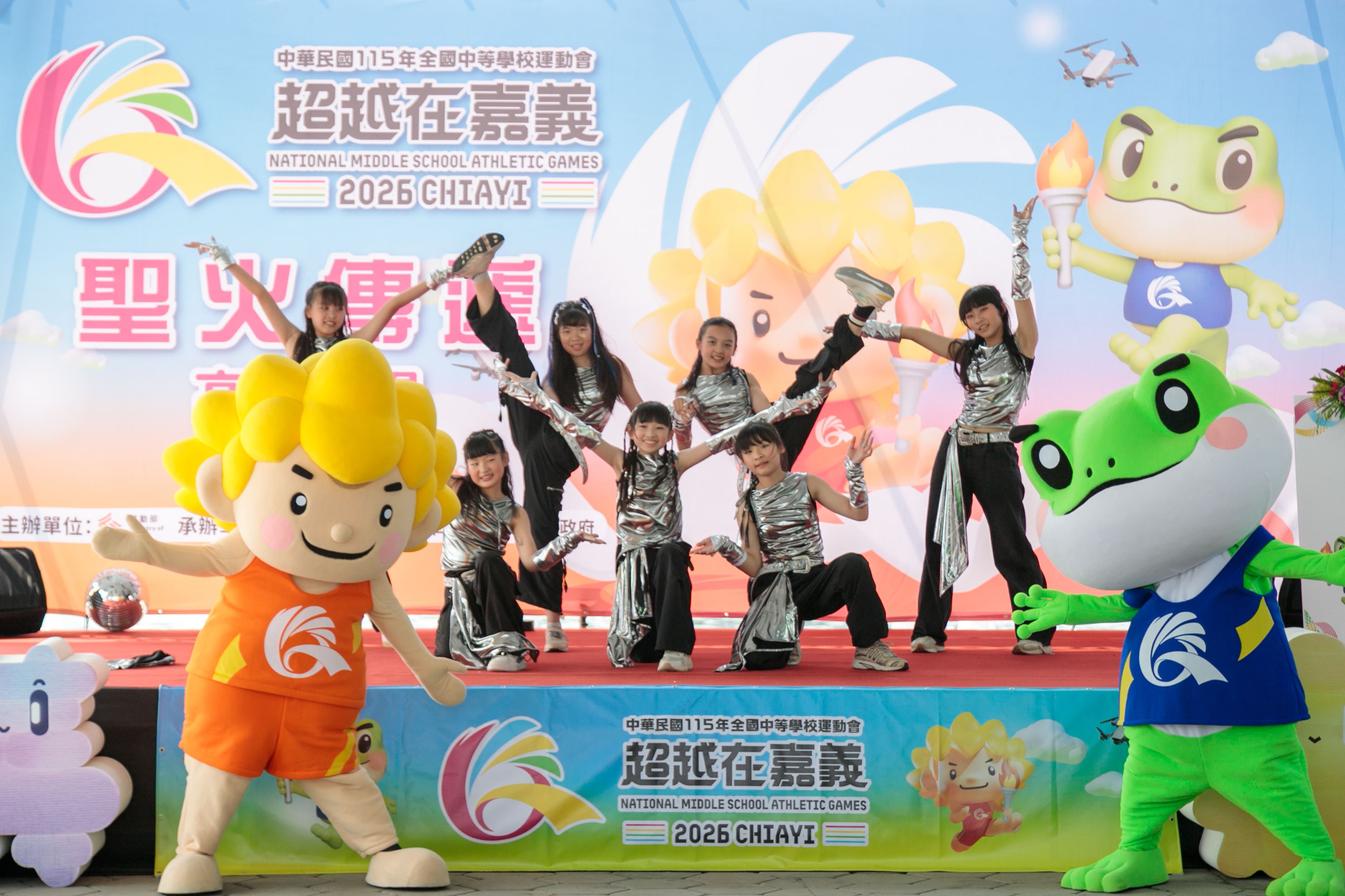 嘉義縣長翁章梁、高雄市長陳其邁率團隊出席造勢,以莊嚴隆重的聖火進場與明火火炬交接儀式為核心,嘉縣、高市各推出一組具代表性的特色表演,蒜頭國小和樹德家商分別帶來街舞表演,吉祥物Q寶、蛙寶亮相接力伴舞,展現城市攜手的合作精神。