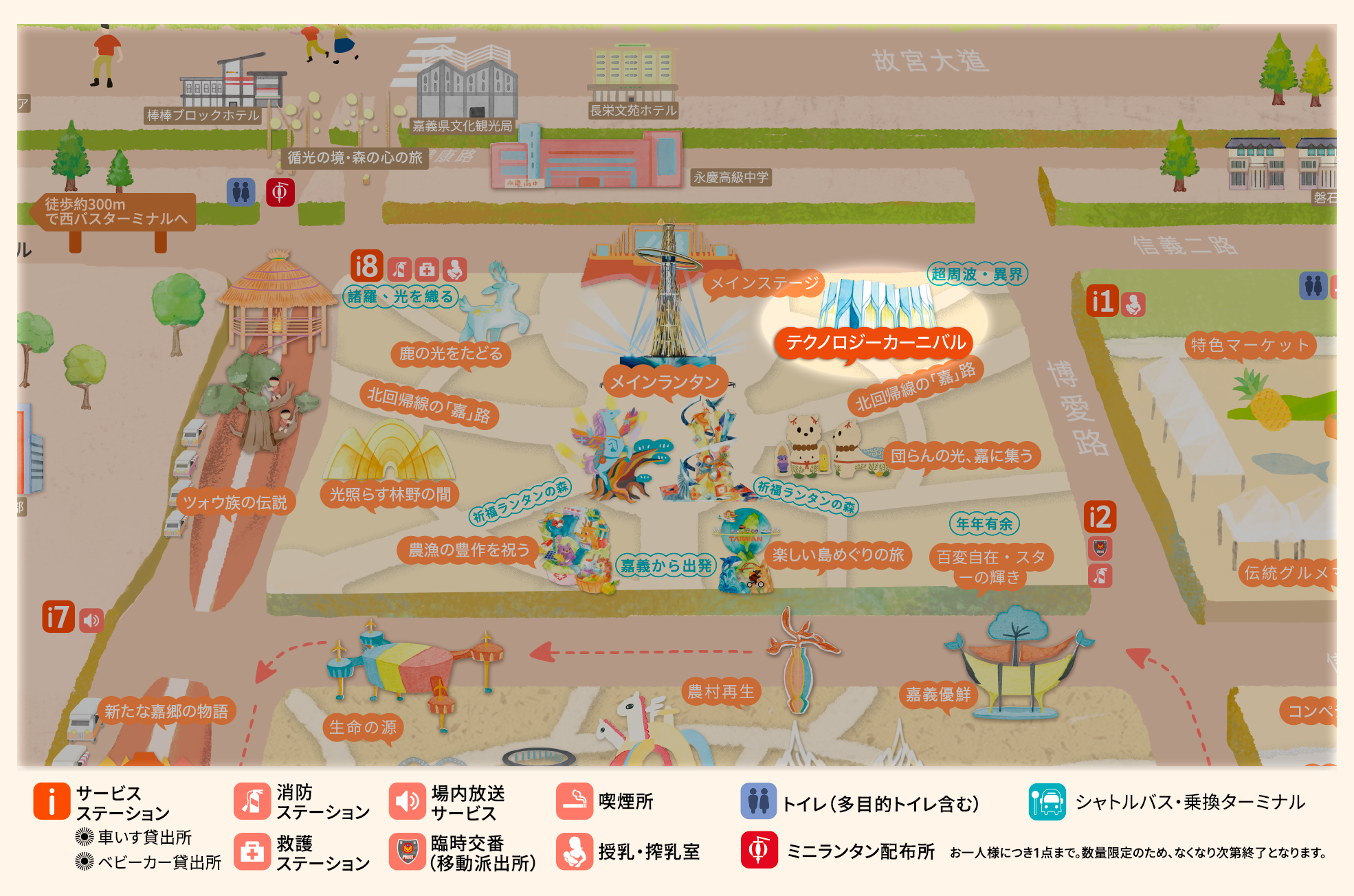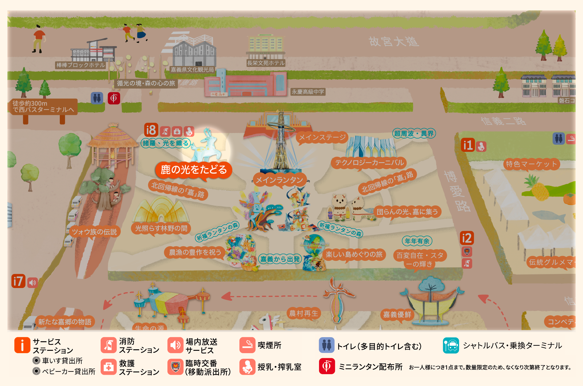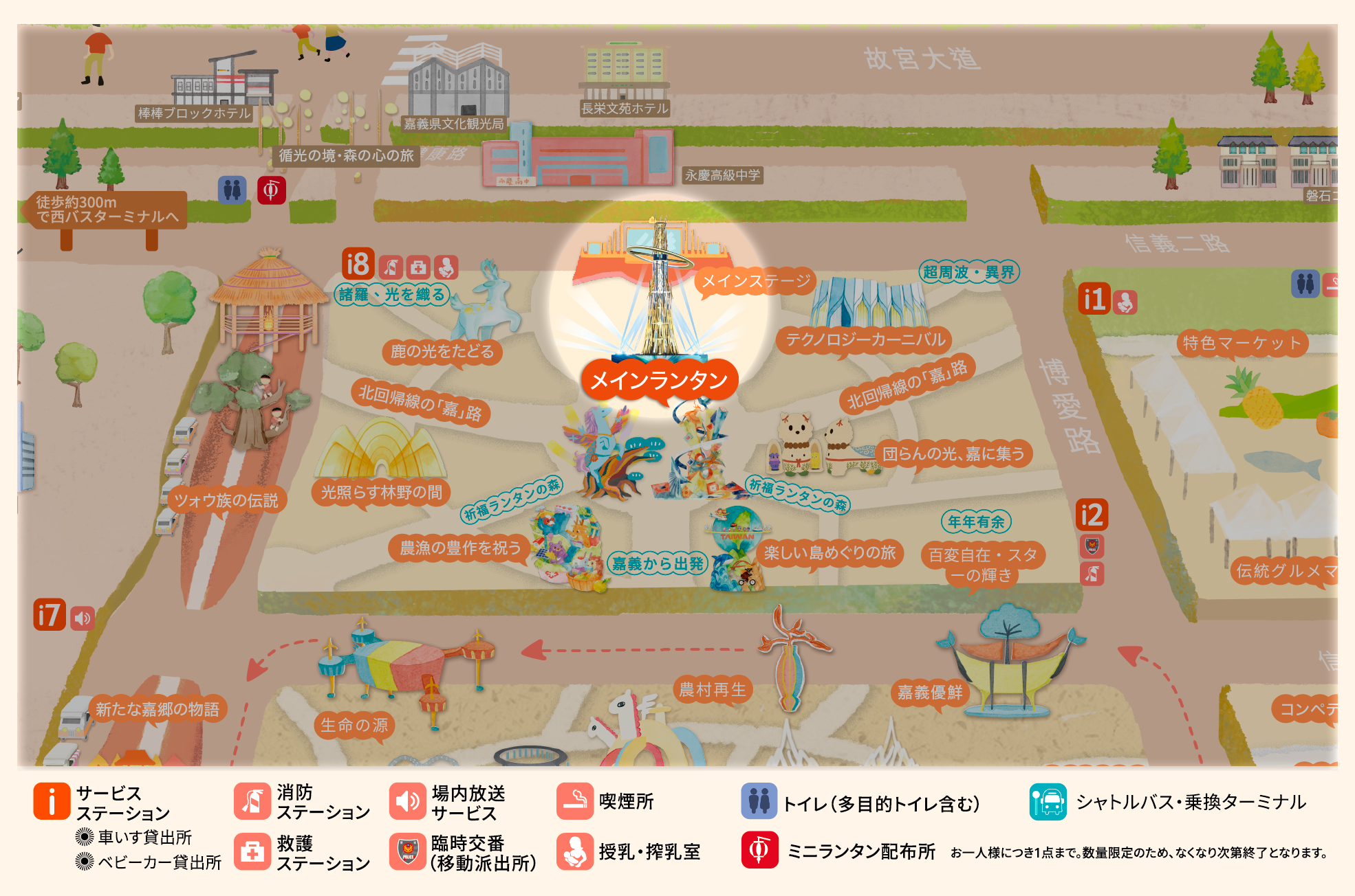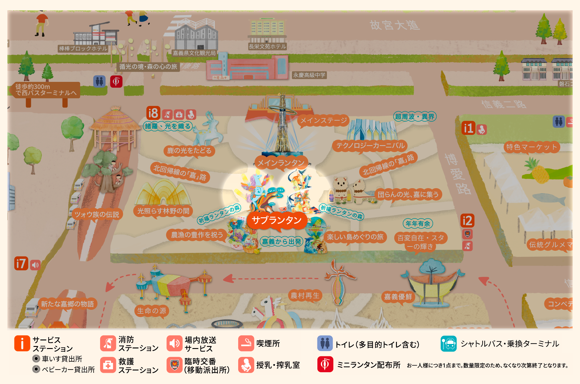 「祈光雲舞・栄慶豊収(光を祈り、雲が舞い、豊収を祝う)」をキュレーションの軸とし、「光躍台湾・点亮嘉義(台湾を照らし、嘉義を輝かせる)」というテーマを展開します。阿里山の自然景観、祈りの文化、そして都市の革新的なエネルギーからインスピレーションを得て、「雲海からの祈り、光で紡ぐ詩」を体現した没入型の光の空間を創り上げました。光の流動、色彩の層、そして律動的なリズムを通じて、メインランタン、祈りのランタン林、そして7つの主要なテーマエリアを繋ぎます。