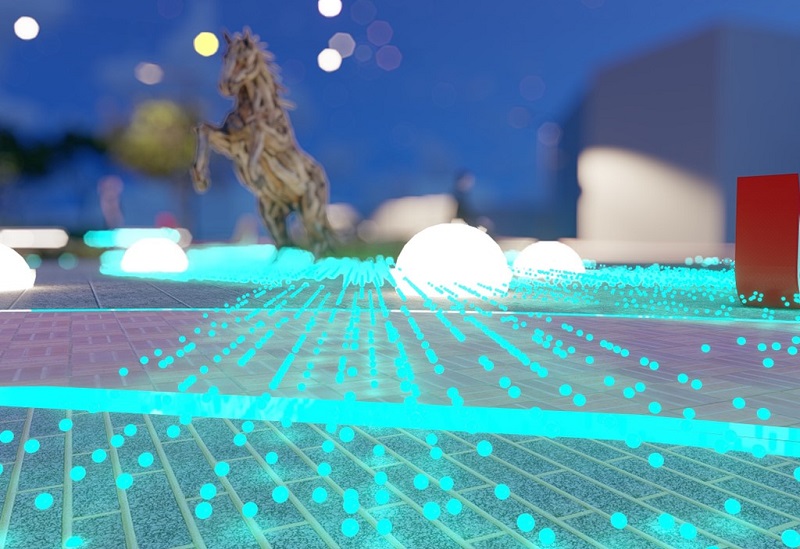 青緑色の光が地面を蛇行しながら進み、台風の軌跡が変化していく様子を象徴するとともに、エリア内の誘導動線を形成します。