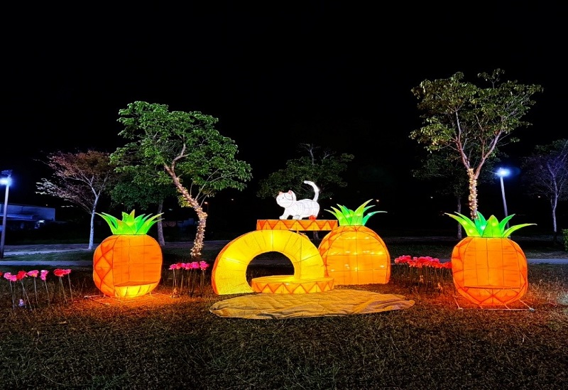 鉄支路公園の遊歩道にある列車をモチーフにした2つのインスタレーションの間には、列車の出発をイメージした「喜びの朴子号」が設置されています。幸せそうな駅長と可愛らしいキャラクターが並び、祭典を歓迎するムードを演出しています。列車が光の軌跡を進むかのように、灯りは遊歩道沿いの木々へと連なり、人々を朴子の新年祝福の旅へといざないます。作品は前進を続ける朴子の活力と希望を象徴し、市民の新年への期待と幸せへの思いを伝えています。夜の風景に溶け込む芸術的なランタン作品の美しさは、新たに朴子市の祭典のランドマークとなったほか、地域観光と夜間経済を活性化させています。