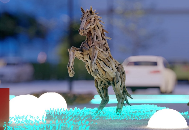 流木と金属構造で造られた風を切り疾走する馬の姿に照明を施し、午年の力強さと被災から前進する生命力を象徴しています。