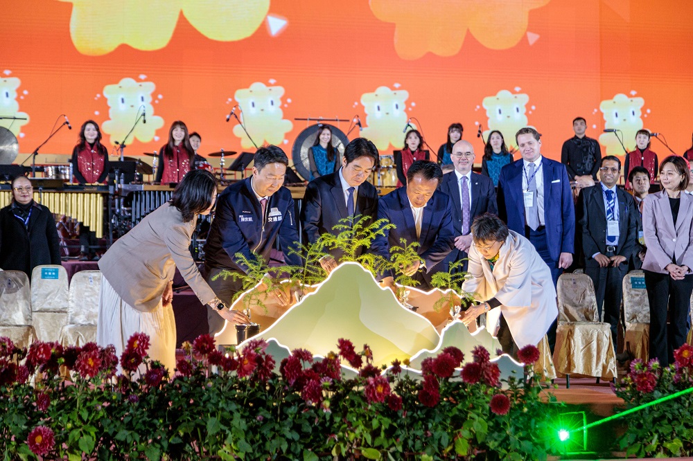 頼清徳総統、翁章梁・嘉義県長、陳世凱・交通部長、劉世芳・内政部長、陳玉秀・観光署長らが「希望の苗木」を植え、主灯 「光沐-世界のアリサン」 を点灯した。