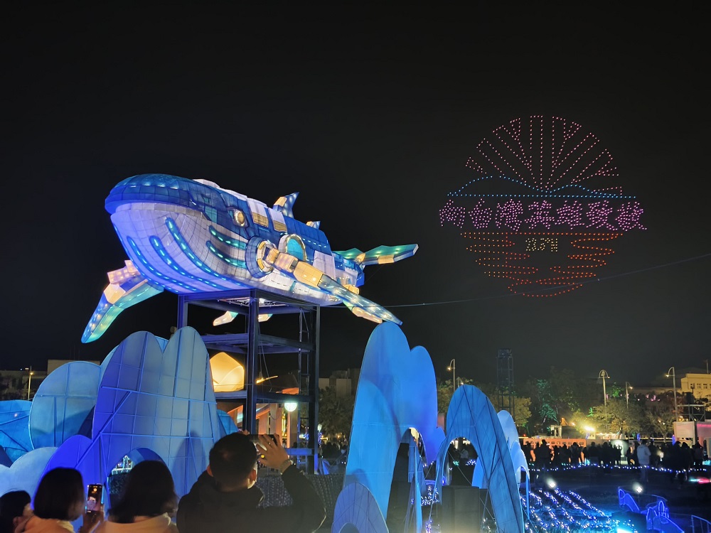 2026台湾ランタンフェスティバル in 嘉義は夜が深まるほど多くの来場者で賑わい、ますます魅力的な光景が広がっています。世界各地から訪れた親子連れの観光客は「持続可能な海ランタンエリア」に足を踏み入れると、「可愛すぎる!」と声を上げています。特にクジラ戦艦の周辺は、ドローンショーの絶好の観覧スポットの一つとなっています。