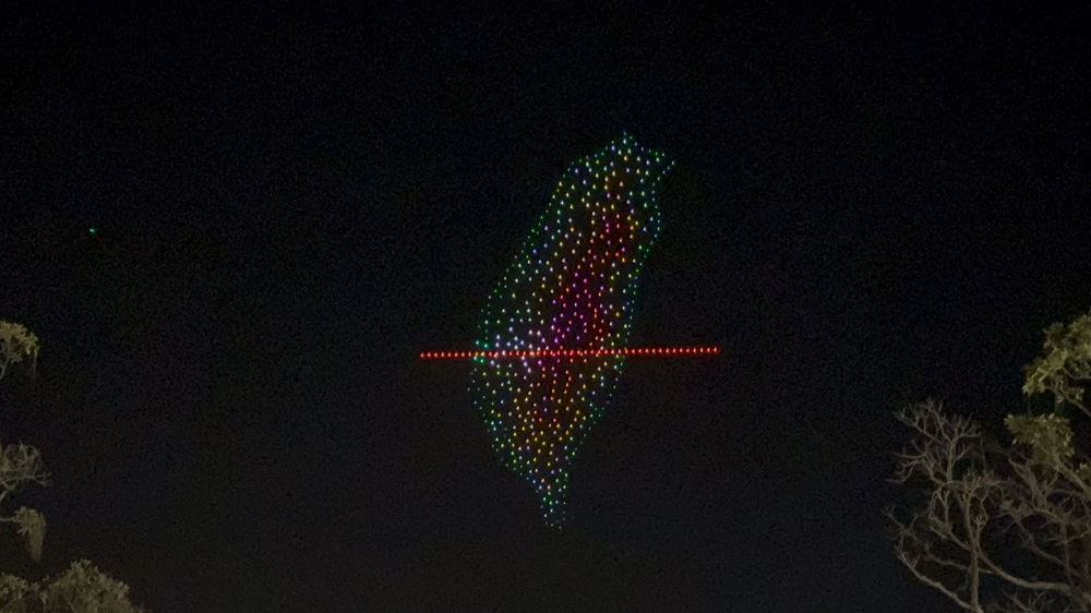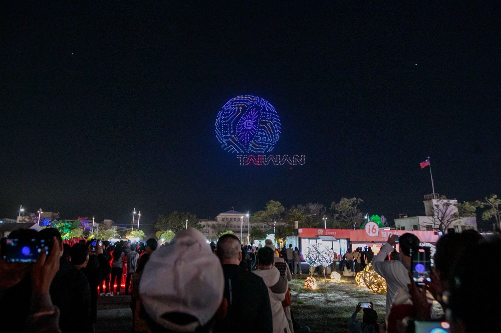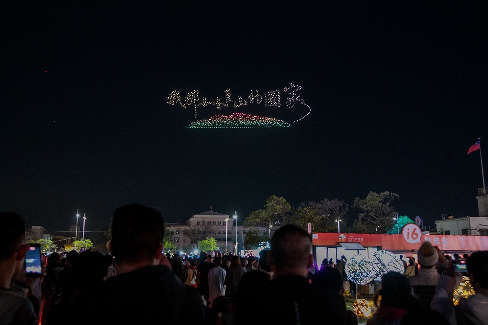 ドローンショーは「阿里山の日の出」で幕を開け、世界的に知られる金色の朝焼けが夜空を照らし、嘉義の希望に満ちたスタートを象徴しました。続いて台湾島の輪郭が描かれ、「小さく多山な私の国」の力強い姿が示され、郷土の誇りが世界へ向かうエネルギーへと昇華されました。